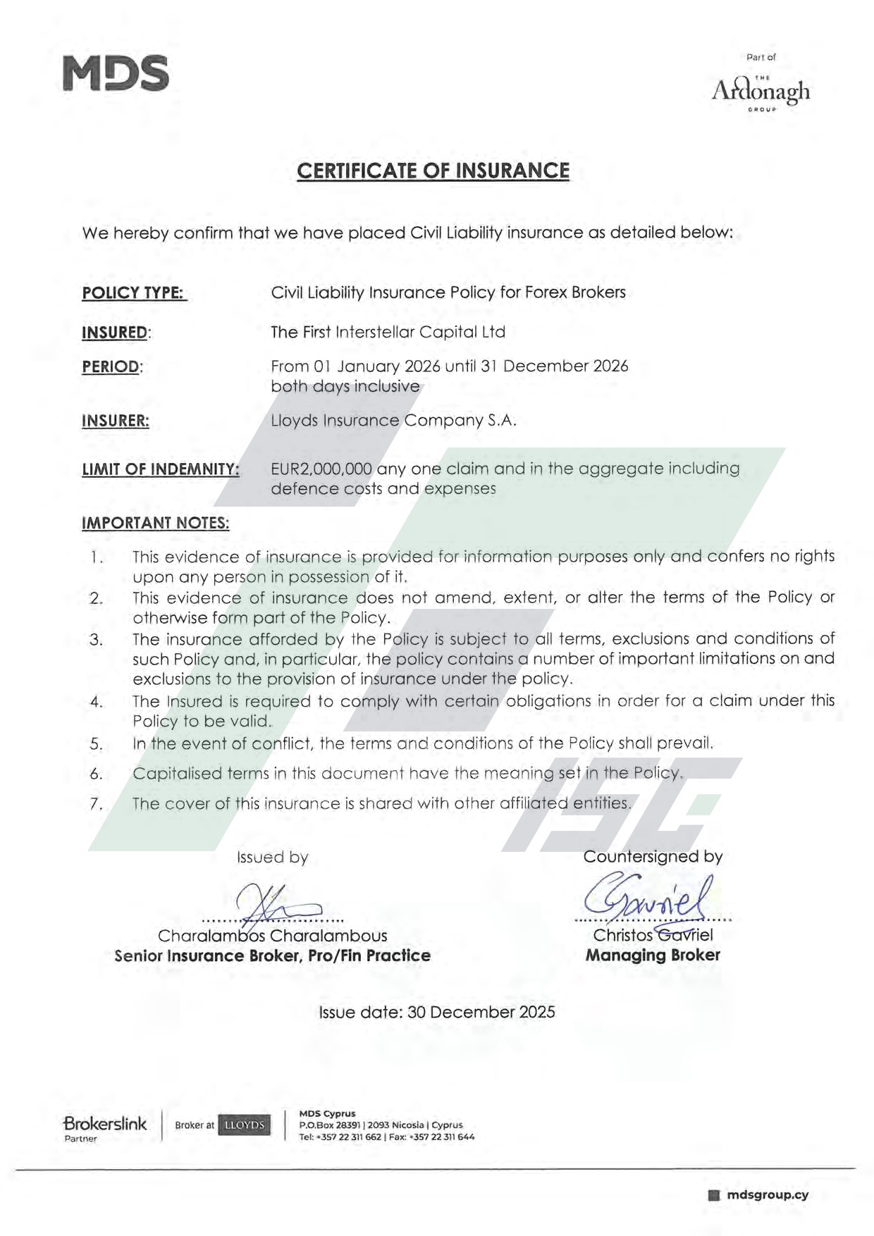 All customers of The First Interstellar Capital Ltd and First Interstellar Global Ltd are within the coverage of the insurance.