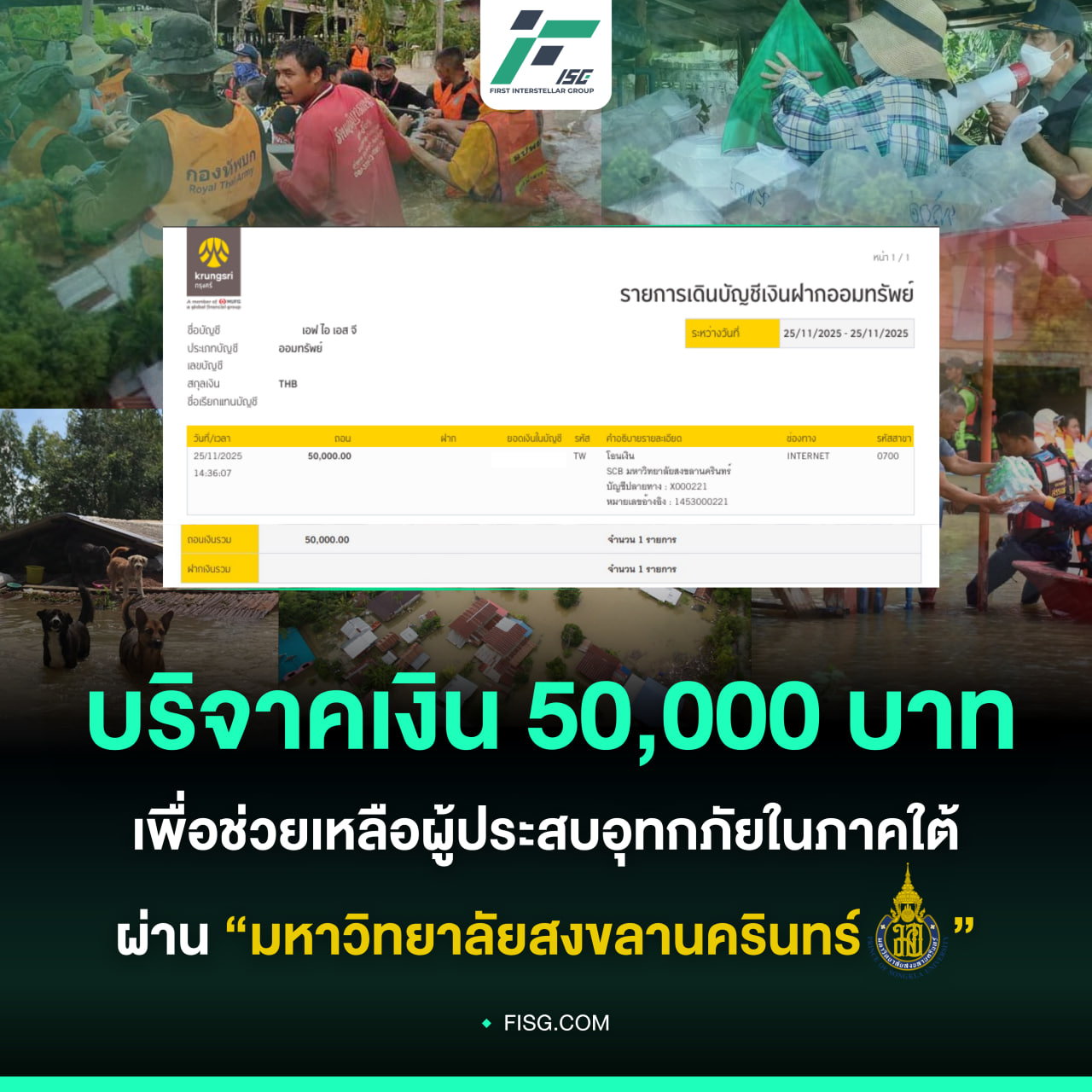 Sharing care and support when it matters most. The floods that affected southern Thailand in November 2025 caused serious challenges for many families, impacting their lives, homes, and daily living. Recognizing the difficulties faced by local communities, FISG stepped in to offer support by donating a total of 130,000 THB through several organizations actively providing urgent relief on the ground. Our thoughts are with everyone affected, and we wish all families safety and strength as they recover. FISG remains committed to supporting social initiatives, because we believe true growth comes from moving forward together with the community.