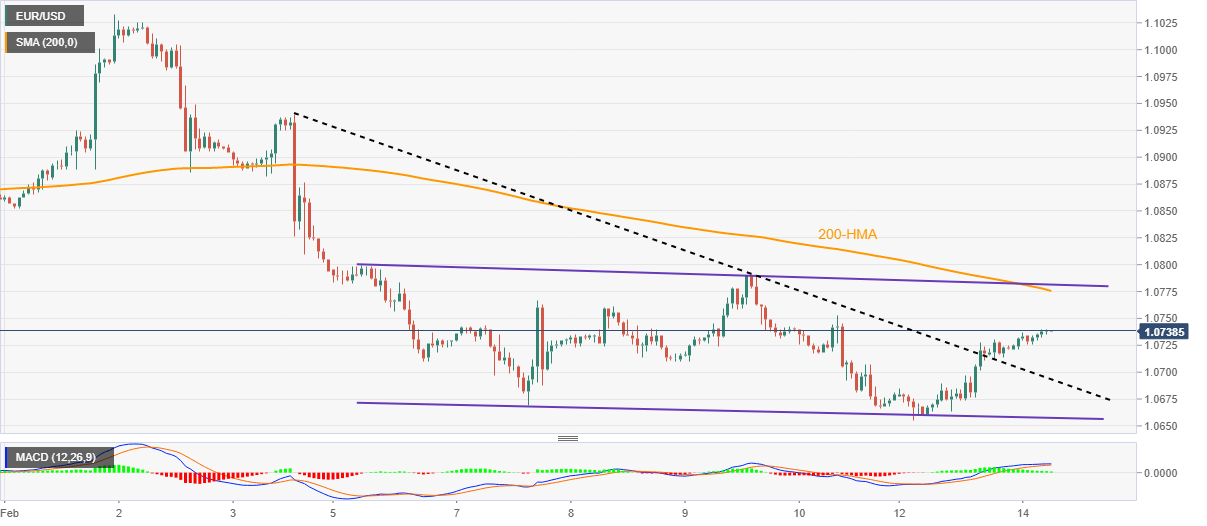 Share: EUR/USD mengambil tawaran beli untuk memperbarui level tertinggi harian, mencetak tren naik dua hari di dalam channel bearish mingguan. Terobosan naik yang jelas dari garis tren turun satu minggu, sinyal MACD bullish mendukung pembeli. Sisi bawah tetap sulit kecuali menembus garis support 1,0660. EUR/USD mempertahankan kenaikan karena pasar bersiap untuk pembacaan awal Produk Domestik Bruto (PDB) Zona Euro kuartal keempat (Q4) dan Indeks Harga Konsumen (IHK) AS untuk bulan Januari pada hari Selasa. Meski begitu, pasangan mata uang utama ini memperbarui level tertinggi harian di dekat 1,0740 pada saat berita ini ditulis. Baca juga: EUR/USD Naik Menuju 1,0770 karena Indeks USD Berjuang untuk Menemukan Support Menjelang IHK AS Kenaikan harga terbaru dapat dikaitkan dengan keberhasilan menembus garis resistensi turun dari 3 Februari, yang saat ini menjadi support di sekitar 1,0700. Yang juga mendukung pembeli EUR/USD adalah sinyal MACD yang bullish. Namun, perlu dicatat bahwa konvergensi Moving Average (MA) 200 Jam bergabung dengan garis teratas dari saluran tren turun selama satu minggu akan menawarkan peluang yang sulit ditembus oleh para pembeli EUR/USD di sekitar 1,0780. Setelah itu, angka bulat 1,0800 dapat bertindak sebagai filter tambahan ke arah utara sebelum mengarahkan pasangan ini menuju puncak bulanan di sekitar 1,1035. Di sisi lain, terobosan yang jelas dari garis resistensi yang berubah menjadi support, mendekati 1,0700, bukanlah sambutan yang terbuka untuk para penjual EUR/USD karena garis bawah channel yang disebutkan di atas bertindak sebagai pertahanan terakhir pembeli pasangan Euro di sekitar 1,0655. Jika pasangan EUR/USD tetap bearish di bawah 1,0655, kemungkinan akan menyaksikan penurunan menuju level terendah Januari di dekat 1,0485 tidak dapat dikesampingkan. EUR/USD: Grafik per Jam Tren: Diharapkan kenaikan lebih lanjut Level Teknis EUR/USD Tinjauan Harga terakhir hari ini 1.0738 Perubahan harian hari ini 0.0015 Perubahan harian hari ini % 0.14 Pembukaan harian hari ini 1.0723 Tren SMA 20 Harian 1.082 SMA 50 Harian 1.0711 SMA 100 Harian 1.0374 SMA 200 Harian 1.0324 Level Tinggi Harian Sebelumnya 1.073 Rendah Harian Sebelumnya 1.0656 Tinggi Mingguan Sebelumnya 1.0799 Rendah Mingguan Sebelumnya 1.0666 Tinggi Bulanan Sebelumnya 1.093 Rendah Bulanan Sebelumnya 1.0483 Fibonacci Harian 38,2% 1.0702 Fibonacci Harian 61,8% 1.0684 Pivot Point Harian S1 1.0676 Pivot Point Harian S2 1.0628 Pivot Point Harian S3 1.0601 Pivot Point Harian R1 1.075 Pivot Point Harian R2 1.0777 Pivot Point Harian R3 1.0825 Share: Feed news
