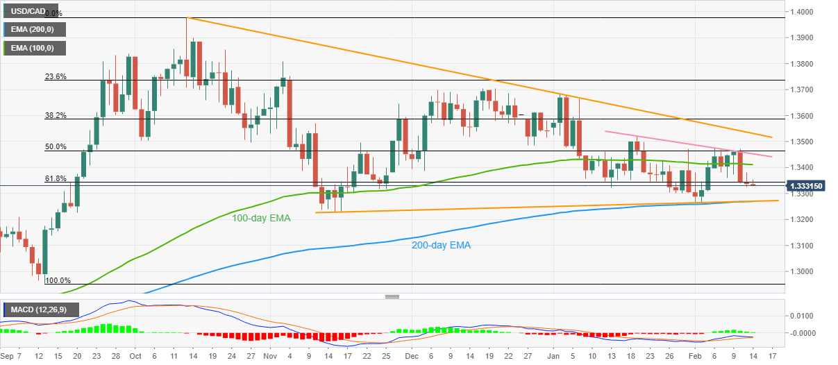 Share: USD/CAD bertahan di level terendah mingguan, tertekan setelah tren turun selama dua hari. Terobosan sisi bawah yang jelas pada EMA utama, Fibonacci retracement bergabung dengan bear cross yang menjulang pada MACD akan memikat para penjual. Garis resistensi bulanan, garis tren menurun dari bulan Oktober menantang pembeli pasangan mata uang ini. USD/CAD tetap tertekan di sekitar 1,3330 bahkan saat para pembeli dan penjual berdesakan selama awal hari Selasa, karena kelambanan pasar menjelang data inflasi utama AS. Dengan demikian, pasangan USD/CAD menguji penurunan beruntun selama dua hari di level terendah dalam lebih dari satu minggu. Perlu dicatat bahwa penembusan turun berkelanjutan dari Exponential Moving Average (EMA) 100-hari dan level Fibonacci retracement 61,8% dari kenaikan September-Oktober bergabung dengan bear cross yang membayangi pada MACD akan membuat para penjual USD/CAD tetap memiliki harapan. Hasilnya, konvergensi garis tren naik dari pertengahan November dan EMA 200 hari, sekitar 1,3270 pada saat berita ini ditulis, menjadi perhatian utama. Jika pasangan ini menawarkan terobosan turun yang jelas dari level kunci 1,3270, level terendah November lalu di dekat 1,3225 dapat bertindak sebagai titik validasi untuk penurunan yang menargetkan level terendah September 2022 di sekitar 1,2955. Perlu diperhatikan bahwa angka bulat 1,3100 dan 1,3000 dapat bertindak sebagai titik perhentian perantara selama penurunan yang diantisipasi. Sementara itu, level Fibonacci retracement utama yang disebutkan, juga dikenal sebagai rasio emas, menjaga pemulihan USD/CAD segera di dekat 1,3345, jika ditembus menyoroti level EMA 100 hari di 1,3410. Setelah itu, garis resistensi turun dari 19 Januari dan garis tren turun empat bulan, masing-masing di sekitar 1,3455 dan 1,3530, dapat menantang para pembeli USD/CAD. USD/CAD: Grafik Harian Tren: Diharapkan penurunan lebih lanjut Level Teknis USD/CAD Tinjauan Harga terakhir hari ini 1.3333 Perubahan harian hari ini -0.0003 Perubahan harian hari ini % -0.02 Pembukaan harian hari ini 1.3336 Tren SMA 20 Harian 1.3382 SMA 50 Harian 1.3487 SMA 100 Harian 1.3529 SMA 200 Harian 1.3238 Level Tinggi Harian Sebelumnya 1.338 Rendah Harian Sebelumnya 1.3325 Tinggi Mingguan Sebelumnya 1.3476 Rendah Mingguan Sebelumnya 1.3338 Tinggi Bulanan Sebelumnya 1.3685 Rendah Bulanan Sebelumnya 1.33 Fibonacci Harian 38,2% 1.3346 Fibonacci Harian 61,8% 1.3359 Pivot Point Harian S1 1.3314 Pivot Point Harian S2 1.3292 Pivot Point Harian S3 1.3259 Pivot Point Harian R1 1.3369 Pivot Point Harian R2 1.3402 Pivot Point Harian R3 1.3424 Share: Feed news