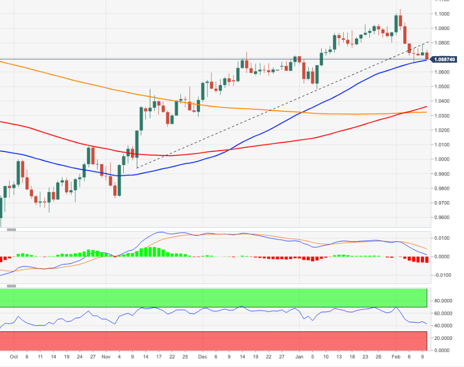 Share: EUR/USD melanjutkan penurunan setelah kenaikan yang layak pada hari Kamis. Penurunan yang lebih dalam bisa menguji kembali terendah bulanan di dekat 1,06700 EUR/USD mempertahankan tema kisaran mingguan tidak berubah dan sekarang menembus di bawah support utama 1,0700 pada hari Jumat. Jika penurunan menambah dorongan ekstra, maka pasangan mata uang ini dapat dengan cepat menantang terendah Februari sejauh ini di 1,0669 (7 Februari). Penembusan level tersebut dapat membuka jalan untuk kemunduran lebih lanjut ke terendah 2023 di 1,0481 (6 Januari). Dalam jangka lebih panjang, pandangan konstruktif tetap tidak berubah ketika di atas SMA 200-hari, hari ini di 1,0321. Grafik Harian EUR/USD level-level teknis EUR/USD Tinjauan Harga terakhir hari ini 1.069 Perubahan harian hari ini -0.0044 Perubahan harian hari ini % -0.41 Pembukaan harian hari ini 1.0734 Tren SMA 20 Harian 1.0833 SMA 50 Harian 1.0703 SMA 100 Harian 1.0353 SMA 200 Harian 1.0323 Level Tinggi Harian Sebelumnya 1.0791 Rendah Harian Sebelumnya 1.071 Tinggi Mingguan Sebelumnya 1.1033 Rendah Mingguan Sebelumnya 1.0793 Tinggi Bulanan Sebelumnya 1.093 Rendah Bulanan Sebelumnya 1.0483 Fibonacci Harian 38,2% 1.076 Fibonacci Harian 61,8% 1.0741 Pivot Point Harian S1 1.0699 Pivot Point Harian S2 1.0664 Pivot Point Harian S3 1.0618 Pivot Point Harian R1 1.078 Pivot Point Harian R2 1.0826 Pivot Point Harian R3 1.0861 Share: Feed news