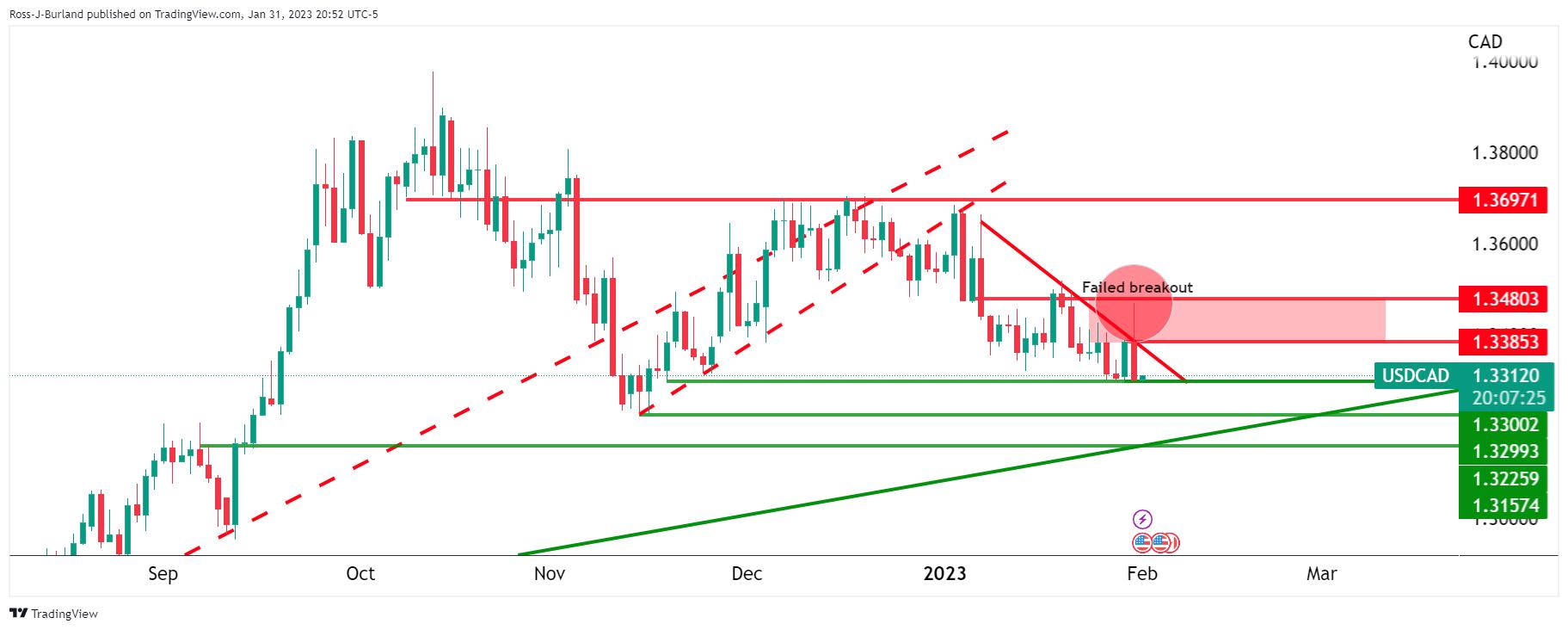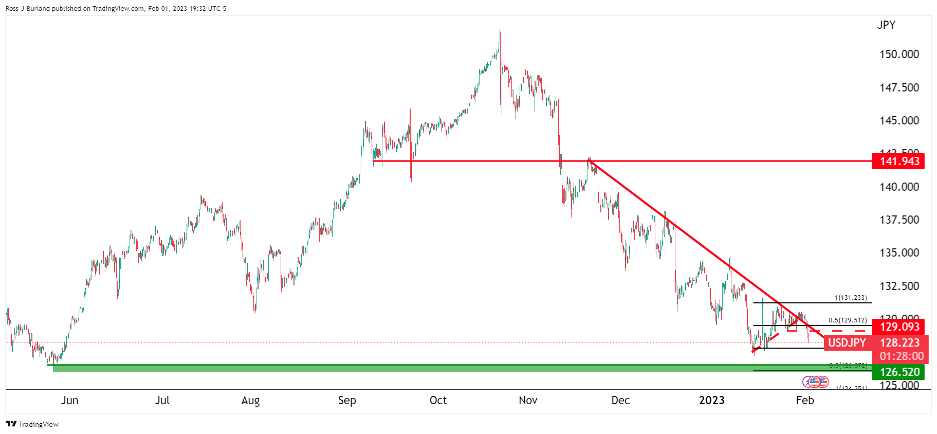 Sentimen Federal Reserve telah membuat Yen menguat karena pelemahan Dolar AS. Para penjual USD/JPY mengambil kendali dan mengincar 127,50-an. Penembusan 129,50 membuka risiko pergerakan ke 130,00 dan seterusnya. USD/JPY dalam tawaran jual sekitar 0,5% dan telah jatuh dari level tertinggi 128,95 ke level terendah 128,17 di sesi Asia sejauh ini. Penurunan ini terjadi setelah Federal Reserve menaikkan suku bunga untuk kedelapan kalinya dalam satu tahun, namun memperlambat lajunya menjadi seperempat poin. Akibatnya, Dolar AS jatuh dan menguat pada sisi negatifnya karena kecenderungan dovish Federal Reserve, meskipun inflasi "berjalan sangat panas". Ketua The Fed Jerome Powell menyerah dengan beberapa komentar dovish seperti, "Kami sekarang dapat mengatakan untuk pertama kalinya bahwa proses disinflasi telah dimulai". Komentar-Komentar Penting Jerome Powell "Kami sekarang dapat mengatakan untuk pertama kalinya bahwa proses disinflasi telah dimulai". Pidato Powell: Sangat sulit untuk mengelola risiko dengan menaikkan suku bunga terlalu rendah Pidato Powell: Proses disinflasi masih dalam tahap awal Pidato Powell: Sejarah memperingatkan agar tidak melonggarkan kebijakan secara prematur Pidato Powell: Ekspektasi inflasi jangka panjang yang tertanam dengan baik bukan alasan untuk berpuas diri Pidato Powell: Kemungkinan harus mempertahankan sikap ketat untuk beberapa waktu Pidato Powell: Sangat sulit untuk mengelola risiko dengan menaikkan suku bunga terlalu rendah Pidato Powell: Para pengambil kebijakan tidak melihat ini sebagai waktu untuk berhenti sejenak Pidato Powell: Tidak akan tepat untuk memangkas suku bunga tahun ini menurut pandangan kami saat ini Retorika ini tidak akan membantu USD dan membantu memberikan dasar yang cukup penting di bawah pasar ekuitas, mendukung risiko dan mendorong Yen lebih tinggi. "USD bergerak berlebihan karena sejumlah faktor, tetapi katalis untuk membalikkannya lebih sulit diperoleh daripada sebelum pertemuan ini," kata para analis di TD Securities. "Meskipun risiko akselerasi kembali (dalam pertumbuhan/inflasi) mungkin akan meningkat di akhir tahun ini dalam sebuah hasil soft landing, pasar kemungkinan akan mendorong pelemahan USD lebih lanjut untuk saat ini." Sementara itu, perlu dicatat bahwa posisi jual bersih JPY yang turun berada di level terendah sejak Maret 202 seperti yang diakui oleh para analis di Rabobank. "Meskipun para spekulan kecewa karena tidak ada perubahan pada kebijakan Yield Curve Control Bank of Japan (BoJ) pada pertemuan bulan Januari, mereka mengalihkan perhatian ke pertemuan kebijakan BoJ berikutnya di bulan Maret." Namun, dengan posisi beli Dolar AS yang telah dilepas, para spekulan lebih berisiko terhadap hasil positif dari Nonfarm Payrolls pekan ini. Analisis Teknikal USD/JPY Seperti yang diilustrasikan pada grafik 4 jam, harga berada di bawah resistance garis tren dan bias lebih rendah setelah menembus struktur geometris. Para penjual memegang kendali namun bertemu dengan struktur support di dekat 128,30. Jika ada koreksi bullish dan pengujian ulang area 129 dalam Fibonacci 38,2%, maka jika para penjual bergerak masuk, fokusnya akan berada di 127,50.