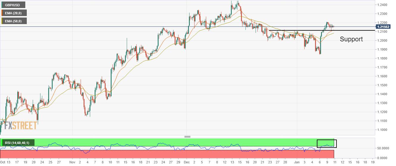 Profil risiko tampak positif yang dipimpin oleh kelanjutan pergerakan naik di S&P500. Indeks USD diprakirakan akan mengalami perdagangan rangebound menjelang data inflasi AS. Cable telah mengambil kekuatan setelah turun ke dekat support level bulat di sekitar 1,2100. Pasangan GBP/USD telah mengambil permintaan setelah turun ke dekat 1,2140 di sesi Asia. Cable mencoba untuk keluar dari kesulitan tetapi mungkin pertama-tama mendekati 1,2200 untuk mendapatkan kembali kekuatannya. Selera risiko para pelaku pasar semakin membaik karena kontrak berjangka S&P500 telah meneruskan kenaikan hari Selasa di awal Tokyo. Sementara itu, imbal hasil obligasi 10-tahun pemerintah AS menghadapi tekanan kecil dan telah turun ke 3,61%, menggambarkan pemulihan dalam tema selera risiko. Indeks Dolar AS (DXY) diprakirakan akan melanjutkan kinerjanya yang lesu hingga rilis data Indeks Harga Konsumen (IHk) Amerika Serikat. Pada skala empat jam, Cable telah mengambil kekuatan setelah turun mendekati support horizontal yang diplot dari level tertinggi 27 Desember di sekitar 1,2100. Koreksi pada Cable tampak sehat di tengah tidak adanya kenaikan yang lebih luas, yang mengakibatkan dimulainya kembali perjalanan naik ke depan. Bull cross, yang diwakili oleh Exponential Moving Averages (EMA) periode 20 dan 50 di 1,2040, menambah penghalang ke sisi atas. Sementara itu, Relative Strength Index (RSI) (14) sedang berusaha keras untuk bertahan dalam kisaran bullish 60.00-80.00, yang akan memicu momentum bullish. Jika aset tersebut menembus di atas level tertinggi hari Kamis di 1.2210, para pembeli Pound Sterling akan mendorong Cable menuju level tertinggi 5 Desember di 1.2344 diikuti oleh level tertinggi 14 Desember di 1.2446. Sebaliknya, penurunan di bawah level hari Kamis di 1,1873 akan menyeret mata uang utama ini menuju level terendah 21 November di sekitar 1,1778. Penembusan ke sisi bawah level yang terakhir tersebut akan mengekspos Cable untuk mengalami lebih banyak penurunan menuju support level angka bulat di 1,1700. Grafik Empat Jam GBP/USD Level-Level Teknis GBP/USD Tinjauan Harga terakhir hari ini 1.2147 Perubahan harian hari ini -0.0005 Perubahan harian hari ini % -0.04 Pembukaan harian hari ini 1.2152 Tren SMA 20 Harian 1.2096 SMA 50 Harian 1.1984 SMA 100 Harian 1.1676 SMA 200 Harian 1.201 Level Tinggi Harian Sebelumnya 1.2199 Rendah Harian Sebelumnya 1.211 Tinggi Mingguan Sebelumnya 1.2102 Rendah Mingguan Sebelumnya 1.1841 Tinggi Bulanan Sebelumnya 1.2447 Rendah Bulanan Sebelumnya 1.1992 Fibonacci Harian 38,2% 1.2144 Fibonacci Harian 61,8% 1.2165 Pivot Point Harian S1 1.2108 Pivot Point Harian S2 1.2065 Pivot Point Harian S3 1.202 Pivot Point Harian R1 1.2197 Pivot Point Harian R2 1.2242 Pivot Point Harian R3 1.2285