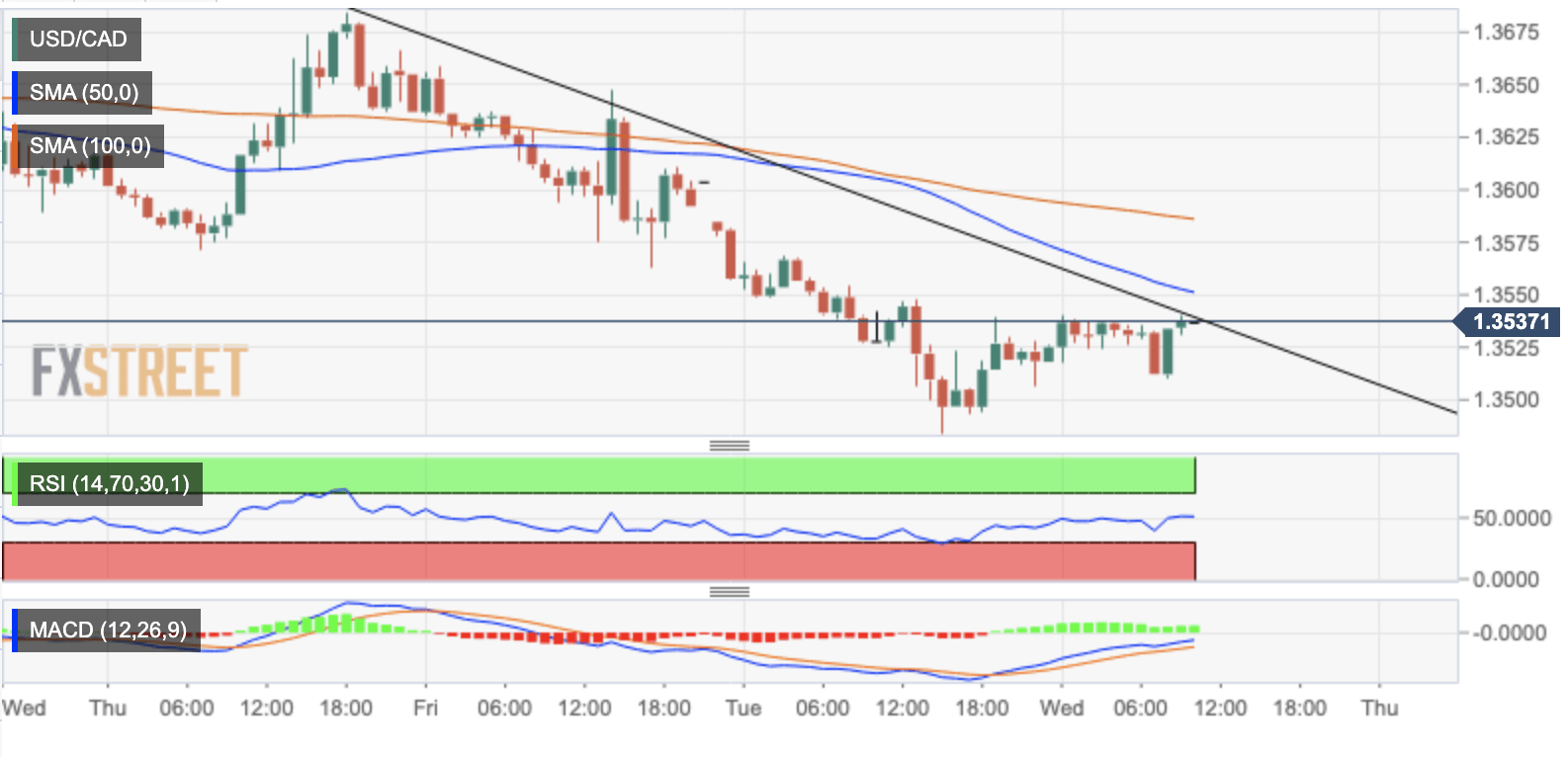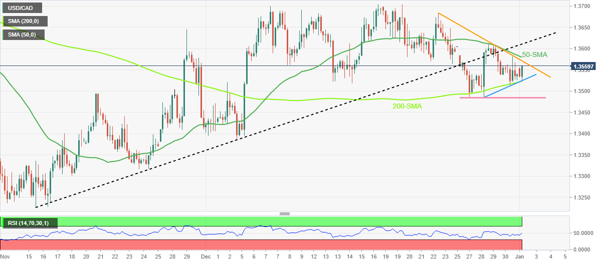 USD/CAD berbalik dari terendah perdagangan harian,membatasi penurunan harian sebelumnya. Konvergensi SMA-200,garis tren naik tiga hari membatasi sisi bawah...