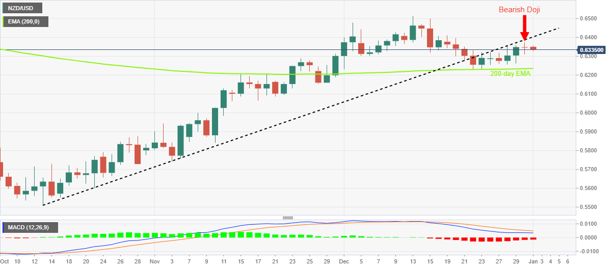 NZD/USD mencetak penurunan ringan di sekitar tertinggi dua minggu, membenarkan formasi candlestick bearish hari sebelumnya. Garis support sebelumnya dari bulan Oktober, sinyal-sinyal MACD bearish juga membuat penjual berharap. EMA 200-hari memegang kunci keyakinan penjual Kiwi. NZD/USD tetap lebih rendah di dekat terendah dalam perdagangan harian 0,6329 selama pertengahan sesi Asia pada hari Senin yang lesu. Kelambanan terbaru pasangan Kiwi dapat dikaitkan dengan libur di berbagai pasar, termasuk Selandia Baru. Meski begitu, pasangan mata uang ini mencetak penurunan ringan sambil membenarkan candlestick Doji bearish hari sebelumnya. Yang juga mendukung penjual NZD/USD adalah sinyal-sinyal MACD bearish dan perdagangan berkelanjutan pasangan mata uang ini di bawah garis support sebelumnya dari 13 Oktober, sekarang menjadi resistance di sekitar 0,6400. Akibatnya, pasangan Kiwi kemungkinan akan melanjutkan pelemahan terbaru menuju support Exponential Moving Average (EMA) 200-hari di sekitar 0,6235. Selama turun, angka bulat 0,6300 dapat bertindak sebagai penghentian perantara sedangkan swing low akhir November di sekitar 0,6155 dapat menantang penjual NZD/USD sesudahnya. Sebaliknya, keberhasilan pasangan Kiwi untuk diperdagangkan di atas bekas support yang berubah menjadi resistance di 0,6400 dapat mendorong harga menuju tertinggi bulanan sebelumnya di dekat 0,6515. Patut dicatat bahwa kenaikan berkelanjutan pasangan NZD/USD di atas 0,6515 memungkinkan pembeli mengincar tertinggi Juni 2022 di 0,6575. Secara keseluruhan, NZD/USD kemungkinan akan melanjutkan pullback terbaru tetapi ruang sisi bawah tampak terbatas. NZD/USD: Grafik Harian Tren: Penurunan Diprakirakan Terbatas level-level teknis NZD/USD Tinjauan Harga terakhir hari ini 0.6335 Perubahan harian hari ini -0.0013 Perubahan harian hari ini % -0.20 Pembukaan harian hari ini 0.6348 Tren SMA 20 Harian 0.6346 SMA 50 Harian 0.616 SMA 100 Harian 0.604 SMA 200 Harian 0.6241 Level Tinggi Harian Sebelumnya 0.6373 Rendah Harian Sebelumnya 0.631 Tinggi Mingguan Sebelumnya 0.6373 Rendah Mingguan Sebelumnya 0.6253 Tinggi Bulanan Sebelumnya 0.6514 Rendah Bulanan Sebelumnya 0.623 Fibonacci Harian 38,2% 0.6334 Fibonacci Harian 61,8% 0.6349 Pivot Point Harian S1 0.6315 Pivot Point Harian S2 0.6281 Pivot Point Harian S3 0.6252 Pivot Point Harian R1 0.6377 Pivot Point Harian R2 0.6406 Pivot Point Harian R3 0.644