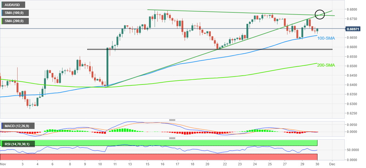 AUD/USD memangkas penurunan dalam perdagangan harian di level-level tertinggi dalam 12 hari. RSI yang lamban, sinyal-sinyal MACD juga mendukung pullback yang menargetkan resistance sebelumnya dari pertengahan Desember. SMA 200 menambah filter sisi bawah, pembeli membutuhkan validasi dari tertinggi bulanan sebelumnya untuk mempertahankan kendali. AUD/USD mundur dari resistance utama jangka pendek selama sesi Asia Senin karena pembeli mengambil nafas setelah tren naik yang berlangsung selama tiga hari. Dengan demikian, pasangan Dolar Australia mundur dari resistance horizontal tiga minggu di tengah RSI yang hampir overbought dan sinyal-sinyal MACD yang lamban. Namun, perlu dicatat bahwa penembusan garis tren menurun minggu sebelumnya dari 13 November, dekat 0,6780 pada saat berita ini dimuat, membuat pembeli AUD/USD tetap berharap. Bahkan jika harga menembus support 0,6780, MA 200-jam di sekitar 0,6725 bertindak sebagai pertahanan terakhir pembeli AUD/USD sebelum memberikan kendali kepada penjual pasangan Dolar Australia. Jika demikian, penjual pasangan Dolar Australia dapat dengan cepat mengincar terendah bulanan sebelumnya di dekat 0,6690. Sebaliknya, penembusan sisi atas area resistance horizontal tiga minggu di sekitar 0,6820-25 dapat mendorong pasangan mata uang ini menuju tertinggi bulanan sebelumnya di sekitar 0,6895. Setelah itu, pasangan mata uang ini berhasil diperdagangkan di luar angka bulat 0,6900, serta tertinggi September di dekat 0,6920, menjadi penting bagi pembeli AUD/USD untuk mencapai tertinggi Agustus 2022 di sekitar 0,7135. Secara keseluruhan, AUD/USD tetap dalam radar pembeli tetapi ruang sisi atas tampak terbatas. AUD/USD: Grafik Per Jam Tren: Diprakirakan pullback level-level teknis AUD/USD Tinjauan Harga terakhir hari ini 0.6809 Perubahan harian hari ini 0.0001 Perubahan harian hari ini % 0.01 Pembukaan harian hari ini 0.6808 Tren SMA 20 Harian 0.6738 SMA 50 Harian 0.6645 SMA 100 Harian 0.6642 SMA 200 Harian 0.6863 Level Tinggi Harian Sebelumnya 0.6821 Rendah Harian Sebelumnya 0.6753 Tinggi Mingguan Sebelumnya 0.6821 Rendah Mingguan Sebelumnya 0.671 Tinggi Bulanan Sebelumnya 0.6893 Rendah Bulanan Sebelumnya 0.6629 Fibonacci Harian 38,2% 0.6795 Fibonacci Harian 61,8% 0.6779 Pivot Point Harian S1 0.6767 Pivot Point Harian S2 0.6726 Pivot Point Harian S3 0.6698 Pivot Point Harian R1 0.6835 Pivot Point Harian R2 0.6863 Pivot Point Harian R3 0.6904