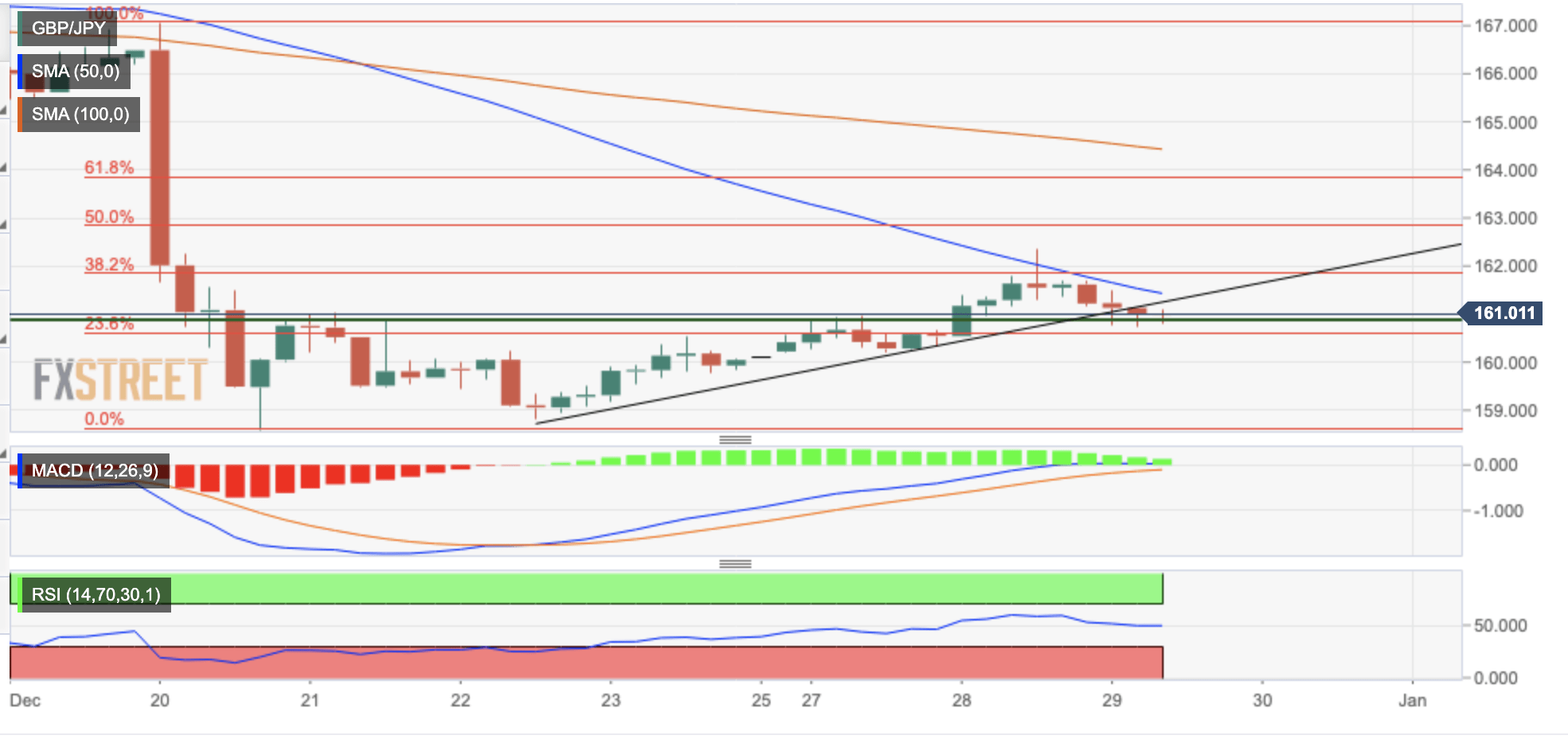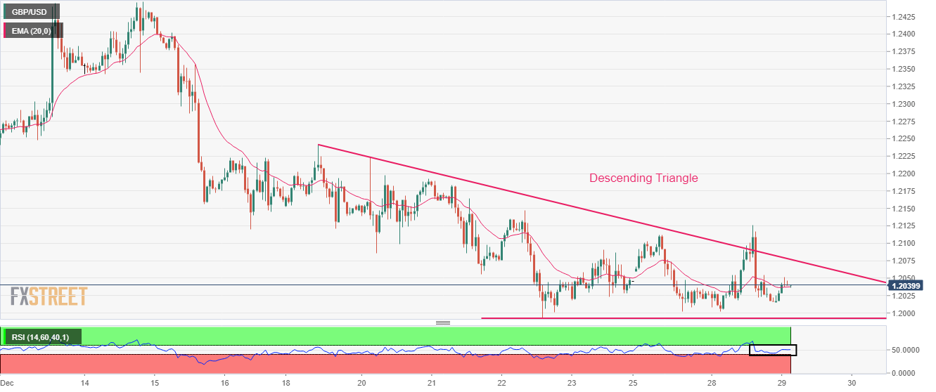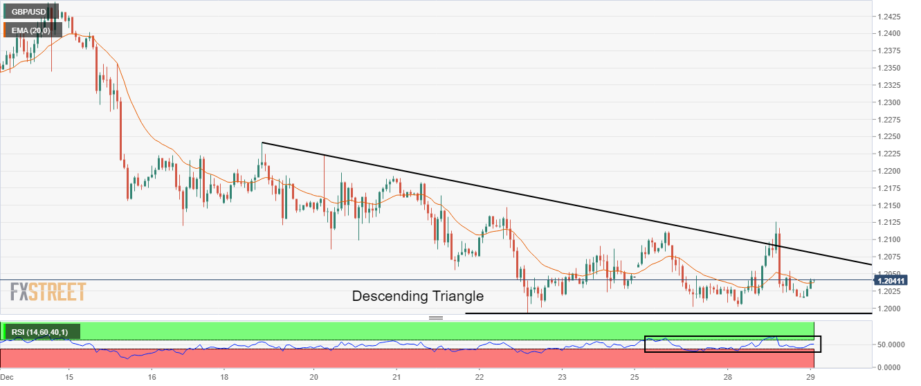 Tidak ada peningkatan dalam Kontrak Berjangka S&P500 yang menggambarkan sentimen risk-off yang lebih luas. Perdagangan dalam pola grafik Descending Triangle mengindikasikan kontraksi volatilitas. Cable berusaha keras untuk menggeser profil perdagangannya di atas EMA 20 periode di sekitar 1,2038. Pasangan GBP/USD berusaha keras untuk melanjutkan pemulihannya di atas resistance terdekat 1,2050 di sesi Tokyo. Cable mencoba pulih di sesi Tokyo karena sentimen risk-off berkurang setelah para investor mulai mengabaikan ketidakpastian terkait lonjakan kasus Covid-19 di Tiongkok. Sementara itu, Indeks Dolar AS (DXY) mengukur bantalan setelah koreksi dari level tertinggi empat hari di 104,56. Kontrak berjangka S&P500 telah gagal menemukan pemulihan, yang menggambarkan tema penghindaran risiko di pasar yang lebih luas. Sementara imbal hasil obligasi 10-tahun pemerintah AS telah melanjutkan pelemahan mereka di bawah 3,86%. Secara luas, Cable diperdagangkan dalam pola grafik Descending Triangle, yang mengindikasikan kontraksi volatilitas dalam skala per jam. Pound Sterling menyaksikan permintaan setelah turun mendekati support horizontal dari pola grafik yang disebutkan di atas yang ditempatkan dari level terendah 22 Desember di 1,1992. Dan, garis tren yang melandai diplot dari level tertinggi 19 Desember di 1,2242. Cable sedang berusaha keras untuk menggeser profil perdagangannya di atas Exponential Moving Average (EMA) 20 periode di sekitar 1,2038. Sementara itu, Relative Strength Index (RSI) (14) berosilasi dalam kisaran 40,00-60,00, yang mengindikasikan bahwa Cable sedang menunggu pemicu baru. Jika Cable melampaui level tertinggi 27 Desember di 1,2112 secara meyakinkan, para pembeli Pound Sterling akan mendorong aset ini menuju level tertinggi 21 Desember di 1,2189 diikuti oleh level tertinggi 19 Desember di 1,2242. Di sisi lain, penurunan yang menentukan di bawah level terendah 22 Desember di 1,1992 akan memicu penembusan ke sisi bawah Descending Triangle dan akan menyeret Cable menuju level tertinggi 29 November di 1.1940. Penurunan di bawah level yang terakhir akan mengekspos Cable untuk mengalami lebih banyak kelemahan menuju terendah 30 November di sekitar 1,1900. Grafik Per Jam GBP/USD Level-Level TeknisGBP/USD Tinjauan Harga terakhir hari ini 1.2036 Perubahan harian hari ini 0.0019 Perubahan harian hari ini % 0.16 Pembukaan harian hari ini 1.2017 Tren SMA 20 Harian 1.2176 SMA 50 Harian 1.1874 SMA 100 Harian 1.1669 SMA 200 Harian 1.2057 Level Tinggi Harian Sebelumnya 1.2126 Rendah Harian Sebelumnya 1.2002 Tinggi Mingguan Sebelumnya 1.2242 Rendah Mingguan Sebelumnya 1.1992 Tinggi Bulanan Sebelumnya 1.2154 Rendah Bulanan Sebelumnya 1.1147 Fibonacci Harian 38,2% 1.205 Fibonacci Harian 61,8% 1.2079 Pivot Point Harian S1 1.1971 Pivot Point Harian S2 1.1925 Pivot Point Harian S3 1.1847 Pivot Point Harian R1 1.2094 Pivot Point Harian R2 1.2172 Pivot Point Harian R3 1.2218