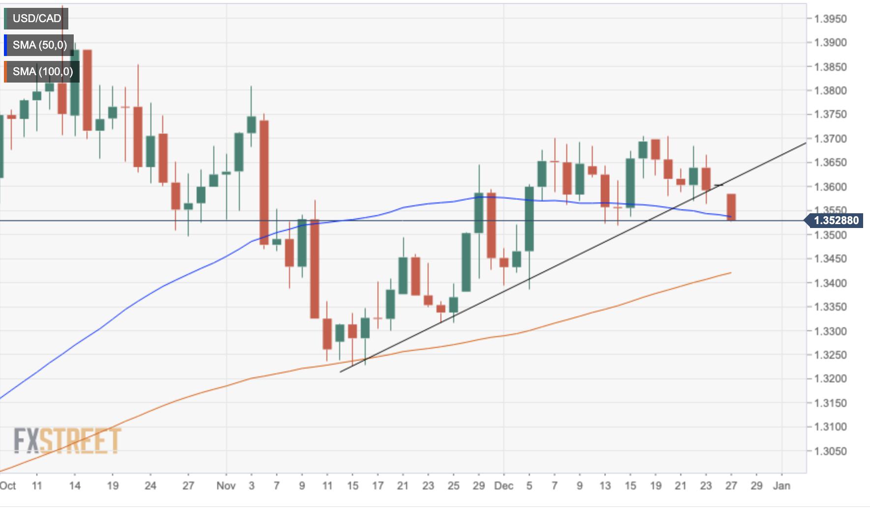 USD/CAD mencetak pelemahan tipis, bertahan di posisi lebih rendah dekat terendah dalam perdagangan harian akhir-akhir ini. Minyak mentah WTI berusaha keras untuk mendapatkan arah yang jelas di tengah sentimen liburan dan sentimen beragam. Dolar AS menelusuri penurunan dalam imbal hasil obligasi pemerintah AS di tengah pasar yang tidak aktif. USD/CAD tetap tertekan di sekitar level terendah dalam perdagangan harian 1,3588 di tengah pasar yang sepi selama awal Kamis. Dengan demikian, pasangan Loonie ini mengkonsolidasikan kenaikan harian terbesar dalam dua minggu karena imbal hasil obligasi pemerintah AS membebani Dolar AS. Meskipun demikian, harga minyak mentah WTI yang lebih lemah, barang ekspor utama Kanada, bergabung dengan sentimen pasar yang beragam untuk membatasi penurunan langsung harga. USD/CAD mengalami lonjakan tertinggi dalam dua minggu pada hari sebelumnya karena keraguan atas statistik Covid Tiongkok dan metode pembukaan karantina tampaknya telah menantang optimisme sebelumnya. Berita dari Reuters menunjukkan perincian virus yang tidak konsisten dari Beijing dan beberapa negara mengumumkan persyaratan pengujian baru dari Tiongkok sebelumnya membebani sentimen pasar dan mendorong imbal hasil obligasi pemerintah AS. "Tiongkok melaporkan tiga kematian baru terkait COVID untuk hari Selasa, naik dari satu kematian pada hari Senin – angka yang tidak konsisten dengan apa yang dilaporkan oleh sejumlah rumah duka, serta pengalaman negara-negara yang jauh lebih sedikit penduduknya setelah mereka dibuka kembali," lapor Reuters. Baru-baru ini Inggris bergabung dengan barisan AS Korea Selatan, Jepang, Taiwan, Italia dan India untuk mengungkap persyaratan pengujian baru Covid bagi para wisatawan dari Tiongkok. Di sisi lain, penolakan Rusia terhadap perdamaian dengan Ukraina kecuali jika menerima perjanjian yang memungkinkan wilayah tambahan untuk bergabung dengan Moskow membebani sentimen pasar dan membela para pembeli USD/CAD, meskipun ada pullback terbaru. Di tempat lain, minyak mentah WTI mencetak pelemahan dalam perdagangan harian sebesar 0,30% di sekitar $78,50, jatuh untuk hari ketiga berturut-turut, karena kekhawatiran atas permintaan akibat beberapa tajuk utama terkait Tiongkok bergabung dengan ketidakmampuan Rusia untuk menyoroti masalah krisis pasokan. Di tengah permainan ini, Kontrak Berjangka S&P 500 naik-turun di sekitar 3.810 sedangkan imbal hasil obligasi 10-tahun pemerintah AS bergerak ke 3,87% setelah mengalami kenaikan terbanyak sejak 19 Oktober pada hari sebelumnya. Ke depan, beberapa katalis risiko akan lebih penting untuk arah yang jelas sementara Klaim Tunjangan Pengangguran Awal AS akan menghiasi kalender ekonomi. Analisis Teknikal USD/CAD berbalik arah dari garis support sebelumnya yang membentang dari pertengahan November, di sekitar 1,3615 pada saat berita ini ditulis. Namun, level 50-DMA di 1,3530 bertindak sebagai support kunci jangka pendek. Level-Level Teknis USD/CAD Tinjauan Harga terakhir hari ini 1.3597 Perubahan harian hari ini -0.0015 Perubahan harian hari ini % -0.11 Pembukaan harian hari ini 1.3612 Tren SMA 20 Harian 1.3598 SMA 50 Harian 1.3534 SMA 100 Harian 1.3429 SMA 200 Harian 1.3111 Level Tinggi Harian Sebelumnya 1.3612 Rendah Harian Sebelumnya 1.3486 Tinggi Mingguan Sebelumnya 1.3704 Rendah Mingguan Sebelumnya 1.3563 Tinggi Bulanan Sebelumnya 1.3808 Rendah Bulanan Sebelumnya 1.3226 Fibonacci Harian 38,2% 1.3564 Fibonacci Harian 61,8% 1.3534 Pivot Point Harian S1 1.3527 Pivot Point Harian S2 1.3443 Pivot Point Harian S3 1.3401 Pivot Point Harian R1 1.3654 Pivot Point Harian R2 1.3696 Pivot Point Harian R3 1.378