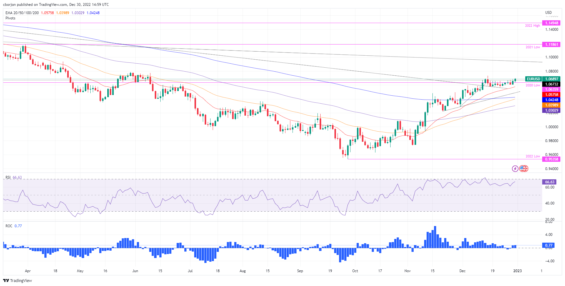 EUR/USD masih dalam kisaran terbatas, gagal menembus 1,0700 menjelang akhir tahun. IMP Chicago untuk bulan Desember melebihi ekspektasi dan pembacaan bulan sebelumnya. Analisis Harga EUR/USD: Bias naik, namun kegagalan untuk menaklukkan 1,0700 akan mengekspos pasangan ini pada tekanan jual. EUR/USD sedikit naik di hari perdagangan terakhir tahun 2022, selama sesi Amerika Utara, meskipun di atas harga pembukaannya sebesar 0,13%. Kalender ekonomi yang ringan membuat pasangan EUR/USD berada dalam kisaran yang sudah dikenal menjelang pekan, bulan, kuartal, dan akhir tahun. Pada saat berita ini ditulis, EUR/USD diperdagangkan di 1,0695. Wall Street akan dibuka lebih rendah karena ekuitas berjangka AS jatuh tanpa katalis fundamental. Kalender ekonomi AS ringan, dengan rilis Indeks Manajer Pembelian Chicago untuk bulan Desember di 44,9, mengalahkan perkiraan 40. Rilis klaim pengangguran hari Kamis memberikan tekanan ke bawah pada Dolar AS (USD), melemah terhadap sebagian besar mata uang G7. Indeks Dolar AS (DXY), ukuran nilai Dolar terhadap sekeranjang mata uang, turun 0,33%, turun menjadi 103,634. Meskipun Greenback jatuh, imbal hasil obligasi pemerintah AS 10-tahun naik lima bp, di 3,869%. Selain itu, data ekonomi Eropa mengungkapkan bahwa inflasi di Spanyol turun untuk 5 bulan berturut-turut, menjadi 5,6% YoY, di bawah pembacaan 6,7% pada bulan November. Namun, karena kondisi perdagangan likuiditas yang tipis dan tahun 2023 di sekitar sudut, hal ini gagal memicu reaksi naik yang dapat mematahkan kisaran perdagangan EUR/USD 1,0600-90. Akhir-akhir ini, Stournaras ECB mengatakan bahwa suku bunga harus dibatasi secara memadai, mengangkat pasangan ini menuju 1,0700, sebelum menghapus kenaikan tersebut. Sementara itu, pada geopolitik, Rusia dan Tiongkok terus memperdalam hubungan mereka, karena konferensi video Presiden Rusia Vladimir Putin dan Xi Jinping dari Tiongkok menunjukkan niat untuk kerja sama lebih lanjut antara kedua negara dalam perdagangan, energi, keuangan, dan pertanian. Selain itu, invasi Rusia ke Ukraina berlanjut selama malam tahun baru, karena gelombang keempat drone menyerang bangunan sipil, seperti yang dilaporkan oleh pihak berwenang Ukraina. Penembakan berlanjut di Kiyv dan Kharkiv, menewaskan setidaknya dua orang. Analisis Harga EUR/USD: Prospek Teknis Dari perspektif teknikal, EUR/USD masih bias naik. Namun demikian, ketidakmampuan untuk secara meyakinkan menembus angka 1,0700 akan mengekspos pasangan ini pada tekanan jual. Osilator seperti Relative Strength Index (RSI) dan Rate of Change (RoC) mendukung kenaikan EUR/USD, tetapi volume rendah membuat para pedagang tetap bertahan. Namun, level resistensi kunci EUR/USD terletak di 1,0700, diikuti oleh level tertinggi harian 15 Desember di 1,0736 dan 1,0800. Di sisi lain, jika EUR/USD turun di bawah 1,0638, tes 1,0600 ada di kartu, diikuti oleh Exponential Moving Average (EMA) 20-hari di 1,0575.