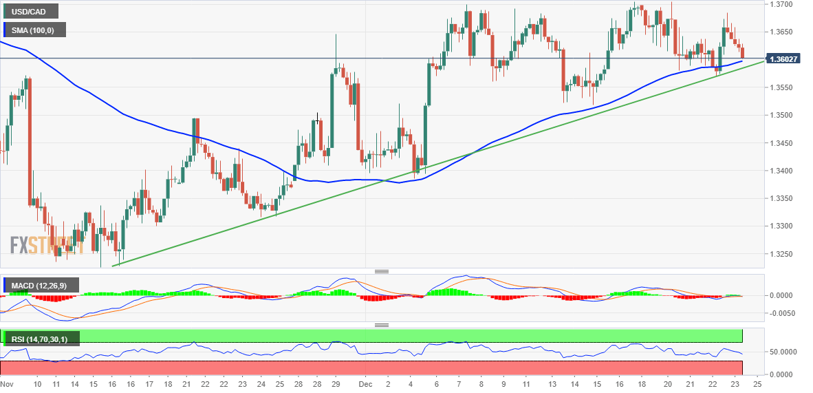 USD/CAD bertemu dengan pasokan baru pada hari Jumat dan tertekan oleh kombinasi faktor. Terob di bawah support pertemuan 1,3600-1,3590 akan membuka jalan untuk penurunan yang lebih dalam. Investor sekarang melihat PDB Kanada bulanan dan data PCE AS untuk dorongan baru. Pasangan USD/CAD berada di bawah beberapa tekanan jual baru pada hari terakhir pekan ini dan terus melemah sepanjang paruh pertama sesi Eropa. Pasangan ini turun ke angka 1,3600, atau level terendah harian baru dalam satu jam terakhir, dan tertekan oleh kombinasi berbagai faktor. Pemulihan sederhana di pasar ekuitas terlihat membebani safe-haven Dolar AS. Selain itu, harga minyak mentah yang bullish mendukung CAD yang terkait komoditas dan memberikan beberapa tekanan ke bawah pada pasangan USD/CAD. Pedagang sekarang melihat laporan PDB Kanada bulanan dan data Pengeluaran Konsumsi Pribadi (PCE) AS AS untuk dorongan baru nanti selama awal sesi Amerika Utara. Dari perspektif teknikal, pasangan USD/CAD saat ini melayang tepat di atas support pertemuan, yang terdiri dari SMA periode 100 pada grafik 4 jam dan garis tren naik selama enam pekan. Mengingat bahwa osilator pada grafik per jam telah melayang lebih rendah di wilayah bearish dan kehilangan daya tarik pada grafik harian, terobosan meyakinkan di bawah ini akan dilihat sebagai pemicu baru untuk perdagangan bearish. Beberapa tindak lanjut penjualan di bawah level terendah mingguan, di sekitar wilayah 1,3570 yang disentuh pada hari Kamis, akan menegaskan kembali bias negatif dan membuat pasangan USD/CAD rentan. Harga spot kemudian dapat mempercepat penurunan untuk pengujian angka psikologis 1,3500. Lintasan penurunan dapat berlanjut menuju support menengah 1,3455-1,3450 dalam perjalanan menuju angka bulat 1,3400 (SMA 100 hari). Di sisi lain, area 1.3650 sekarang tampaknya bertindak sebagai resistensi terdekat. Pergerakan berkelanjutan di atas dapat memungkinkan pasangan USD/CAD untuk melakukan upaya baru untuk menaklukkan angka 1,3700. Beberapa pembelian lanjutan akan terlihat sebagai terobosan bullish baru dan mengangkat harga spot menuju rintangan 1,3745-1,3750 dalam perjalanan ke ayunan tinggi bulanan November, di sekitar wilayah 1,3800-1,3810. Grafik 4 Jam USD/CAD Level Teknis USD/CAD Tinjauan Harga terakhir hari ini 1.3601 Perubahan harian hari ini -38 Perubahan harian hari ini % -0.28 Pembukaan harian hari ini 1.3639 Tren SMA 20 Harian 1.3577 SMA 50 Harian 1.3549 SMA 100 Harian 1.34 SMA 200 Harian 1.3091 Level Tinggi Harian Sebelumnya 1.3685 Rendah Harian Sebelumnya 1.3571 Tinggi Mingguan Sebelumnya 1.3705 Rendah Mingguan Sebelumnya 1.3518 Tinggi Bulanan Sebelumnya 1.3808 Rendah Bulanan Sebelumnya 1.3226 Fibonacci Harian 38,2% 1.3641 Fibonacci Harian 61,8% 1.3614 Pivot Point Harian S1 1.3578 Pivot Point Harian S2 1.3518 Pivot Point Harian S3 1.3465 Pivot Point Harian R1 1.3692 Pivot Point Harian R2 1.3745 Pivot Point Harian R3 1.3806