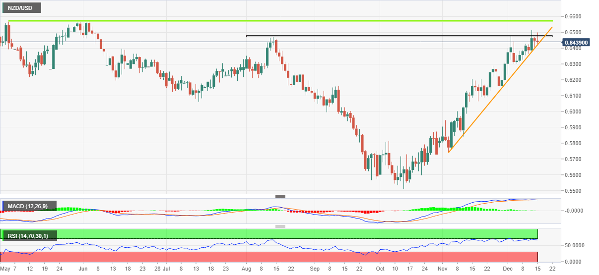 NZD/USD tetap tertekan di sekitar garis support naik berusia 1,5 bulan. Kegagalan berulang untuk melewati area resistance horizontal berusia empat bulan dan kondisi RSI overbought menggoda para penjual. Puncak yang dicatat pada bulan Mei dan Juni menambah penghalang ke sisi atas. Penjual NZD/USD menyerang garis tren miring ke atas dari awal November, di sekitar 0,6420, setelah data utama Tiongkok mengecewakan selama awal hari Kamis. Meskipun demikian, data Produk Domestik Bruto (PDB) kuartal ketiga (Q3) Selandia Baru (NZ) yang lebih kuat membela pasangan Kiwi ini. Meskipun demikian, pertumbuhan Penjualan Ritel Tiongkok turun ke -5,9% di bulan November dibandingkan dengan prakiraan -3,6% dan -0,5% sebelumnya sementara Produksi Industri berada di 2,2% dibandingkan dengan prakiraan pasar 3,3% dan pembacaan sebelumnya 5,0%. Di dalam negeri, PDB Q3 Selandia Baru meningkat ke 2,0% QoQ dan 6,4% YoY dibandingkan 0,9% yang diharapkan dan 5,5% prakiraan pasar sesuai urutan itu. Perlu dicatat bahwa pertumbuhan ekonomi masing-masing sebesar 1,7% dan 0,4% selama kuartal kedua (Q2). Secara teknis, kondisi RSI (14) yang hampir overbought bergabung dengan bear cross yang akan terbentuk pada MACD akan menggoda para penjual. Pada garis yang sama adalah kegagalan berulang pasangan Kiwi ini untuk melewati area resistance horizontal berusia empat bulan di sekitar 0,6470-80. Bahkan jika harga naik melewati 0,6480, angka bulat 0,6500 dan puncak yang dicatat selama bulan Mei dan Juni 2022, di sekitar 0,6570-75, akan menjadi rintangan penting untuk dilampaui oleh para pembeli NZD/USD agar dapat mempertahankan kendali. Sebaliknya, penutupan harian di bawah garis support naik dari awal November, di sekitar 0,6420, menjadi penting bagi para penjual NZD/USD agar dapat mengambil kendali. Setelah itu, swing high pertengahan Juni di dekat 0,6395 dan puncak November di 0,6290 dapat memikat para penjual. NZD/USD: Grafik Harian Tren: Diprakirakan akan terjadi penurunan lebih lanjut Level-Level Teknis NZD/USD Tinjauan Harga terakhir hari ini 0.644 Perubahan harian hari ini -0.0007 Perubahan harian hari ini % -0.11 Pembukaan harian hari ini 0.6447 Tren SMA 20 Harian 0.6291 SMA 50 Harian 0.5996 SMA 100 Harian 0.6039 SMA 200 Harian 0.6274 Level Tinggi Harian Sebelumnya 0.6471 Rendah Harian Sebelumnya 0.6401 Tinggi Mingguan Sebelumnya 0.6444 Rendah Mingguan Sebelumnya 0.6302 Tinggi Bulanan Sebelumnya 0.6314 Rendah Bulanan Sebelumnya 0.5741 Fibonacci Harian 38,2% 0.6428 Fibonacci Harian 61,8% 0.6444 Pivot Point Harian S1 0.6408 Pivot Point Harian S2 0.637 Pivot Point Harian S3 0.6339 Pivot Point Harian R1 0.6478 Pivot Point Harian R2 0.6509 Pivot Point Harian R3 0.6548