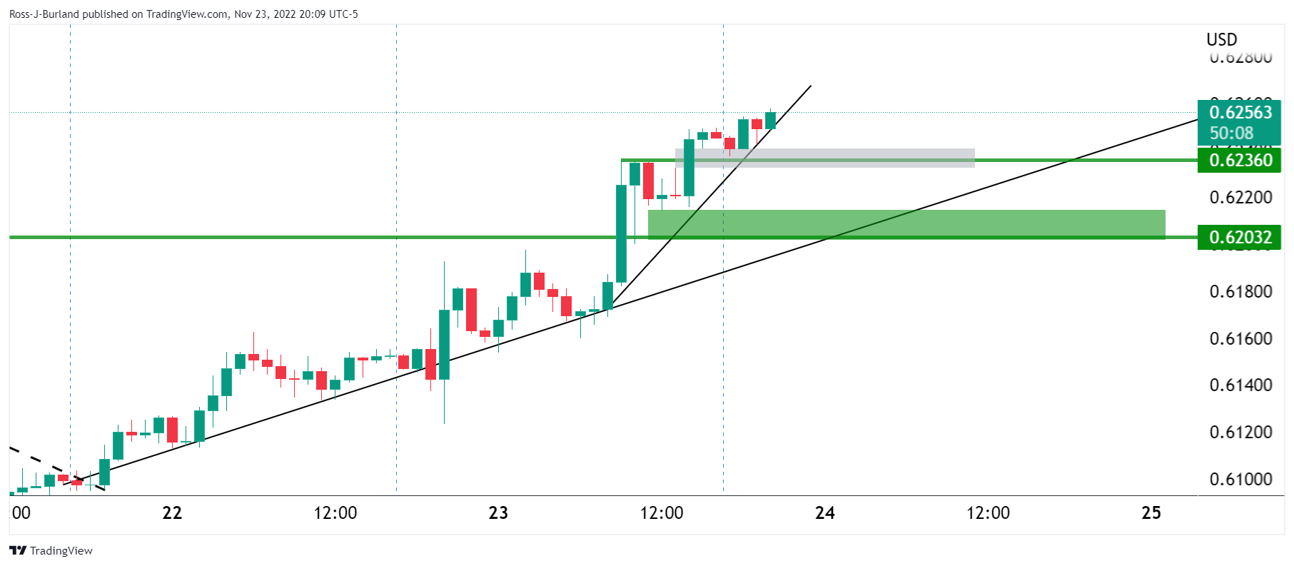 Para pembeli NZD/USD memegang kendali sementara tetap berada di sisi depan garis tren harian dan per jam. Para pembeli membidik level tertinggi harian dengan area 0,65400 yang terlihat. Gubernur bank sentral Selandia Baru mengatakan pada hari Kamis bahwa suku bunga acuan perlu naik lebih tinggi setelah nada hawkish dan memprakirakan bahwa suku bunga sekarang akan mencapai puncaknya pada 5,5%, dibandingkan dengan prakiraan sebelumnya sebesar 4,1%. NZD/USD menguat ke level tertinggi 0,6259 pada hari Kamis, menuju level terkuat dalam hampir tiga bulan dengan fokus tertuju pada 0,6485 setelah Reserve Bank of New Zealand memberikan kenaikan suku bunga 75 basis poin yang sangat besar untuk mengatasi inflasi. Kenaikan itu adalah yang terbesar sejak RBNZ memperkenalkan OCR pada tahun 1999 dan membawa tingkat kebijakan ke level tertinggi 14 tahun di 4,25%. Hal ini membuat kenaikan tetap dalam permainan sementara harga tetap berada di sisi depan garis tren harian. Grafik 1 Jam NZD/USD Para pembeli merayap lebih tinggi di perdagangan sesi Asia meskipun telah mencapai titik terendah sejak RBNZ. Gambaran Besar Grafik 1 Jam NZD/USD Hal ini telah terjadi dengan pergerakan yang telah berkembang selama beberapa waktu mengingat kumparan dan penembusan area 0,6000 dan 0,6100. Hal ini berpotensi untuk bergerak menuju level tertinggi harian seperti yang diilustrasikan di bawah ini pada kerangka waktu harian, sementara para pembeli tetap berada di depan garis tren harian: Grafik Harian NZD/USD