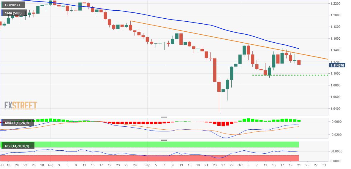 GBP/USD tetap tertekan di sekitar level terendah dalam perdagangan harian selama tren turun tiga hari. PM Inggris Truss kehilangan pendukung lain tetapi tetap berkuasa, gerakan Tory juga mempertahankan pemungutan suara terkait fracking. Inflasi Inggris yang kuat, penolakan Hunt terhadap proposal "anggaran mini" gagal mengesankan para pembeli. Sentimen risk-off, imbal hasil yang lebih kuat mendukung permintaan dolar AS. GBP/USD bertahan pada bias bearish untuk hari ketiga berturut-turut karena para penjual menyerang 1,1200 di tengah lesunya hari Kamis. Kelemahan pasangan Cable dapat dikaitkan dengan sentimen risk-off yang luas, serta pesimisme politik di Inggris. Setelah kehilangan Kwasi Kwarteng, mantan Kanselir, PM Inggris Liz Truss harus melepas Menteri Dalam Negeri Suella Braverman, karena pelanggaran "teknis" terhadap aturan pemerintah, menurut Reuters, yang pada gilirannya menimbulkan pertanyaan tentang masa depan kehidupan tim pemerintah Tory saat ini. Meski begitu, Kepala Whip dan Deputi Tory ini selamat dari pemungutan suara hari Rabu di Parlemen Inggris. "Mosi oleh oposisi utama Partai Buruh dikalahkan oleh 326 suara menjadi 230 dan proposal pemerintah menang, tetapi beberapa anggota parlemen mengatakan mereka marah atas taktik, atau kurangnya taktik, yang digunakan oleh pemerintah," kata Reuters. Di tempat lain, lonjakan imbal hasil obligasi pemerintah AS dan beberapa katalis negatif risiko memungkinkan Indeks Dolar AS (DXY) mendapatkan kembali lintasan naiknya dan membebani harga GBP/USD. Meskipun demikian, imbal hasil obligasi 10-tahun pemerintah AS kembali ke level tertinggi 14 tahun di atas 4,0% karena para pelaku pasar bergegas menuju risiko-keamanan. Hal tersebut juga membebani Wall Street dan Kontrak Berjangka S&P 500 sesudahnya. Di balik penghindaran risiko bisa jadi angka inflasi yang lebih kuat secara luas dari Inggris, Zona Euro dan Kanada, serta taruhan The Fed yang hawkish dan pesimisme yang disampaikan oleh Beige Book The Fed. Sesuai dengan FedWatch Tool CME, harga pasar di sekitar 95% kemungkinan kenaikan suku bunga sebesar 75 bp oleh The Fed pada bulan November. Taruhan The Fed yang hawkish tampaknya menegaskan beberapa komentar optimis dari para pengambil kebijakan Federal Reserve (The Fed) dan meningkatkan kekhawatiran terhadap perlambatan ekonomi. Baru-baru ini, Presiden The Fed Chicago Charles Evans mengatakan bahwa (mereka) perlu memastikan tekanan inflasi tidak meluas lebih jauh, yang pada gilirannya menunjukkan lebih banyak kenaikan suku bunga meskipun ada masalah resesi. Perlu dicatat bahwa Beige Book The Fed semakin memperkuat kekhawatiran pasar dengan menunjukkan peningkatan pesimisme di antara para responden. Selanjutnya, GBP/USD menyaksikan penurunan lebih lanjut di tengah kalender ekonomi yang sepi tetapi kegelisahan politik di Inggris dapat membuat para penjual tetap optimis. Analisis Teknis Selain support terdekat 1,1220, garis tren yang menanjak dari 29 September, di sekitar 1,1155, akan mendahului level 21-DMA di dekat 1,1130 untuk juga menantang penurunan pasangan GBP/USD dalam jangka pendek . Sebaliknya, garis resistance menurun dari akhir Agustus, di sekitar 1,1345, membatasi kenaikan terdekat pasangan GBP/USD. Level-Level Teknis GBP/USD Tinjauan Harga terakhir hari ini 1.1205 Perubahan harian hari ini -0.0013 Perubahan harian hari ini % -0.12 Pembukaan harian hari ini 1.1218 Tren SMA 20 Harian 1.113 SMA 50 Harian 1.1465 SMA 100 Harian 1.1809 SMA 200 Harian 1.2443 Level Tinggi Harian Sebelumnya 1.1358 Rendah Harian Sebelumnya 1.1185 Tinggi Mingguan Sebelumnya 1.1381 Rendah Mingguan Sebelumnya 1.0924 Tinggi Bulanan Sebelumnya 1.1738 Rendah Bulanan Sebelumnya 1.0339 Fibonacci Harian 38,2% 1.1251 Fibonacci Harian 61,8% 1.1292 Pivot Point Harian S1 1.1149 Pivot Point Harian S2 1.1081 Pivot Point Harian S3 1.0977 Pivot Point Harian R1 1.1322 Pivot Point Harian R2 1.1427 Pivot Point Harian R3 1.1495