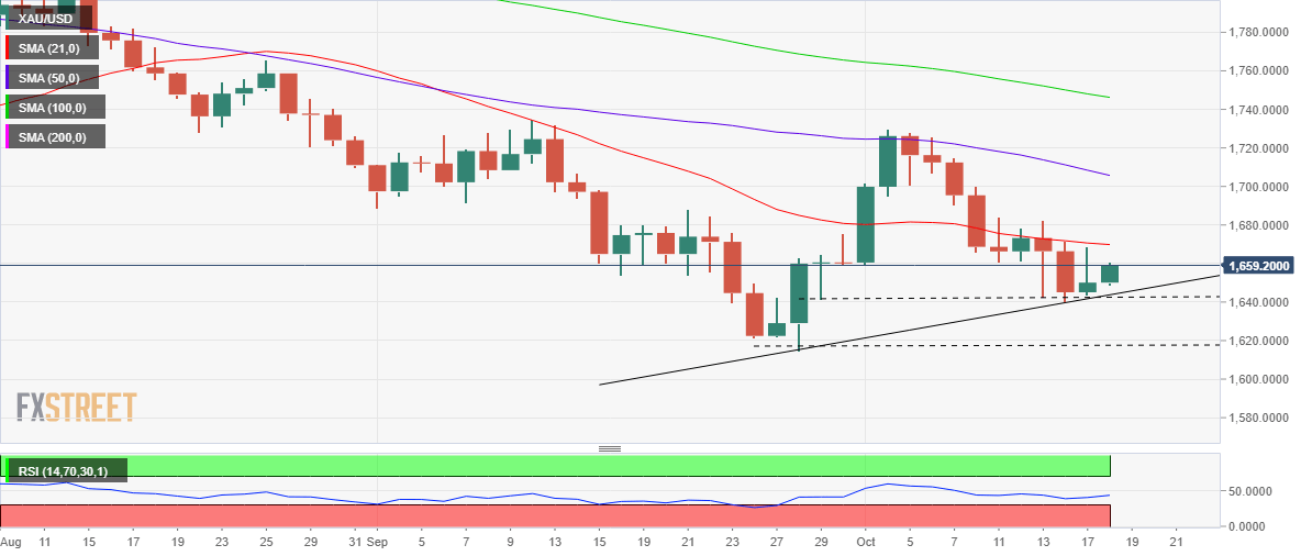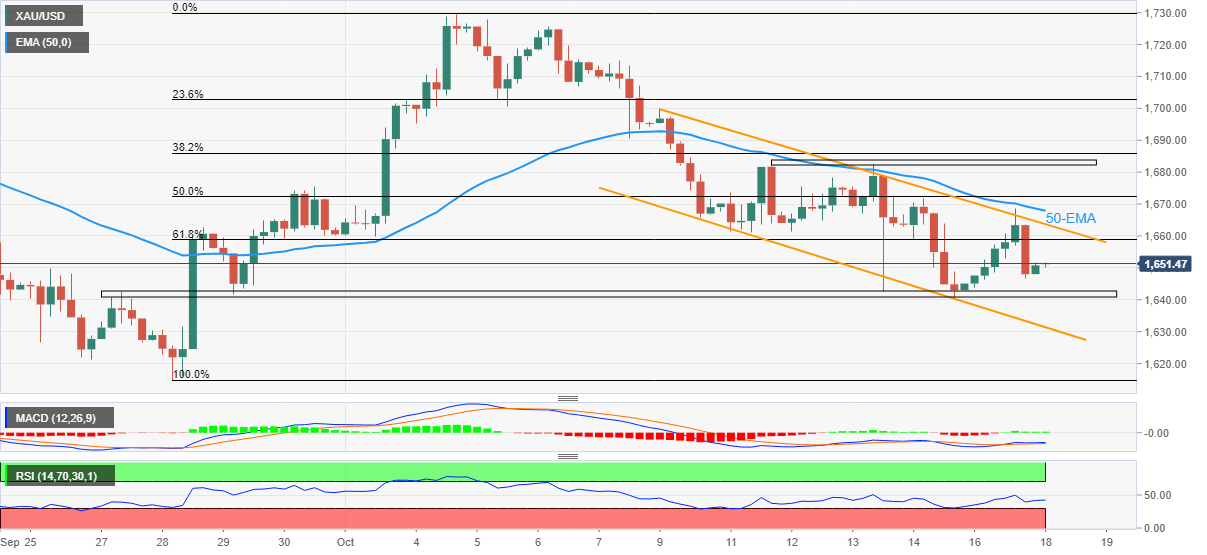 Harga emas memudarkan pemulihan awal pekan ini, mengincar untuk menguji ulang support horizontal berusia tiga minggu. DXY menjilat lukanya setelah jatuh paling dalam dua pekan, imbal hasil mundur. Taruhan The Fed yang hawkish, intervensi yang membayangi dari Jepang menguji para pembeli XAU/USD. Kalender ekonomi yang sepi dapat membuat para pedahang emas berusaha keras di dalam saluran bearish. Harga emas (XAU/USD) berusaha keras untuk melanjutkan pemulihan hari sebelumnya dari level terendah dua minggu, turun kembali ke $1.650 selama sesi Asia hari Selasa, karena optimisme awal pekan memudar di tengah kurangnya hal utama yang positif. Yang juga menantang para pembeli logam tersebut adalah kekhawatiran yang membayangi intervensi pasar oleh para pengambil kebijakan Jepang dan Tiongkok untuk mempertahankan mata uang masing-masing, serta taruhan The Fed yang hawkish. Menteri Keuangan Jepang Shunichi Suzuki mengatakan bahwa mereka mengawasi pasar Valas dengan rasa urgensi. Komentar-komentar tersebut menjadi penting karena USD/JPY mencapai level tertinggi sejak 1990. Di tempat lain, Reuters mengutip enam sumber anonim yang menyebutkan bahwa bank-bank besar milik negara Tiongkok terlihat menukar yuan dengan dolar AS di pasar forward dan menjual dolar tersebut di pasar spot pada Senin pagi. Perlu dicatat bahwa taruhan pasar, sesuai dengan FedWatch Tool CME, menunjukkan kenaikan suku bunga The Fed 75 bp pada bulan November, yang pada gilirannya menahan para pembeli XAU/USD. Taruhan The Fed yang hawkish baru-baru ini dapat mengambil petunjuk dari beberapa komentar optimis Menteri Keuangan AS Janet Yellen, yang menunjukkan bursa pekerjaan AS yang kuat, serta ekspektasi inflasi AS yang optimis sesuai dengan tingkat inflasi impas 10 tahun dan 5 tahun sesuai data St. Louis Federal Reserve (FRED). Pada hari Senin, Menteri Keuangan Inggris, yang juga disebut Kanselir, membalikkan pengumuman kebijakan sebelumnya meningkatkan harapan pasar bahwa London akan mengatasi keruntuhan pasar yang akan datang, yang pada gilirannya mendukung para pembeli XAU/USD. "Di bawah kebijakan baru, sebagian besar pemotongan pajak Truss senilai 45 miliar poundsterling yang tidak didanai akan hilang dan skema subsidi energi dua tahun untuk rumah tangga dan bisnis – diperkirakan akan menelan biaya lebih dari 100 miliar poundsterling – sekarang akan dibatasi pada bulan April," kata Reuters. Yang juga mendukung para pembeli emas adalah data AS yang suram. Dengan itu, Indeks Manufaktur Empire State NY untuk Oktober turun -9,5 versus -4,0 yang diharapkan dan -1,5 sebelumnya. Sebaliknya, kebijakan nol Covid Tiongkok dan tekad untuk mempertahankan kekuasaan di Hong Kong dan Taiwan bergabung dengan krisis energi di zona euro untuk menantang para pembeli XAU/USD. Selanjutnya, kalender ekonomi yang sepi dapat memungkinkan para penjual logam untuk bergerak perlahan tetapi setiap kejutan positif untuk dolar AS, dalam hal campur tangan pasar oleh Jepang dan/atau Tiongkok tidak akan diabaikan. Analisis Teknis Harga emas tetap berada di dalam saluran bearish berusia lima minggu di tengah MACD dan RSI (14) yang lesu, yang pada gilirannya menunjukkan logam tersebut akan tetap berada dalam pantauan para penjual kecuali melewati garis atas formasi, di sekitar $1.664 pada saat berita ini ditulis. Bahkan jika harga naik melewati $1.664, rintangan EMA 50 di sekitar $1.670 akan menjadi penting untuk diperhatikan oleh para pembeli XAU/USD sebelum mencoba mengambil kendali kembali. Setelah itu, area resistance horizontal berusia satu minggu di dekat $1.683 dapat bertindak sebagai pertahanan terakhir dari para penjual emas. Sebaliknya, beberapa level yang dicatat sejak 27 September membatasi pergerakan harga emas langsung di dekat $ 1.640 di depan garis support saluran yang dinyatakan, di sekitar $ 1.631 baru-baru ini. Emas: Grafik Empat Jam Tren: Diperkirakan akan terjadi pelemahan lebih lanjut Level-Level Teknis XAU/USD Tinjauan Harga terakhir hari ini 1650.63 Perubahan harian hari ini 0.53 Perubahan harian hari ini % 0.03 Pembukaan harian hari ini 1650.1 Tren SMA 20 Harian 1670.36 SMA 50 Harian 1708.42 SMA 100 Harian 1748.03 SMA 200 Harian 1817.76 Level Tinggi Harian Sebelumnya 1668.53 Rendah Harian Sebelumnya 1643.84 Tinggi Mingguan Sebelumnya 1699.96 Rendah Mingguan Sebelumnya 1640.23 Tinggi Bulanan Sebelumnya 1735.17 Rendah Bulanan Sebelumnya 1614.85 Fibonacci Harian 38,2% 1659.1 Fibonacci Harian 61,8% 1653.27 Pivot Point Harian S1 1639.78 Pivot Point Harian S2 1629.47 Pivot Point Harian S3 1615.09 Pivot Point Harian R1 1664.47 Pivot Point Harian R2 1678.85 Pivot Point Harian R3 1689.16