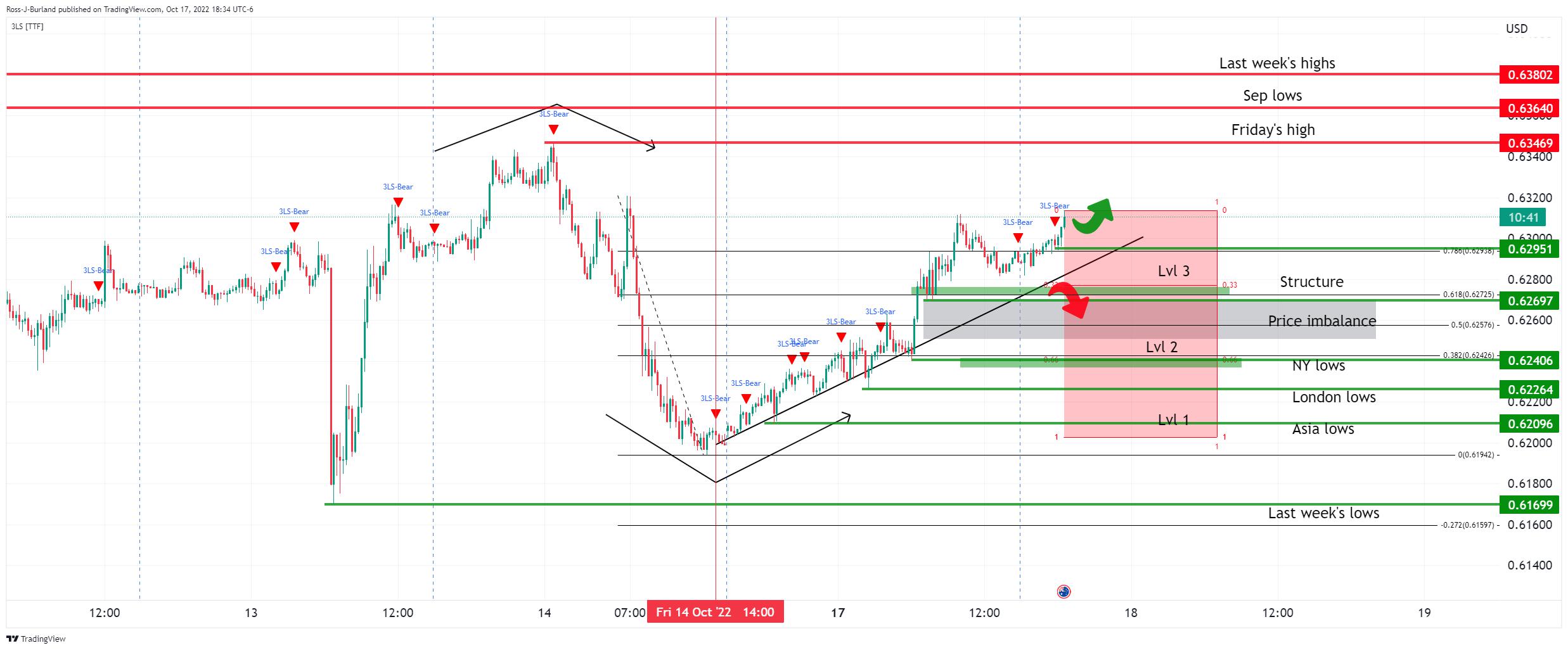 AUD/USD berusaha keras untuk mendapatkan arah yang jelas sementara tetap rendah akhir-akhir ini. Perubahan Ketenagakerjaan Australia naik kurang dari yang diharapkan, Tingkat Pengangguran stabil di bulan September, Keyakinan Bisnis NAB Kuartal 3 meningkat. Para penjual obligasi beristirahat setelah imbal hasil Rally ke level tertinggi multi-tahun, membatasi penurunan segera pasangan mata uang ini. Keputusan Suku Bunga PBOC, katalis risiko akan sangat penting sebagai petunjuk arah yang jelas karena para penjual tetap memegang kendali. AUD/USD tetap berada di sekitar 0,6250 meskipun statistik Australia beragam karena penghindaran risiko dan taruhan The Fed yang hawkish mendorong dolar AS selama hari Kamis. Ketahanan pasangan AUD ini untuk menyentuh kembali level terendah mingguan dapat dikaitkan dengan kecemasan menjelang pertemuan kebijakan moneter People's Bank of China (PBOC). Perubahan Ketenagakerjaan utama Australia naik 0,9 ribu versus 25 ribu yang diharapkan dan 33,5 ribu sebelumnya sementara Tingkat Pengangguran dan Tingkat Partisipasi sesuai dengan perkiraan pasar masing-masing mencetak angka 3,5% dan 66,6%. Baca juga: Breaking: Lapangan Pekerjaan Australia Tenggelamkan AUD karena Data Utama Meleset dari Prakiraan Perlu dicatat bahwa angka Keyakinan Bisnis triwulanan National Australia Bank (NAB) naik menjadi 9 versus 5 yang diharapkan dan 7 sebelumnya dan membatasi penurunan langsung pasangan AUD/USD. Yang juga menantang para penjual pasangan AUD/USD adalah imbal hasil obligasi pemerintah yang lesu karena para pedagang obligasi mengambil nafas setelah hari yang bergejolak. Meskipun demikian, kemarin, imbal hasil imbal hasil obligasi 10-tahun pemerintah AS menyentuh kembali level tertinggi 14 tahun ke 4,14%, di sekitar 4,13% pada saat berita ini ditulis, karena para pelaku pasar bergegas menuju risiko-keamanan. Hal tersebut juga membebani Wall Street dan Kontrak Berjangka S&P 500 sesudahnya. Kekhawatiran terhadap inflasi yang lebih tinggi dan agresi bank sentral bergabung dengan beberapa tajuk utama yang suram dari Tiongkok dan Inggris untuk membebani selera risiko dan AUD/USD. Sesuai FedWatch Tool CME, pasar memprakirakan sekitar 95% peluang kenaikan suku bunga sebesar 75 bp oleh The Fed pada bulan November. Taruhan The Fed yang hawkish tampaknya menegaskan beberapa komentar optimis dari para pembuat kebijakan Federal Reserve (The Fed) dan meningkatkan kekhawatiran perlambatan ekonomi. Baru-baru ini, Presiden The Fed Chicago Charles Evans mengatakan bahwa (mereka) perlu memastikan tekanan inflasi tidak meluas lebih jauh, yang pada gilirannya menunjukkan lebih banyak kenaikan suku bunga meskipun ada masalah resesi. Perlu dicatat bahwa Beige Book The Fed semakin memperkuat kekhawatiran pasar dengan menunjukkan peningkatan pesimisme di antara para responden. Analisis Teknis Para penjual tetap berkuasa kecuali jika harga menentang saluran tren turun berusia enam minggu, dengan melampaui rintangan 0,6285. Level-Level Teknis AUD/USD Tinjauan Harga terakhir hari ini 0.6258 Perubahan harian hari ini -0.0013 Perubahan harian hari ini % -0.21 Pembukaan harian hari ini 0.6271 Tren SMA 20 Harian 0.6399 SMA 50 Harian 0.667 SMA 100 Harian 0.6808 SMA 200 Harian 0.7019 Level Tinggi Harian Sebelumnya 0.6325 Rendah Harian Sebelumnya 0.6251 Tinggi Mingguan Sebelumnya 0.638 Rendah Mingguan Sebelumnya 0.617 Tinggi Bulanan Sebelumnya 0.6916 Rendah Bulanan Sebelumnya 0.6363 Fibonacci Harian 38,2% 0.6279 Fibonacci Harian 61,8% 0.6297 Pivot Point Harian S1 0.624 Pivot Point Harian S2 0.6209 Pivot Point Harian S3 0.6166 Pivot Point Harian R1 0.6314 Pivot Point Harian R2 0.6356 Pivot Point Harian R3 0.6388