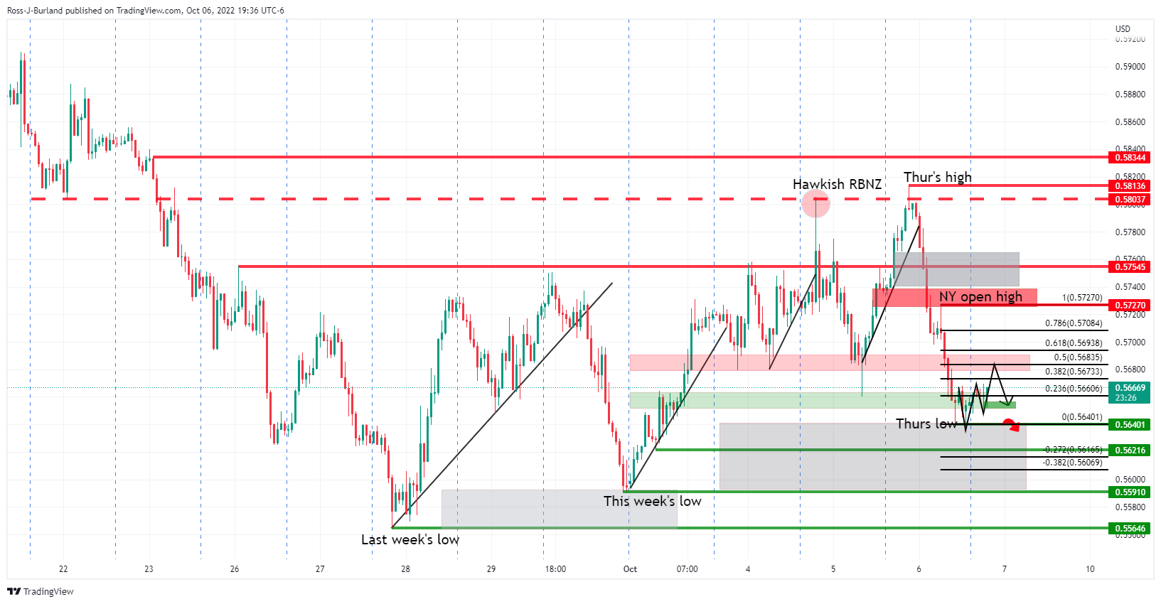 Penjual NZD/USD mengintai di resistance penting tepat di bawah 0,5700. Penjual mengincar pergerakan menuju level terendah pekan ini untuk mengantisipasi dolar AS dan NFP yang lebih kuat. NZD/USD kembali berada di bawah tekanan jual pada hari Kamis setelah membuat level tertinggi baru untuk pekan ini sejauh ini di 0,5813, hanya untuk menyerah pada imbal hasil AS yang lebih tinggi dan greenback yang merajalela yang membalas dendam pada mata uang lainnya ke musim terakhir untuk pekan ini. Pergerakannya sangat luas di pasar valas yang telah berjuang untuk menemukan arah pada pekan ini sejauh ini dalam memimpin ke acara pertikaian di Nonfarm Payrolls hari Jumat. Imbal hasil AS dan dolar AS keduanya menguat karena para investor memutar kembali sentimen seputar pivot dari Federal Reserve. Berikut ini mengilustrasikan struktur pasar dalam imbal hasil, DXY, dan NZD/USD menjelang data untuk hari ini. Grafik 1 Jam Imbal Hasil 10 Tahun AS Imbal hasil AS memimpin setelah menunjukkan ketahanan di awal pekan ini. Formasi W, seperti yang ditunjukkan di sini pada grafik per jam yang diperbesar, adalah skenario bullish untuk hari mendatang. Imbal hasil perlu bertahan pada pengujian ulang garis leher. Ini adalah skenario bearish bagi kiwi saat kita menuju ke Nonfarm Payrolls pada hari Jumat. Grafik 1 Jam DXY Untuk mengantisipasi laporan positif, indeks DXY, yang mengukur dolar AS vs sekeranjang mata uang, termasuk dolar kiwi, naik dan melanjutkan kenaikannya dari hari sebelumnya. Selama para pembeli berkomitmen, ada prospek pengujian ulang menuju pembukaan 112,50 lagi dengan pandangan pada 113,00. Grafik 1 Jam NZD/USD Seperti yang diilustrasikan, kiwi dijual dengan sangat kuat dan mencoba untuk menemukan terendah di sekitar 0,5650. Namun, penembusan di bawah level tersebut, membuka risiko posisi beli menuju posisi terendah pekan ini di sekitar 0,5590 dengan posisi terendah pekan lalu terletak di 0,5565. Di sisi lain, jika laporan NFP mengecewakan, sentimen para investor untuk pivot The Fed akan dihidupkan kembali menjelang data inflasi pekan depan untuk AS, membuka risiko rally sementara itu kembali ke arah atau melampaui level tertinggi hari Kamis di sekitar 0,58 jika para pembeli dapat melampaui 0,5750.
