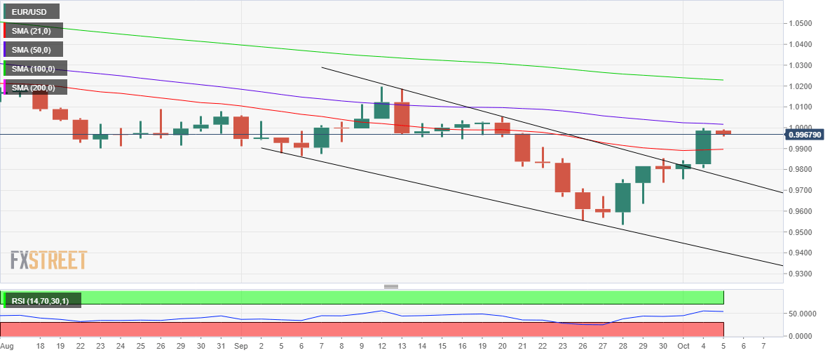 EUR/USD tergelincir setelah mengalami resistensi tepat di bawah paritas. Dolar AS rebound bersama imbal hasil karena langkah hawkish RBNZ menghidupkan kembali taruhan kenaikan suku bunga Fed yang agresif. Terobosan falling wedge bertemu resistensi di DMA-50, karena fokus bergeser ke data penting AS. EUR/USD berbelok ke selatan menuju 0,9950 setelah bertemu pasokan baru tepat di bawah tanda paritas. Rebound Dolar AS yang luas membantu penurunan baru dalam pasangan mata uang utama. Dolar menemukan pembeli baru, melakukan pemulihan yang layak, karena kemungkinan pengetatan Fed yang agresif kembali bermain setelah kenaikan suku bunga 50 bp hawkish Reserve Bank of New Zealand (RBNZ). Langkah RBNZ memperkecil harapan untuk jeda atau perlambatan dalam niat Fed untuk kenaikan agresif. Narasi ini juga telah membantu imbal hasil obligasi pemerintah AS rebound di seluruh kurva waktu. Sementara itu, nada risiko telah berubah sedikit berhati-hati, karena investor sekarang menanti data pekerjaan ADP AS dan IMP Jasa ISM untuk petunjuk baru tentang ukuran kenaikan suku bunga Fed pada bulan November. Pada hari Selasa, penurunan tajam dalam lowongan pekerjaan AS menghancurkan Dolar secara keseluruhan, karena data tersebut meredam ekspektasi kenaikan suku bunga Fed yang sangat besar. Di sisi EUR, investor tetap tegang di tengah krisis energi Eropa yang membayangi meskipun kepala energi Uni Eropa mengatakan pada Selasa malam, "kami memiliki penyimpanan yang cukup untuk melewati musim dingin tanpa gas Rusia jika terjadi cuaca ringan." Sementara itu, Uni Eropa menyetujui sanksi baru terhadap Rusia, termasuk batas harga minyak, yang rinciannya akan dirilis pada hari Rabu. EUR/USD: Prospek teknis Melihat grafik harian EUR/USD, berlanjutnya terobosan falling wedge yang dihasilkan pada hari Senin gagal tepat di bawah Moving Average (DMA) 50-Harian yang sedikit bearish di 1,0016. Penjual, oleh karena itu, melihat DMA 21 horizontal di 0,9896 jika kemunduran berlanjut. Di depan itu, level psikologis 0,9950 bisa menyelamatkan pembeli. EUR/USD: Grafik harian Relative Strength Index (RSI) 14 hari telah berubah datar tetapi bertahan di atas level 50,00, menjaga pembeli tetap berharap. Penutupan harian di atas penghalang DMA 50 diperlukan untuk melanjutkan tren naik menuju level tertinggi 20 September di 1,0050. Lebih jauh ke atas, pembeli akan menantang level bulat 1,1100 pada kelanjutan momentum bullish. Level Teknis EUR/USD Tinjauan Harga terakhir hari ini 0.9968 Perubahan harian hari ini -0.0018 Perubahan harian hari ini % -0.18 Pembukaan harian hari ini 0.9986 Tren SMA 20 Harian 0.9893 SMA 50 Harian 1.0021 SMA 100 Harian 1.0234 SMA 200 Harian 1.0641 Level Tinggi Harian Sebelumnya 1 Rendah Harian Sebelumnya 0.9806 Tinggi Mingguan Sebelumnya 0.9854 Rendah Mingguan Sebelumnya 0.9536 Tinggi Bulanan Sebelumnya 1.0198 Rendah Bulanan Sebelumnya 0.9536 Fibonacci Harian 38,2% 0.9926 Fibonacci Harian 61,8% 0.988 Pivot Point Harian S1 0.9862 Pivot Point Harian S2 0.9737 Pivot Point Harian S3 0.9668 Pivot Point Harian R1 1.0055 Pivot Point Harian R2 1.0124 Pivot Point Harian R3 1.0249