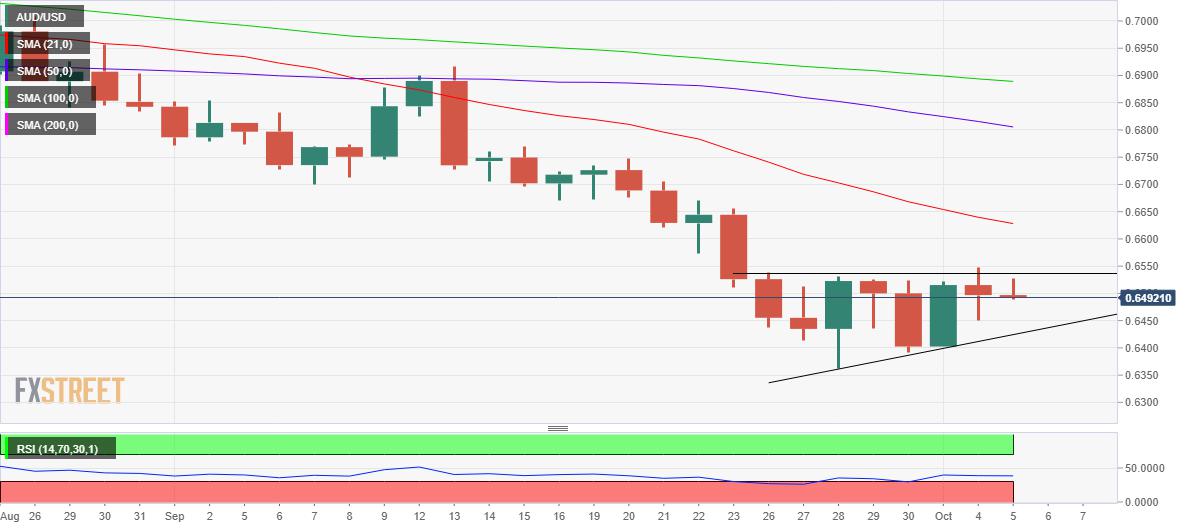 AUD/USD telah mengambil tawaran beli di sekitar 0,6480 karena risk-on rebound setelah imbal hasil turun mendekati 3,62%. Investor sedang menunggu rilis data IMP Jasa ISM dan Pekerjaan ADP AS untuk membuat keputusan yang tepat. Pembeli AUD tetap lesu meskipun data IMP S&P lebih baik dari sebelumnya. Pasangan AUD/USD telah merasakan minat beli di sekitar 0,6480 karena pergerakan pullback dalam Indeks Dolar AS (DXY) tampaknya berakhir sekarang. Traksi kembali ke profil pasar risk-on karena imbal hasil telah turun dari level tertinggi hari ini. Imbal hasil obligasi pemerintah AS 10-tahun telah menurun tajam setelah mencatatkan level tertinggi hari ini di 3,64% dan telah tergelincir ke 3,62% saat penulisan. Dapat disimpulkan bahwa DXY merasakan tekanan menjelang rilis data IMP Jasa ISM AS. Sesuai konsensus, IMP Jasa ISM AS akan turun ke 56,0 vs. rilis sebelumnya 56,9. Tampaknya kelanjutan dari sikap pengetatan kebijakan oleh Federal Reserve (Fed) telah mulai menunjukkan konsekuensinya. Permintaan ritel kini berkurang dan pada akhirnya, industri jasa terpukul. Selain itu, data Indeks Pesanan Baru Jasa ISM AS terlihat secara signifikan lebih rendah di 58,9 dibandingkan rilis sebelumnya di 61,8. Penurunan dalam indikator berwawasan ke depan diperkirakan akan membawa volatilitas tipis pada DXY. Terlepas dari data IMP Jasa, data Perubahan Ketenagakerjaan Pemrosesan Data Otomatis (ADP) AS akan tetap menjadi fokus. Konsensus untuk data ekonomi mengindikasikan bahwa ekonomi AS telah menambahkan 200 ribu pekerjaan di pasar tenaga kerja pada bulan September vs. rilis sebelumnya sebesar 132 ribu. Sementara itu, kembalinya optimisme di pasar mendukung AUD. Di awal Asia, IHS Markit melaporkan data IMP S&P. IMP Komposit dirilis lebih tinggi di 50,9 terhadap angka sebelumnya 50,8 sementara IMP Jasa naik menjadi 50,6 terhadap proyeksi 50,4. Level Teknis AUD/USD Tinjauan Harga terakhir hari ini 0.6488 Perubahan harian hari ini -9 Perubahan harian hari ini % -0.14 Pembukaan harian hari ini 0.6497 Tren SMA 20 Harian 0.6635 SMA 50 Harian 0.6816 SMA 100 Harian 0.6894 SMA 200 Harian 0.7069 Level Tinggi Harian Sebelumnya 0.6548 Rendah Harian Sebelumnya 0.6451 Tinggi Mingguan Sebelumnya 0.6538 Rendah Mingguan Sebelumnya 0.6363 Tinggi Bulanan Sebelumnya 0.6916 Rendah Bulanan Sebelumnya 0.6363 Fibonacci Harian 38,2% 0.6488 Fibonacci Harian 61,8% 0.6511 Pivot Point Harian S1 0.6449 Pivot Point Harian S2 0.6402 Pivot Point Harian S3 0.6352 Pivot Point Harian R1 0.6546 Pivot Point Harian R2 0.6595 Pivot Point Harian R3 0.6643