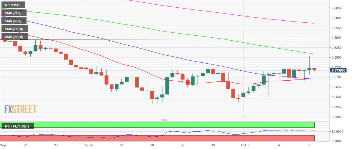 NZD/USD membalik seluruh kenaikan yang dipimpin RBNZ, karena USD pulih. RBNZ menaikkan suku bunga hawkish 50 bp pada pertemuan Oktober. NZD gagal mempertahankan kenaikan di atas 0,5800. NZD/USD telah berubah netral pada hari ini di sekitar 0,5735, membalik seluruh reli yang dipicu oleh hasil kenaikan suku bunga RBNZ di atas 0,5800. Rebound Dolar AS secara luas di tengah sentimen pasar yang beragam dan kecemasan data pekerjaan pra-Amerika, membatasi kenaikan spot ini. Lebih lanjut, pasar menilai pengumuman kenaikan suku bunga RBNZ hawkish, terutama setelah bank sentral mengatakan bahwa mereka berdebat mengenai kenaikan suku bunga 50 bp atau 75 bp. Bank sentral Selandia Baru menaikkan kebijakan suku bunga sebesar 50 bp, seperti yang diharapkan secara luas. Dalam reaksi langsung terhadap putusan RBNZ, NZD/USD menguat hampir 80 pip dari 0,5730 ke level tertinggi 0,5807. Perhatian sekarang beralih ke laporan pekerjaan ADP AS dan IMP Jasa ISM untuk dorongan perdagangan baru pada pasangan ini. Dari perspektif teknikal jangka pendek, Simple Moving Average (SMA) 100 bearish membatasi kenaikan NZD/USD di dekat 0,5815. Meskipun pembeli tetap berharap selama support solid di 0,5690 dipertahankan. Perhatikan bahwa SMA 21 melintasi SMA 50 untuk kenaikan, memvalidasi bull cross pada jangka waktu tersebut. Relative Strength Index (RSI) bertahan di atas garis tengah, menunjukkan bahwa setiap pullback harga dapat dilihat sebagai peluang pembelian dip yang baik. Terobosan di atas SMA 100 akan menyerukan pengujian resistensi garis tren horizontal berikutnya di sekitar 0,5885. Pada sisi negatif, penjual akan menargetkan level bulat 0,5650 jika support kuat yang disebutkan di atas di 0,5690 menghasilkan. NZD/USD: Grafik empat jam Level Teknis NZD/USD Tinjauan Harga terakhir hari ini 0.5735 Perubahan harian hari ini 6 Perubahan harian hari ini % 0.10 Pembukaan harian hari ini 0.5729 Tren SMA 20 Harian 0.5873 SMA 50 Harian 0.6092 SMA 100 Harian 0.6202 SMA 200 Harian 0.6463 Level Tinggi Harian Sebelumnya 0.5759 Rendah Harian Sebelumnya 0.568 Tinggi Mingguan Sebelumnya 0.5755 Rendah Mingguan Sebelumnya 0.5565 Tinggi Bulanan Sebelumnya 0.6162 Rendah Bulanan Sebelumnya 0.5565 Fibonacci Harian 38,2% 0.5729 Fibonacci Harian 61,8% 0.571 Pivot Point Harian S1 0.5686 Pivot Point Harian S2 0.5644 Pivot Point Harian S3 0.5607 Pivot Point Harian R1 0.5765 Pivot Point Harian R2 0.5802 Pivot Point Harian R3 0.5844