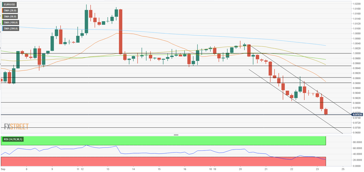 EUR/USD diperdagangkan jauh di wilayah negatif di bawah 0,9800. Aliran safe-haven terus mendominasi pasar keuangan menjelang akhir pekan. DXY bertahan di atas 112,00 jelang data IMP S&P Global. EUR/USD menghapus sebagian kecil penurunan hariannya setelah menyentuh level terendah dalam dua dekade di 0,9737 sebelumnya hari ini. Pasangan mata uang ini terakhir terlihat diperdagangkan di 0,9770, di mana masih turun 0,65% pada basis harian. Untuk minggu ini, EUR/USD turun lebih dari 2%. Data dari kawasan euro dan Jerman menunjukkan bahwa aktivitas bisnis di sektor swasta terus mengalami penurunan pada laju yang meningkat pada awal September. IMP Komposit S&P Global untuk zona euro dan Jerman masing-masing turun ke 48,2 dan 45,9. Sementara itu, dolar terus diuntungkan oleh aliran safe-haven dan memberikan tekanan bearish tambahan pada EUR/USD. Pada saat penulisan, Indeks Euro Stoxx 600 turun 2% hari ini dan indeks saham berjangka AS turun antara 1,1% dan 0,9%. Di sesi ini, S&P Global akan merilis data IMP Manufaktur dan Jasa untuk AS. Inversor memperkirakan IMP Jasa tetap jauh di bawah 50 dan IMP Manufaktur bertahan di atas 51. Terakhir, Ketua FOMC Jerome Powell akan berbicara di acara virtual Fed Listens yang diselenggarakan oleh Federal Reserve Bank of Dallas pada pukul 18:00 GMT (Sabtu, 01:00 WIB). level-level teknis EUR/USD Tinjauan Harga terakhir hari ini 0.9771 Perubahan harian hari ini -0.0060 Perubahan harian hari ini % -0.61 Pembukaan harian hari ini 0.9831 Tren SMA 20 Harian 0.9978 SMA 50 Harian 1.0088 SMA 100 Harian 1.0292 SMA 200 Harian 1.0703 Level Tinggi Harian Sebelumnya 0.9908 Rendah Harian Sebelumnya 0.9807 Tinggi Mingguan Sebelumnya 1.0198 Rendah Mingguan Sebelumnya 0.9945 Tinggi Bulanan Sebelumnya 1.0369 Rendah Bulanan Sebelumnya 0.9901 Fibonacci Harian 38,2% 0.9845 Fibonacci Harian 61,8% 0.9869 Pivot Point Harian S1 0.9789 Pivot Point Harian S2 0.9748 Pivot Point Harian S3 0.9689 Pivot Point Harian R1 0.989 Pivot Point Harian R2 0.9949 Pivot Point Harian R3 0.999