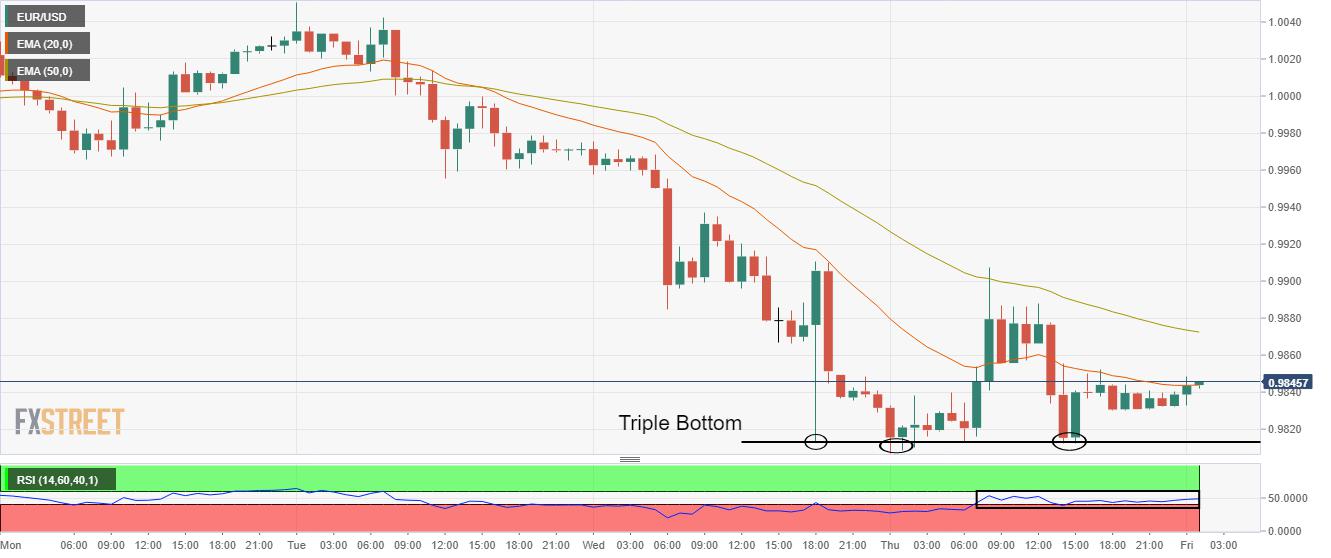 Pembentukan Triple Bottom menunjukkan tanda-tanda hilangnya momentum penurunan. Para pembeli Zona Euro mencoba untuk melewati EMA 20 di 0,9843. Perpanjangan pemulihan aset akan mengirimnya menuju paritas. Pasangan EUR/USD melelang dalam profil pasar yang seimbang setelah aksi beli responsif dari 0,9812 di sesi Asia. Pada catatan yang lebih luas, aset tetap berada dalam cengkeraman para penjual tetapi sekarang menunjukkan tanda-tanda kelelahan pada sisi negatifnya. Aset telah memberikan penembusan ke sisi atas dari konsolidasi yang terbentuk dalam kisaran sempit 0.9829-0.9841 di sesi Tokyo. Pada skala per jam, para pembeli mata uang bersama menunjukkan semacam kekuatan karena aset ini telah membangun batas bawah di atas 0,9800. Pengujian 0,9800 telah membentuk pola grafik triple bottom yang mengindikasikan pembalikan bullish setelah tren turun jangka panjang. Aset ini mencoba untuk melewati rintangan Exponential Moving Average (EMA) 20 periode di 0,9843, yang akan memperkuat para pembeli Euro. Sementara itu, EMA-50 di 0,9872 masih jauh dari jangkauan, yang diperlukan untuk ditaklukkan. Sementara itu, Relative Strength Index (RSI) (14) berosilasi dalam kisaran 40,00-60,00, yang mengindikasikan bahwa momentum kenaikan belum terpicu. Penembusan ke sisi atas dari level tertinggi hari Kamis di 0,9907 akan mengirim aset ini menuju level terendah hari Selasa di 0,9955, diikuti oleh paritas. Di sisi lain, para pembeli greenback dapat memperketat cengkeraman lebih lanjut jika aset turun di bawah level terendah hari Kamis di 0,9807, yang akan menyeret aset ini menuju level terrendah 14 Oktober 2002 di 0,9695. Penurunan di bawah level yang terakhir ini akan menjadi level terendah baru dua dekade di 0,9600. Grafik Per Jam EUR/USD Level-Level Teknis EUR/USD Tinjauan Harga terakhir hari ini 0.9846 Perubahan harian hari ini 0.0015 Perubahan harian hari ini % 0.15 Pembukaan harian hari ini 0.9831 Tren SMA 20 Harian 0.9978 SMA 50 Harian 1.0088 SMA 100 Harian 1.0292 SMA 200 Harian 1.0703 Level Tinggi Harian Sebelumnya 0.9908 Rendah Harian Sebelumnya 0.9807 Tinggi Mingguan Sebelumnya 1.0198 Rendah Mingguan Sebelumnya 0.9945 Tinggi Bulanan Sebelumnya 1.0369 Rendah Bulanan Sebelumnya 0.9901 Fibonacci Harian 38,2% 0.9845 Fibonacci Harian 61,8% 0.9869 Pivot Point Harian S1 0.9789 Pivot Point Harian S2 0.9748 Pivot Point Harian S3 0.9689 Pivot Point Harian R1 0.989 Pivot Point Harian R2 0.9949 Pivot Point Harian R3 0.999