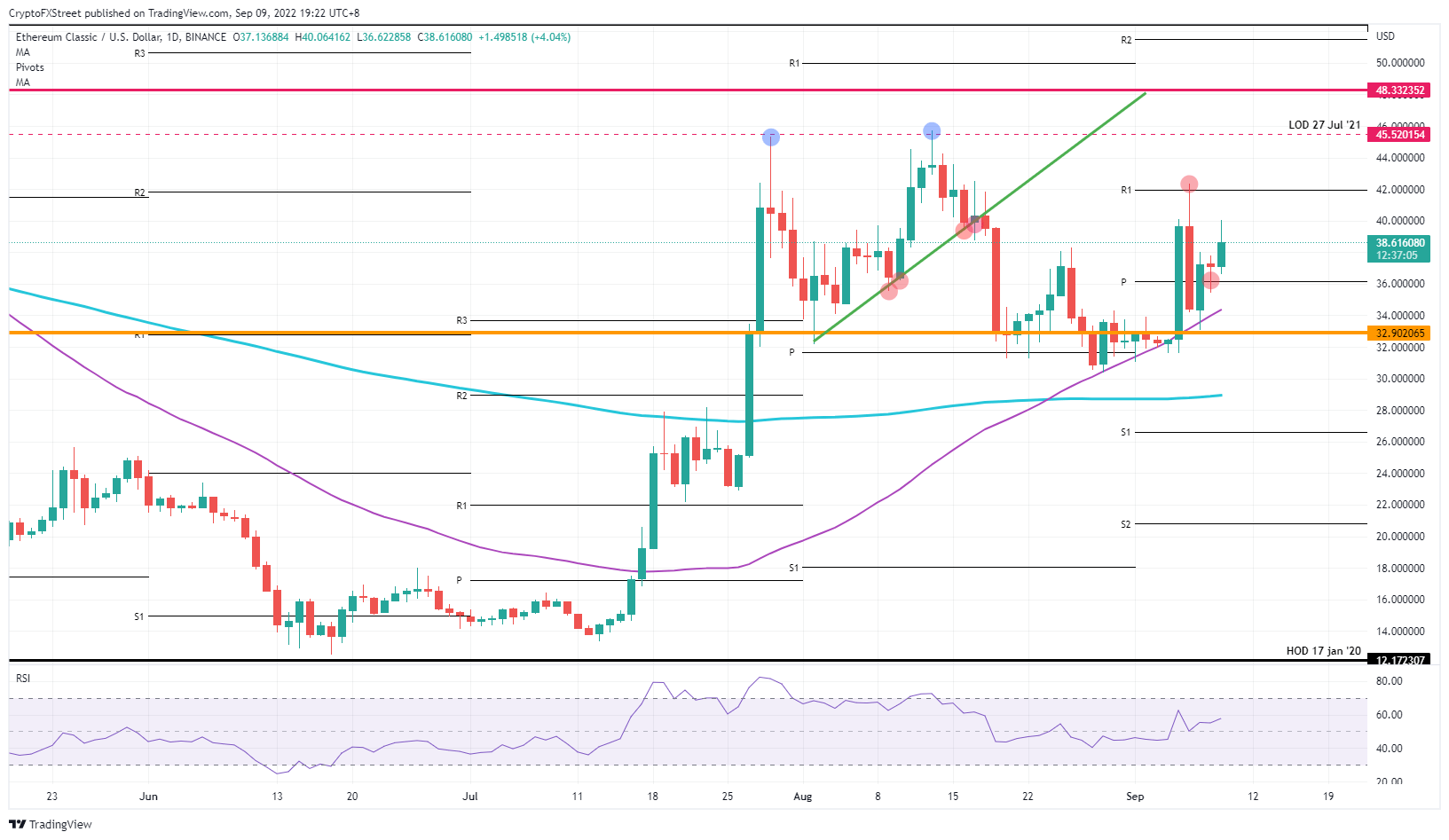 Ethereum Classic bergerak lebih tinggi pada hari inikarena dolar memudar. ETC bergerak lebih tinggi karena risiko membayangi bahwa Senin bisa menjadi perdagangan seperti biasa untuk penguatan dolar. Harapkan ini menjadi jendela kecil peluang bagi mata uang kripto untuk membukukan keuntungan, karena ini hanyalah karena terpengaruh 'peristiwa besar'. Ethereum Classic (ETC) bergerak lebih tinggi karena beberapa pergerakan besar di pasar, terutama dolar yang melemah, sehingga memicu pergerakan countercyclical saat ekuitas naik dan mata uang kripto kembali disukai. Para pedagang harus mengingat kembali apa yang telah terjadi pada hari-hari perdagangan lainnya dalam pekan ini. Dengan wafatnya Ratu Elisabeth, beberapa bank dan hedge fund Asia dan Eropa terpaksa mengikuti skenario risiko yang dipicu setelah terjadinya peristiwa utama seperti perang, serangan teroris atau kematian seorang negarawan yang diketahui sebelumnya, yang terjadi di sini. ETC akan diperdagangkan kembali pada $32,90 setelah keadaan kembali tenang Ethereum Classic telah ditarik ke atas dalam lingkungan yang melihat penjualan dolar yang besar karena bank dan dana lindung nilai dipaksa untuk menghapus sedikit atau sebagian dari posisi mereka akibat wafatnya Ratu Elizabeth tadi malam. Meninggalnya seorang negarawan besar biasanya akan menyebabkan manajer risiko menuntut dana mereka dan bank mengurangi saldo mereka karena meningkatnya risiko perubahan pasar yang besar. Bayangkan jika sebuah laporan keluar bahwa misalnya Ratu dibunuh? Itu akan mengejutkan pasar dan memicu kekuatan dolar besar-besaran. Harga ETC bergerak berlawanan arah dengan tren sebelumnya karena sebagian besar bank dan dana dalam aksi beli yang kuat dalam dolar AS dan perlu melepas posisi mereka dalam waktu yang cukup singkat. Penjualan besar greenback, oleh karena itu, telah membuka ruang untuk kenaikan lebih lanjut bagi ekuitas dan mata uang kripto. Jendela peluang terlihat cukup sempit karena pound sterling sudah mengurangi kenaikan dan tampaknya akan turun kembali ke levelnya dari awal pekan ini, pada Senin depan, dengan demikian, hal yang sama kemungkinan akan terjadi pada harga ETC, karena level $40 terlihat seperti tingkat maksimum yang akan dicapai. Grafik harian ETC/USD Lebih banyak kenaikan dapat diberikan, tentu saja, tetapi kemudian level support akan bertahan selama akhir pekan tanpa gangguan lebih lanjut. Level yang paling penting adalah $36, pada pivot bulanan. Jika level itu bertahan selama akhir pekan dan masih menghasilkan pembukaan positif pada hari Senin, maka mengharapkan untuk melihat $40 atau $45 dicetak pada Senin malam.