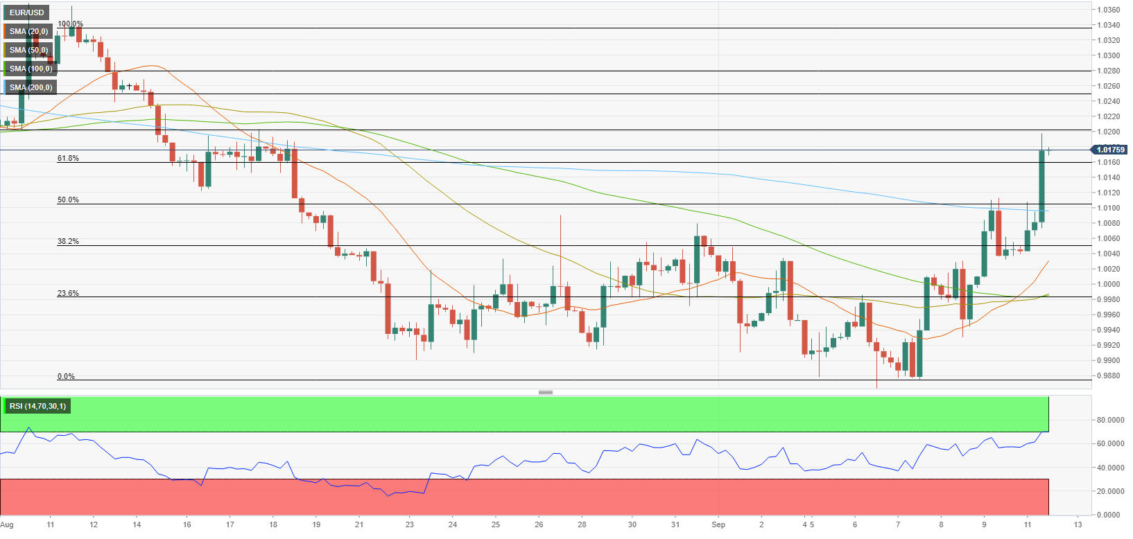 EUR/USD melanjutkan pemulihan ke level tertinggi 3 pekan di atas 1,0100. Kenaikan lebih lanjut ada di depan setelah garis resistensi 7 bulan ditembus. EUR/USD mendapatkan kembali traksi naik dan naik ke level melampaui 1,0100, atau tertinggi multi-pekan, pada hari Jumat. Kenaikan lebih lanjut saat ini akan menemui rintangan sementara di SMA 55-hari di 1,0152 menjelang garis resistensi 7-bulan, hari ini di dekat 1,0200, area yang juga bertepatan dengan penghalang naik minor di 1,0202 (17 Agustus). Pasangan ini akan melihat tekanan turunnya berkurang setelah wilayah ini ditembus. Dalam jangka panjang, pandangan bearish pasangan ini diperkirakan akan berlaku selama diperdagangkan di bawah SMA 200-hari di 1,0760. Grafik harian EUR/USD Level Teknis EUR/USD Tinjauan Harga terakhir hari ini 1.0047 Perubahan harian hari ini 50 Perubahan harian hari ini % 0.50 Pembukaan harian hari ini 0.9997 Tren SMA 20 Harian 1.0026 SMA 50 Harian 1.0128 SMA 100 Harian 1.0354 SMA 200 Harian 1.0769 Level Tinggi Harian Sebelumnya 1.003 Rendah Harian Sebelumnya 0.9931 Tinggi Mingguan Sebelumnya 1.0079 Rendah Mingguan Sebelumnya 0.9911 Tinggi Bulanan Sebelumnya 1.0369 Rendah Bulanan Sebelumnya 0.9901 Fibonacci Harian 38,2% 0.9969 Fibonacci Harian 61,8% 0.9992 Pivot Point Harian S1 0.9941 Pivot Point Harian S2 0.9886 Pivot Point Harian S3 0.9842 Pivot Point Harian R1 1.0041 Pivot Point Harian R2 1.0085 Pivot Point Harian R3 1.014
