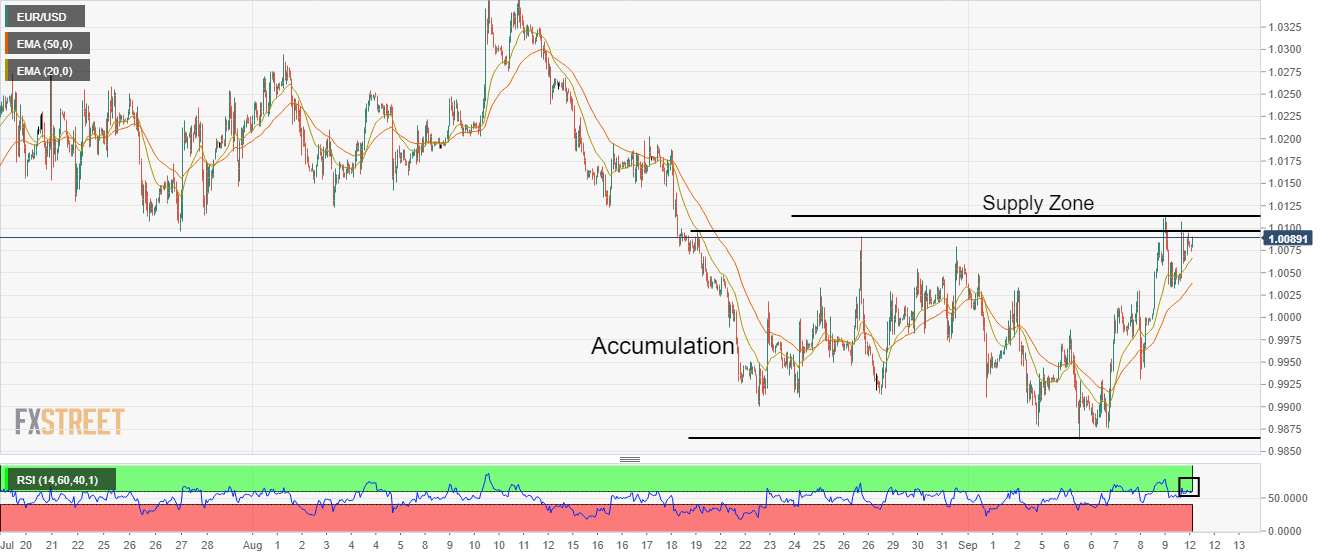 Akumulasi yang berkepanjangan akan diikuti oleh fase markup ke depan. Pembeli mata uang bersama menunggu terobosan di atas zona pasokan 1,0097-1,0114 untuk reli baru. EMA 20 dan 50 naik menambah filter sisi atas. Pasangan EUR/USD menunjukkan kinerja yang kurang bersemangat di sesi Asia karena investor telah bergeser sideline menjelang data inflasi AS. Aset ini berosilasi dalam kisaran sempit 1,0061-1,0104 dan diperkirakan akan melanjutkan kinerja kisaran terbatasnya. Mata uang utama tetap berada dalam cengkeraman pembeli selama sepekan terakhir setelah mencetak level terendah multi-tahun di bawah 0,9900. Pada grafik per jam, aset ini melayang di sekitar zona pasokan, ditempatkan dalam kisaran 1,0097-1,0114. Akumulasi yang berkepanjangan dalam kisaran 0,9864-1,0097 menunjukkan transfer aset dari peserta ritel ke investor institusional. Hal ini juga berfungsi sebagai pembalikan bullish dan menghasilkan kenaikan tipis ke depan. Terobosan fase akumulasi menghasilkan fase markup ke depan. Exponential Moving Averages (EMA) 20 dan 50 periode masing-masing di 1,0066 dan 1,0040 bergerak naik lebih tinggi, yang menambah filter sisi atas. Selain itu, Relative Strength Index (RSI) (14) mencoba untuk bergeser ke dalam kisaran bullish 60,00-80,00, yang akan memperkuat pembeli mata uang bersama lebih lanjut. Terobosan yang menentukan di atas zona pasokan kisaran 1,0097-1,0114 akan mendorong aset menuju level tertinggi 17 Agustus di 1,0203, diikuti oleh level tertinggi 21 Juli di 1,0278. Atau, pembeli mata uang bersama akan kehilangan cengkeramannya jika aset turun di bawah level terendah 26 Agustus di 0,9947. Jika itu terjadi, maka aset dapat turun lebih jauh menuju level terendah hari Senin di 0,9878 dan support level bulat di 0,9800. Grafik per jam EUR/USD Level Teknis EUR/USD Tinjauan Harga terakhir hari ini 1.0092 Perubahan harian hari ini 49 Perubahan harian hari ini % 0.49 Pembukaan harian hari ini 1.0043 Tren SMA 20 Harian 1.0015 SMA 50 Harian 1.012 SMA 100 Harian 1.0346 SMA 200 Harian 1.0763 Level Tinggi Harian Sebelumnya 1.0114 Rendah Harian Sebelumnya 0.9996 Tinggi Mingguan Sebelumnya 1.0114 Rendah Mingguan Sebelumnya 0.9864 Tinggi Bulanan Sebelumnya 1.0369 Rendah Bulanan Sebelumnya 0.9901 Fibonacci Harian 38,2% 1.0068 Fibonacci Harian 61,8% 1.0041 Pivot Point Harian S1 0.9988 Pivot Point Harian S2 0.9933 Pivot Point Harian S3 0.987 Pivot Point Harian R1 1.0106 Pivot Point Harian R2 1.0169 Pivot Point Harian R3 1.0224