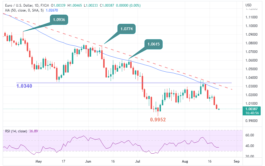 Ekonomi terbesar Eropa, Jerman, memulai semester kedua tahun ini dengan catatan lemah, karena ekspor negara itu di luar Uni Eropa (UE) turun 7,6% pada bulan Juli, kata Kantor Statistik Federal pada hari Senin. Kutipan utama (melalui Reuters) “Amerika Serikat tetap menjadi mitra dagang terpenting bagi eksportir Jerman di bulan Juli, dengan ekspor barang ke pasar AS naik 14,9% tahun ini.“ “Ekspor ke Tiongkok naik 6,1% tahun ini. Ekspor ke Rusia turun 56,0% pada tahun ini.” “Ekonomi Jerman menjadi lebih bergantung pada Tiongkok pada semester pertama 2022.” Selama akhir pekan, Presiden Bundesbank Joachim Nagel mengatakan bahwa ekonomi Jerman "kemungkinan" akan mengalami resesi selama musim dingin jika krisis energi (khususnya Rusia memangkas pasokan gas) berlanjut semakin dalam. Reaksi pasar EUR/USD terakhir terlihat diperdagangkan di 1,0016, turun 0,16% hari ini, dirusak oleh krisis gas yang sedang berlangsung dan penguatan dolar AS berbasis luas.