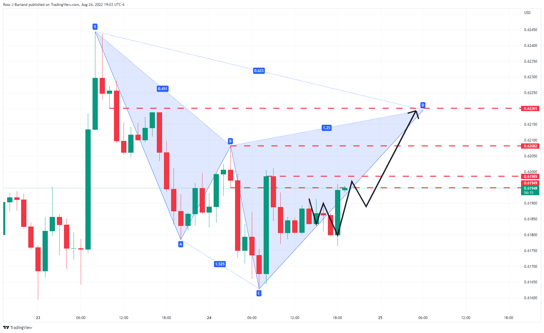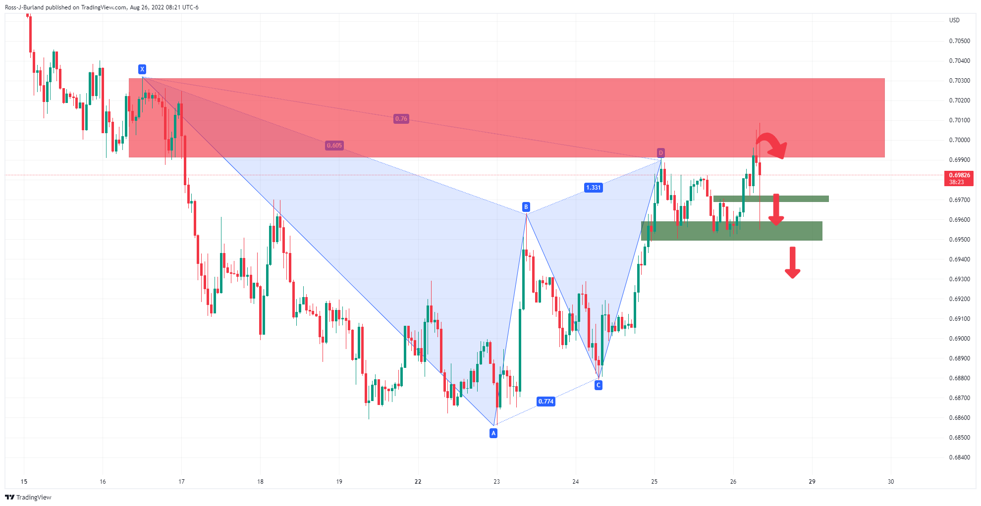 AUD/USD turun dan naik di sekitar pidato Powell. Pola harmonik per jam bearish dan fokusnya adalah ke sisi bawah ketika di bawah 0,7000. Pidato hawkish Federal Reserve Jerome Powell telah mengirim penawaran beli pada dolar AS dan telah mengguncang pasar keuangan dengan saham turun dan imbal hasil obligasi naik. Mengingat status beta yang tinggi, dolar Australia turun drastis, turun sekitar 35 pips. Pada saat penulisan, AUD/USD kembali diperdagangkan di 0,699, memulihkan semua penurunan yang terjadi sekitar 15 menit setelah pidato, tetapi jatuh ke terendah 0,6951. Dolar Australia kembali diperdagangkan menuju tertinggi hari, 0,7005. The Fed bergantung pada data dan Powell mengatakan bahwa ketika ekonomi AS jelas melambat, ia berpendapat ekonomi masih memiliki momentum dasar yang kuat. Misalnya, dan yang terpenting, Powell menjelaskan bahwa ketika "inflasi Juli yang lebih rendah 'disambut dengan baik'," penurunan tersebut "tidak memenuhi yang akan dibutuhkan sebelum kita yakin inflasi bergerak turun." Pasar mencari petunjuk apakah The Fed puas dengan hasil inflasi dalam data akhir-akhir ini, tetapi pidato dari Powell tidak menunjukkan bukti terkait hal itu. Dia memang mengatakan bahwa ''ketika kebijakan semakin ketat, akan tepat untuk menghentikan laju kenaikan suku bunga pada suatu waktu,'' namun, itu masih jauh. Sebaliknya, ia berpendapat bahwa ''memulihkan stabilitas harga kemungkinan akan perlu mempertahankan sikap kebijakan yang membatasi untuk 'beberapa waktu'''. Akibatnya, Fed funds futures menunjukkan kemungkinan kenaikan 75bp pada bulan September sekarang 56,5% dibandingkan 46,5% sebelumnya pidato Powell. Sementara itu, dolar AS mengkonsolidasikan pergerakan di sekitar terendah. DXY, indeks yang mengukur greenback melawan sekeranjang mata uang turun 0,6%, turun dari 108,753, mencetak terendah 107,588 sejauh hari ini. Jika penjual tetap bermain, AUD harus berjuang untuk bergerak jauh lebih tinggi dan tetap tertekan di bawah 0,70. Analisis teknis AUD/USD Pola harmonik per jam bearish dengan harga bertemu resistance di zona penawaran jual di sekitar area Fibonacci 78,6% dari kisaran XA. Sementara itu, support terlihat di 0,6970 menjaga 0,6950. Sell-off bisa diharapkan di bawahnya menuju 0,69.