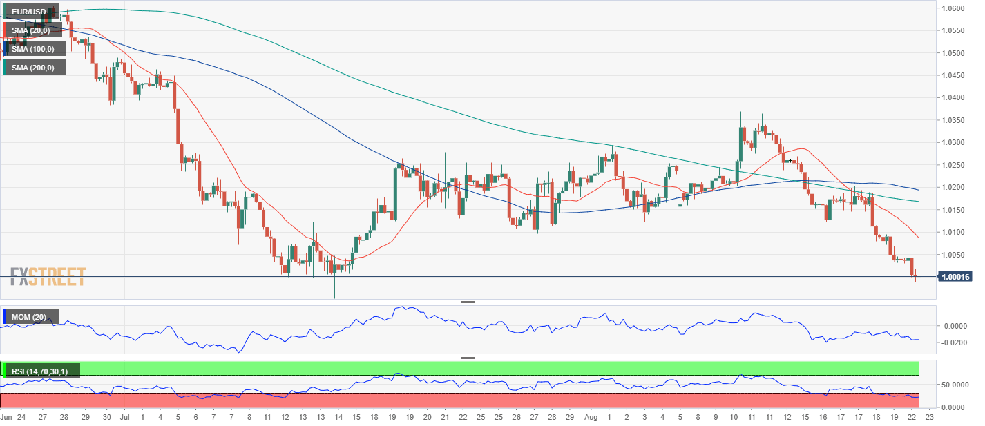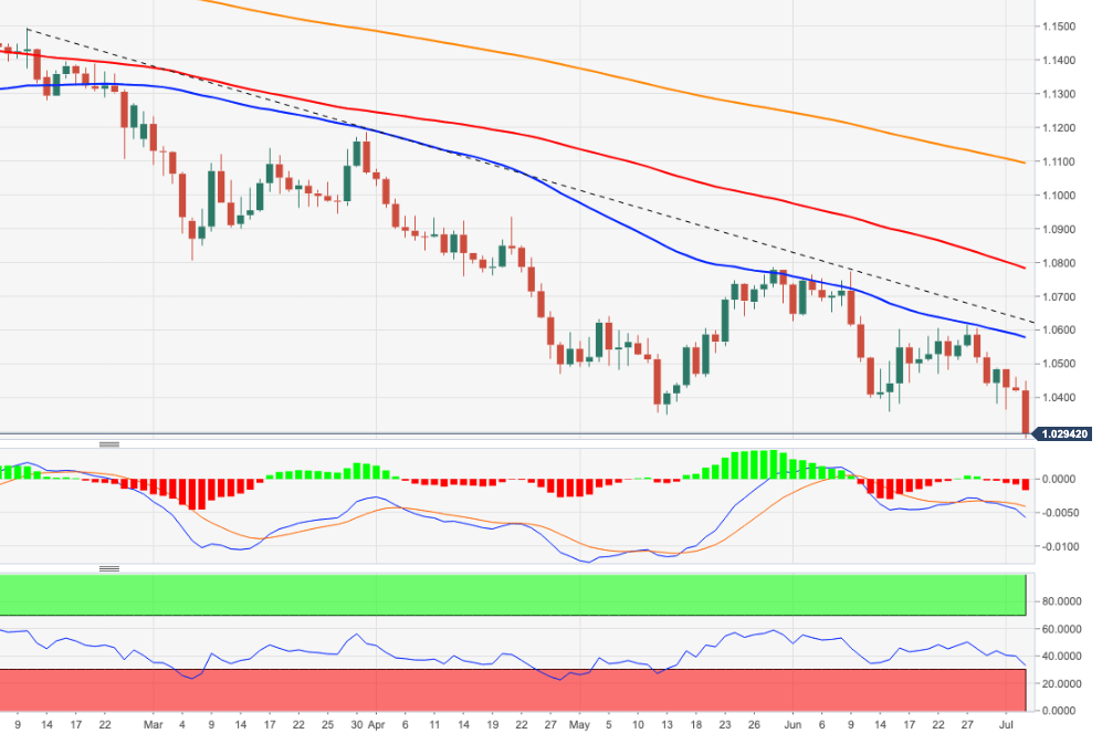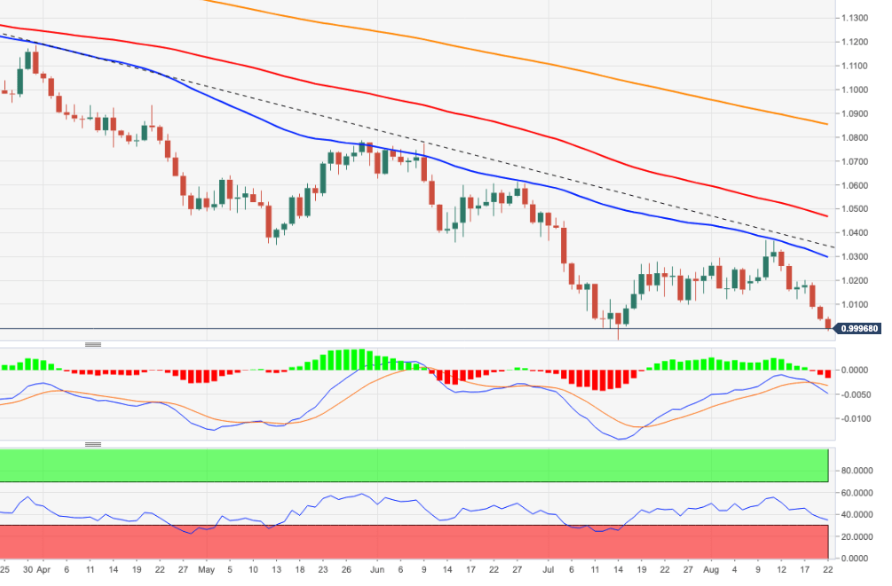 EUR/USD melanjutkan penurunan di bawah zona paritas. Retracement yang lebih dalam dapat melihat 2022 di pertengahan 0,9900-an diuji ulang. EUR/USD menembus di bawah level paritas untuk meraih posisi terendah baru 6-pekan di awal pekan ini. Penurunan lebih lanjut memungkinkan untuk saat ini. Terhadap itu, pasangan ini dapat menghadapi level terendah 2022 di 0,9952 (14 Juli) jika terjadi terobosan meyakinkan dari wilayah paritas. Dalam jangka panjang, pandangan bearish pasangan ini diperkirakan akan berlaku selama diperdagangkan di bawah SMA 200 hari di 1,0852. Grafik harian EUR/USD Level Teknis EUR/USD Tinjauan Harga terakhir hari ini 1.0004 Perubahan harian hari ini -34 Perubahan harian hari ini % -0.34 Pembukaan harian hari ini 1.0038 Tren SMA 20 Harian 1.0195 SMA 50 Harian 1.0276 SMA 100 Harian 1.0478 SMA 200 Harian 1.0861 Level Tinggi Harian Sebelumnya 1.0096 Rendah Harian Sebelumnya 1.0032 Tinggi Mingguan Sebelumnya 1.0268 Rendah Mingguan Sebelumnya 1.0032 Tinggi Bulanan Sebelumnya 1.0486 Rendah Bulanan Sebelumnya 0.9952 Fibonacci Harian 38,2% 1.0056 Fibonacci Harian 61,8% 1.0071 Pivot Point Harian S1 1.0015 Pivot Point Harian S2 0.9992 Pivot Point Harian S3 0.9952 Pivot Point Harian R1 1.0078 Pivot Point Harian R2 1.0119 Pivot Point Harian R3 1.0142