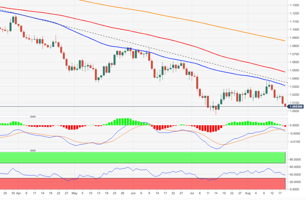 EUR/USD melanjutkan penurunan ke kisaran 1,0050/45. Yang selanjutnya di sisi bawah adalah uji potensial zona paritas. EUR/USD menambah pelemahan baru-baru ini dan melanjutkan penembusan level 1,0100 pada akhir minggu. Penurunan lebih lanjut tampak mungkin serta kemungkinan kunjungan ke level paritas dalam jangka pendek. Penembusan zona support utama tersebut dapat mengekspos kemunduran yang lebih dalam ke terendah tahun di 0,9952 (14 Juli). Dalam jangka lebih panjang, pandangan bearish pasangan mata uang ini diperkirakan akan bertahan selama diperdagangkan di bawah SMA 200-hari di 1,0859. Grafik harian EUR/USD level-level teknis EUR/USD Tinjauan Harga terakhir hari ini 1.0055 Perubahan harian hari ini -0.0034 Perubahan harian hari ini % -0.34 Pembukaan harian hari ini 1.0089 Tren SMA 20 Harian 1.0203 SMA 50 Harian 1.0286 SMA 100 Harian 1.0488 SMA 200 Harian 1.0868 Level Tinggi Harian Sebelumnya 1.0193 Rendah Harian Sebelumnya 1.008 Tinggi Mingguan Sebelumnya 1.0369 Rendah Mingguan Sebelumnya 1.0159 Tinggi Bulanan Sebelumnya 1.0486 Rendah Bulanan Sebelumnya 0.9952 Fibonacci Harian 38,2% 1.0123 Fibonacci Harian 61,8% 1.015 Pivot Point Harian S1 1.0048 Pivot Point Harian S2 1.0007 Pivot Point Harian S3 0.9935 Pivot Point Harian R1 1.0162 Pivot Point Harian R2 1.0234 Pivot Point Harian R3 1.0275