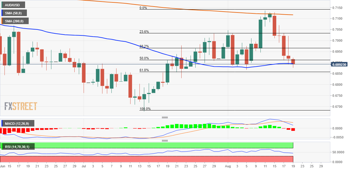 AUD/USD turun ke terendah dua minggu pada hari Jumat di tengah aksi beli USD yang kuat. Impuls risk-off memberikan tekanan ke bawah tambahan pada dolar Australia yang sensitif terhadap risiko. Pedagang bearish sekarang menunggu pelemahan di bawah terendah bulanan sebelum menempatkan taruhan baru. Pasangan AUD/USD memperpanjang penurunan tajam baru-baru ini dari SMA 200-hari yang signifikan secara teknis dan melayang lebih rendah untuk hari kelima berturut-turut pada hari Jumat. Lintasan ke bawah menyeret harga spot ke terendah dua minggu, di sekitar wilayah 0,6875 selama pertengahan sesi Eropa. Dolar AS melanjutkan tren bullish yang disaksikan selama satu setengah minggu terakhir atau lebih dan naik ke tertinggi satu bulan pada hari perdagangan terakhir minggu ini. Itu ternyata menjadi faktor utama yang terus memberikan tekanan ke bawah pada pasangan AUD/USD. Selain itu, kekhawatiran resesi memicu gelombang baru penghindaran risiko global dan selanjutnya berkontribusi mendorong arus menjauh dari dolar Australia yang dianggap lebih berisiko. Dari sudut pandang teknis, penerimaan di bawah level retracement Fibonacci 50% dari pemulihan Juli-Agustus dari terendah lebih dari dua tahun mendukung pedagang bearish. Prospek negatif diperkuat oleh oscillator bearish pada grafik harian yang masih jauh dari area oversold. Meskipun demikian, kegagalan untuk menemukan penerimaan di bawah SMA 50-hari membenarkan kehati-hatian sebelum memposisikan diri untuk penurunan lebih lanjut. Oleh karena itu, beberapa tindak lanjut aksi jual di bawah swing low bulanan, di sekitar wilayah 0,6870-0,6865, yang bertepatan dengan level Fibo. 61,8%, diperlukan untuk mengkonfirmasi penembusan bearish baru. Pasangan AUD/USD kemudian mungkin menguji 0,6800 dan akhirnya turun ke zona horizontal 0,6765. Tren bearish dapat berlanjut menuju angka bulat 0,6700 sebelum terendah tahun, di sekitar wilayah 0,6680 yang diraih pada 14 Juli. Di sisi lain, pemulihan signifikan di atas level Fibo. 50% sekarang dapat dilihat sebagai peluang jual dan tetap dibatasi di dekat swing high semalam, di sekitar area 0,6970. Area 0,6970 bertepatan dengan level Fibo. 38,2% dan diikuti oleh level psikologis 0,7000. Penembusan meyakinkan level tersebut akan meniadakan prospek negatif jangka pendek dan memicu short-covering. Grafik harian AUD/USD level-level teknis AUD/USD Tinjauan Harga terakhir hari ini 0.6893 Perubahan harian hari ini -0.0025 Perubahan harian hari ini % -0.36 Pembukaan harian hari ini 0.6918 Tren SMA 20 Harian 0.6985 SMA 50 Harian 0.6923 SMA 100 Harian 0.7063 SMA 200 Harian 0.7144 Level Tinggi Harian Sebelumnya 0.7021 Rendah Harian Sebelumnya 0.6892 Tinggi Mingguan Sebelumnya 0.7137 Rendah Mingguan Sebelumnya 0.6898 Tinggi Bulanan Sebelumnya 0.7033 Rendah Bulanan Sebelumnya 0.668 Fibonacci Harian 38,2% 0.6941 Fibonacci Harian 61,8% 0.6972 Pivot Point Harian S1 0.6866 Pivot Point Harian S2 0.6814 Pivot Point Harian S3 0.6737 Pivot Point Harian R1 0.6996 Pivot Point Harian R2 0.7073 Pivot Point Harian R3 0.7125