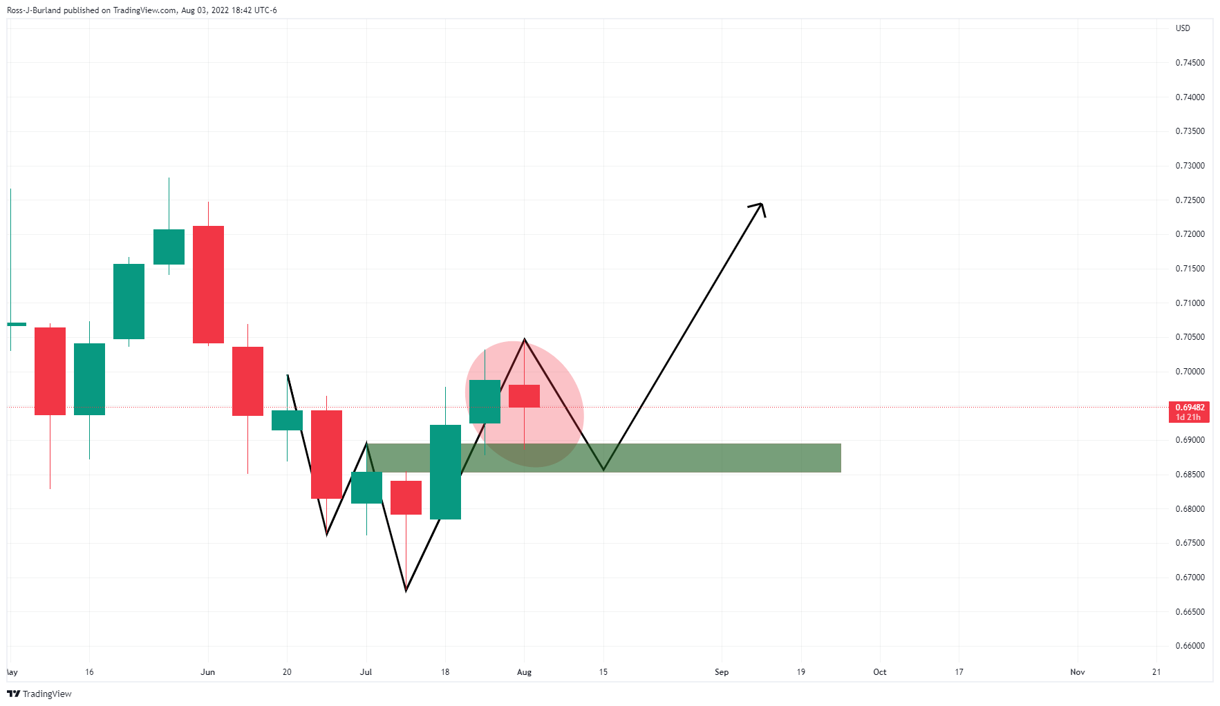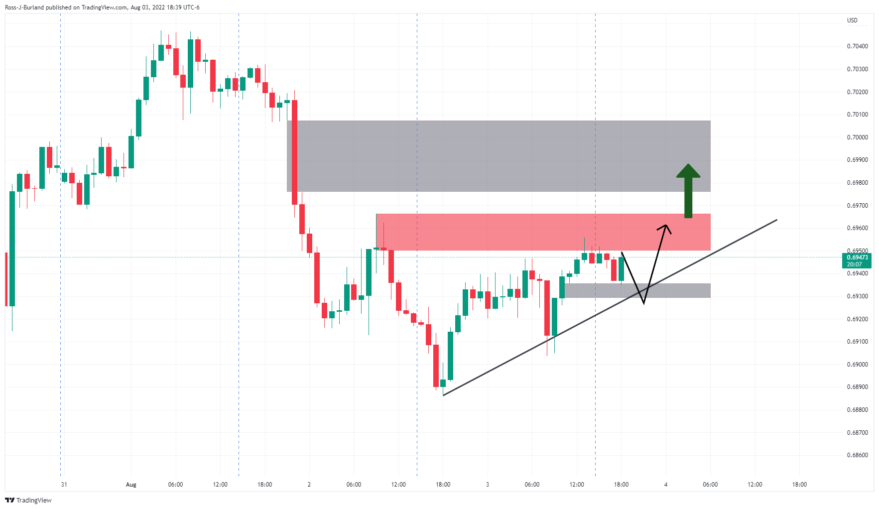 Para pembeli AUD/USD bergerak masuk, dengan fokus pada penembusan resistance. Di atas sana, ada risiko ke 0,7000 untuk mengurangi ketidakseimbangan harga di atas antara 0,6975 dan 0,7007. AUD/USD naik menjelang data Neraca Perdagangan hari ini. Pada 0,6950, harga naik ke area hijau pada saat penulisan setelah naik dari level terendah 0,6935. Berikut ini menggambarkan bias bullish dari perspektif jangka panjang dan menyoroti struktur pasar menjelang data dari tampilan per jam. Grafik Mingguan AUD/USD, Analisis Sebelumnya Sesuai analisis sebelumnya, para pembeli mencoba menarik diri dengan dokus tertuju pada 0,7000-an, formasi W telah menarik harga untuk koreksi sementara: Masih ada sesi yang harus dilalui hingga akhir minggu, tetapi sejauh ini, harga telah megoreksi kembali ke garis leher, sehingga fokus sekarang dapat kembali ke atas. Grafik 1 Jam AUD/USD Harga terjebak di antara garis tren pendukung dan resistance horizontal. Ada ketidakseimbangan harga yang akan dikurangi pada waktunya, berpotensi paling cepat dalam jam ke depan, tetapi selama garis tren bertahan, fokusnya adalah pada sisi atas. Penembusan resistance membuka risiko ke 0,7000 untuk mengurangi ketidakseimbangan harga di atas antara 0,6975 dan 0,7007.