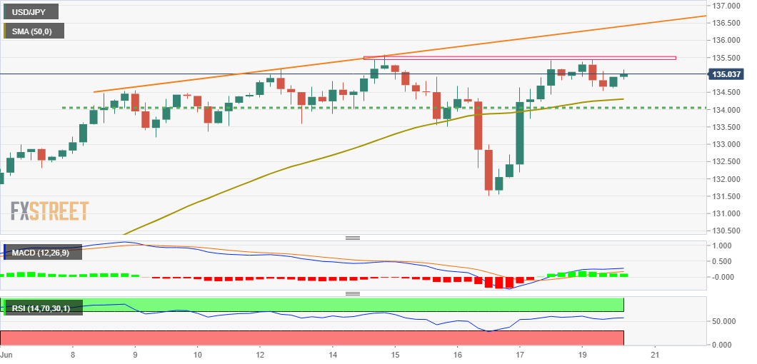 USD/JPY melesat ke tertinggi lebih dari satu minggu sebagai reaksi terhadap laporan NFP yang optimis untuk bulan Juni. Perbedaan rate AS-Jepang yang melebar membebani JPY dan tetap mendukung USD/JPY. Latar belakang fundamental mendukung prospek pergerakan menuju 137,00. Pasangan USD/JPY memulihkan penguatan sebelumnya yang hilang ke area 135,30 dan berubah positif untuk hari kelima berturut-turut pada hari Jumat. Kenaikan intraday mempercepat laju selama awal sesi Amerika Utara dan mendorong harga spot ke tertinggi lebih dari satu minggu, di sekitar wilayah 136,55. Dolar AS berdiri tegak di dekat tertinggi dua dekade setelah laporan tenaga kerja bulanan AS menunjukkan ekonomi AS menambahkan 372 ribu pekerjaan pada bulan Juni, jauh lebih besar dari antisipasi 268 ribu. NFP yang optimis disertai dengan tingkat Pengangguran yang stabil, yang mencapai 3,6% untuk bulan pelaporan. Selain itu, Presiden Fed Atlanta Raphael Bostic mendukung kasus kenaikan suku bunga 75 bps pada pertemuan FOMC mendatang Juli ini. Berbicara kepada CNBC, Bostic – salah satu pembuat kebijakan paling dovish – mengatakan bahwa The Fed perlu bergerak secara agresif dan inti ekonomi AS masih kuat. Itu, pada gilirannya, mendorong imbal hasil obligasi Pemerintah AS dan semakin memperlebar perbedaan rate AS-Jepang. Terlepas dari itu, divergensi sikap kebijakan yang diadopsi oleh The Fed dan Bank of Japan melemahkan yen Jepang, yang, pada gilirannya, mengangkat pasangan USD/JPY. Namun, pembeli USD tampaknya enggan menempatkan taruhan baru di tengah kondisi yang sedikit meregang, terutama setelah pergerakan bullish kuat baru-baru ini. Itu dilihat sebagai satu-satunya faktor yang membatasi kenaikan signifikan pasangan USD/JPY, setidaknya untuk saat ini. Namun demikian, latar belakang fundamental mendukung prospek untuk bergerak kembali menuju pengujian tertinggi 24 tahun, di sekitar 137,00 yang diraih pada bulan Juni. level-level teknis USD/JPY Tinjauan Harga terakhir hari ini 136.32 Perubahan harian hari ini 0.32 Perubahan harian hari ini % 0.24 Pembukaan harian hari ini 136 Tren SMA 20 Harian 135.3 SMA 50 Harian 131.86 SMA 100 Harian 126.54 SMA 200 Harian 120.35 Level Tinggi Harian Sebelumnya 136.22 Rendah Harian Sebelumnya 135.55 Tinggi Mingguan Sebelumnya 137 Rendah Mingguan Sebelumnya 134.52 Tinggi Bulanan Sebelumnya 137 Rendah Bulanan Sebelumnya 128.65 Fibonacci Harian 38,2% 135.96 Fibonacci Harian 61,8% 135.81 Pivot Point Harian S1 135.63 Pivot Point Harian S2 135.26 Pivot Point Harian S3 134.96 Pivot Point Harian R1 136.3 Pivot Point Harian R2 136.59 Pivot Point Harian R3 136.96