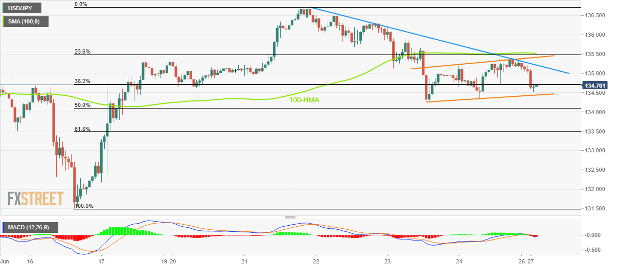 USD/JPY pulih dari level terendah intraday namun tetap berada dalam pantuan para penjual selama tren turun tiga hari. Penembusan tagas sisi bawah dari garis tren lima minggu dan osilator bearish mendukung para penjual. Garis resistance selama dua minggu menantang para pembeli dalam perjalanan mereka ke 140,00. USD/JPY tetap tertekan meskipun pembalikan arah terbaru dari level terendah intraday, di sekitar 135,00 selama sesi Asia hari Senin. Dengan demikian, pasangan Yen pulih dari support 20-DMA di tengah sesi yang lesu. Namun, perdagangan berkelanjutan harga di bawah garis support yang berubah menjadi resistance dari akhir Mei, di sekitar 135,45, bergabung dengan sinyal MACD bearish dan pullback RSI (14) dari wilayah overbought akan menjaga harapan para penjual. Meskipun demikian, penurunan baru membutuhkan konfirmasi dari level 20-DMA di sekitar 134,90. Setelah itu, swing low pertengahan Juni dan 50-DMA dapat memikat para penjual USD/JPY di sekitar 131,50 dan 131,40 sesuai urutan tersebut. Yang juga bertindak sebagai penghalang ke sisi bawah adalah level tinggi April 2022 di sekitar 131,25, penembusan yang dapat dengan mudah mengarahkan USD/JPY menuju level magnet psikologis 130,00. Sebaliknya, pemulihan tetap ambigu hingga melintasi garis resistance 135,45, merupakan support sebelumnya, penembusan level ini dapat mengarahkan para pembeli pasangan mata uang tersebut menuju garis resistance yang menanjak dari 21 Juni, di sekitar 137,10 pada saat berita ini ditulis. Jika USD/JPY berhasil tetap lebih kuat melewati 137,10, yang kemungkinan menyaksikan kenaikan menuju level angka bulat 140,00 tidak dapat dikesampingkan. USD/JPY: Grafik Harian Tren: Diperkirakan akan terjadi pelemahan lebih lanjut Level-Level Teknis USD/JPY Tinjauan Harga terakhir hari ini 135.04 Perubahan harian hari ini -0.17 Perubahan harian hari ini % -0.13 Pembukaan harian hari ini 135.21 Tren SMA 20 Harian 134.79 SMA 50 Harian 131.29 SMA 100 Harian 125.72 SMA 200 Harian 119.86 Level Tinggi Harian Sebelumnya 135.99 Rendah Harian Sebelumnya 134.74 Tinggi Mingguan Sebelumnya 137 Rendah Mingguan Sebelumnya 134.52 Tinggi Bulanan Sebelumnya 137 Rendah Bulanan Sebelumnya 128.65 Fibonacci Harian 38,2% 135.22 Fibonacci Harian 61,8% 135.51 Pivot Point Harian S1 134.64 Pivot Point Harian S2 134.07 Pivot Point Harian S3 133.39 Pivot Point Harian R1 135.88 Pivot Point Harian R2 136.55 Pivot Point Harian R3 137.12