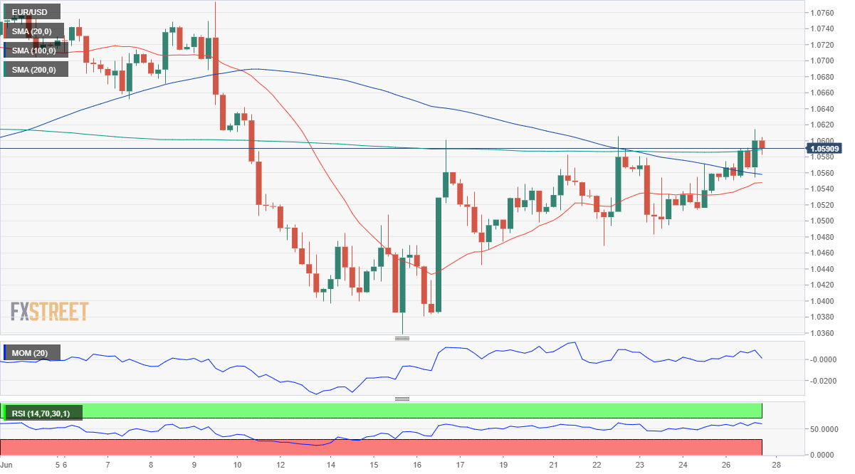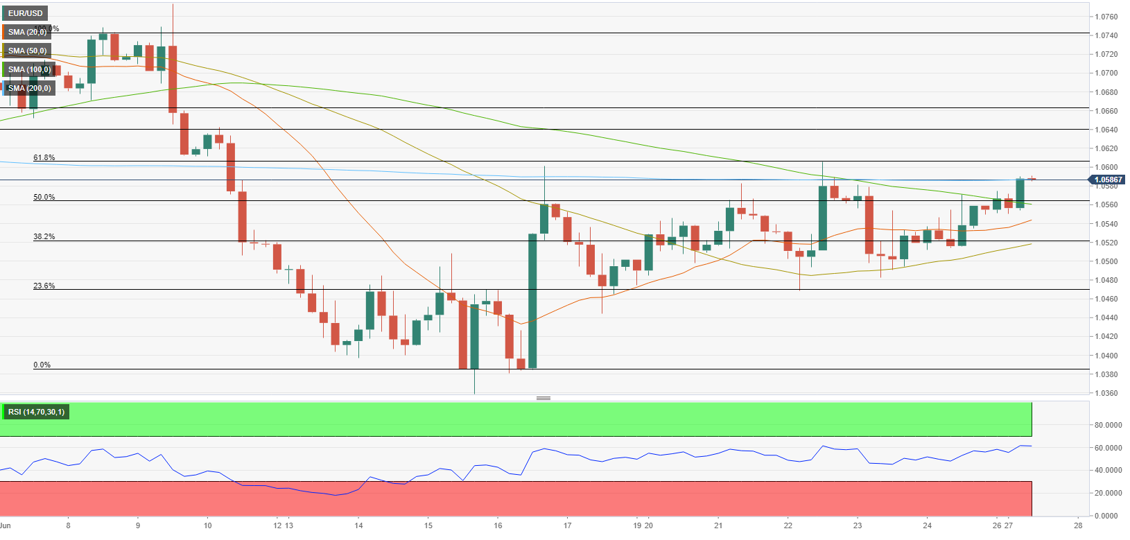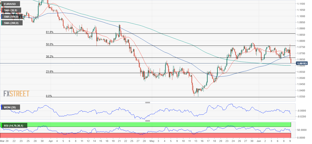 EUR/USD mundur dari level tertinggi intraday di dalam pola grafik bullish. Sinyal MACD bullish, posisi terendah lebih tinggi yang terlihat sejak 13 Mei mendukung pembeli. HMA-50, garis atas dari wedge menjaga kenaikan jangka dekat, penjual dapat mengincar level terendah tahunan. EUR/USD tetap tertekan di sekitar 1,0425-30, memudarkan pemantulan Jumat lalu dari level terendah dua pekan di dalam formasi grafik bullish falling wedge. Pasangan mata uang utama tidak hanya mundur dari garis atas irisan yang dinyatakan tetapi juga mundur dari SMA 50. Namun, MACD bullish menandakan posisi terendah yang terlihat sejak 13 Mei membuat pembeli tetap berharap. Namun, sentimen intraday mengisyaratkan penurunan lebih lanjut menuju level acuan 1,0400. Setelah itu, garis support wedge tersebut, di sekitar 1,0355 dan level terendah tahunan 1,0349, yang terlihat pada bulan Mei, akan menjadi penting untuk diperhatikan oleh penjual. Jika EUR/USD turun di bawah 1,0349, dasar Januari 2017 di 1,0340 dapat bertindak sebagai poin validasi untuk penurunan lebih lanjut ke selatan. Sebagai alternatif, pembeli perlu menembus HMA-50 dan garis atas wedge, di sekitar 1,0445, untuk mengambil kembali kendali. Meski begitu, level HMA-200 di sekitar 1,0515 dapat bertindak sebagai filter tambahan ke utara sebelum mengarahkan pergerakan ke utara menuju tertinggi akhir Juni di dekat 1,0615. EUR/USD: Grafik per jam Tren: Diperkirakan pullback korektif Level Teknis EUR/USD Tinjauan Harga terakhir hari ini 1.0426 Perubahan harian hari ini -4 Perubahan harian hari ini % -0.04 Pembukaan harian hari ini 1.043 Tren SMA 20 Harian 1.0536 SMA 50 Harian 1.0572 SMA 100 Harian 1.0802 SMA 200 Harian 1.1108 Level Tinggi Harian Sebelumnya 1.0486 Rendah Harian Sebelumnya 1.0366 Tinggi Mingguan Sebelumnya 1.0615 Rendah Mingguan Sebelumnya 1.0366 Tinggi Bulanan Sebelumnya 1.0774 Rendah Bulanan Sebelumnya 1.0359 Fibonacci Harian 38,2% 1.0412 Fibonacci Harian 61,8% 1.044 Pivot Point Harian S1 1.0368 Pivot Point Harian S2 1.0307 Pivot Point Harian S3 1.0248 Pivot Point Harian R1 1.0488 Pivot Point Harian R2 1.0547 Pivot Point Harian R3 1.0608