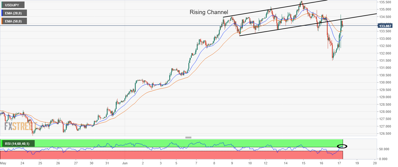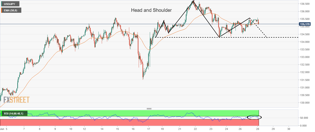 USD/JPY telah tergelincir tajam mendekati 135,10 karena DXY telah menunjukkan kinerja yang lemah. Percepatan peluang tingkat inflasi yang lebih tinggi di Jepang mendukung kenaikan Yen. Dalam sesi hari ini, notulen FOMC dan data Jasa ISM AS akan tetap menjadi fokus. Pasangan USD/JPY telah menyaksikan penurunan tajam setelah menyerahkan support penting 135,53 di sesi Asia. Aset ini telah jatuh ke dekat 135,14 karena Indeks Dolar AS (DXY) telah memperpanjang koreksi setelah menembus 106,46. Perjalanan yang bergelombang diperkirakan akan terjadi pada aset karena DXY dapat terkoreksi lebih lanjut menjelang risalah Komite Pasar Terbuka Federal (FOMC) pada hari Rabu. Risalah rapat kebijakan moneter bulan Juni akan mengungkap ideologi di balik pengumuman kenaikan suku bunga 75 basis poin (bp) oleh Federal Reserve (Fed). Selain itu, notulen tersebut akan menampilkan situasi indikator makroekonomi, yang akan menggambarkan kondisi ekonomi AS saat ini. Terlepas dari notulen FOMC, investor akan mengawasi data Jasa ISM AS. Kinerja beragam diperkirakan dari para pelaku pasar karena perkiraan awal untuk Indeks Harga Jasa Dibayar dan Pesanan Baru tinggi sementara untuk IMP Jasa dan Indeks Ketenagakerjaan rendah. IMP Jasa yang penting terlihat di 54,5, lebih rendah dari rilis sebelumnya sebesar 55,9. Di Tokyo, pembeli Yen telah menguat karena meningkatnya ekspektasi untuk tekanan harga yang lebih tinggi. Seisaku Kameda, mantan kepala ekonom di Bank of Japan (BoJ) mengatakan bahwa penurunan tajam yen dengan catatan yang lebih luas akan mengangkat prospek inflasi. Tingkat inflasi mungkin tetap jauh di atas 2% tahun ini. Level Teknis USD/JPY Tinjauan Harga terakhir hari ini 135.27 Perubahan harian hari ini -51 Perubahan harian hari ini % -0.38 Pembukaan harian hari ini 135.78 Tren SMA 20 Harian 135.13 SMA 50 Harian 131.61 SMA 100 Harian 126.12 SMA 200 Harian 120.11 Level Tinggi Harian Sebelumnya 136.36 Rendah Harian Sebelumnya 135.52 Tinggi Mingguan Sebelumnya 137 Rendah Mingguan Sebelumnya 134.52 Tinggi Bulanan Sebelumnya 137 Rendah Bulanan Sebelumnya 128.65 Fibonacci Harian 38,2% 136.04 Fibonacci Harian 61,8% 135.84 Pivot Point Harian S1 135.41 Pivot Point Harian S2 135.04 Pivot Point Harian S3 134.57 Pivot Point Harian R1 136.25 Pivot Point Harian R2 136.73 Pivot Point Harian R3 137.09
