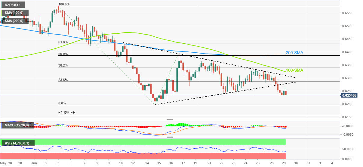 NZD/USD memangkas penurunan baru-baru ini di level terendah 26 bulan, naik 0,80% di sekitar 0,6210 menjelang sesi Eropa hari ini, karena Dolar AS mundur dari puncak dua pekan di tengah liburan AS. Pasangan NZD/USD mengabaikan sinyal bearish dari pasar opsi karena penjual beristirahat menjelang data/peristiwa penting AS. Meskipun demikian, pembalikan risiko (RR) NZD/USD, spread antara opsi call dan opsi put, turun paling banyak dalam tiga pekan pada hari sebelumnya, menjadi -0,260, setelah IMP Manufaktur ISM AS mendorong kekhawatiran resesi. RR harian cukup sengit untuk menenggelamkan angka mingguan kembali mendukung penjual. Mengingat kurangnya data/peristiwa besar dan hari libur AS, NZD/USD dapat mengkonsolidasi pergerakan turun terbaru menjelang Notulen Komite Pasar Terbuka Federal (FOMC) dan laporan Pekerjaan AS untuk bulan Juni.