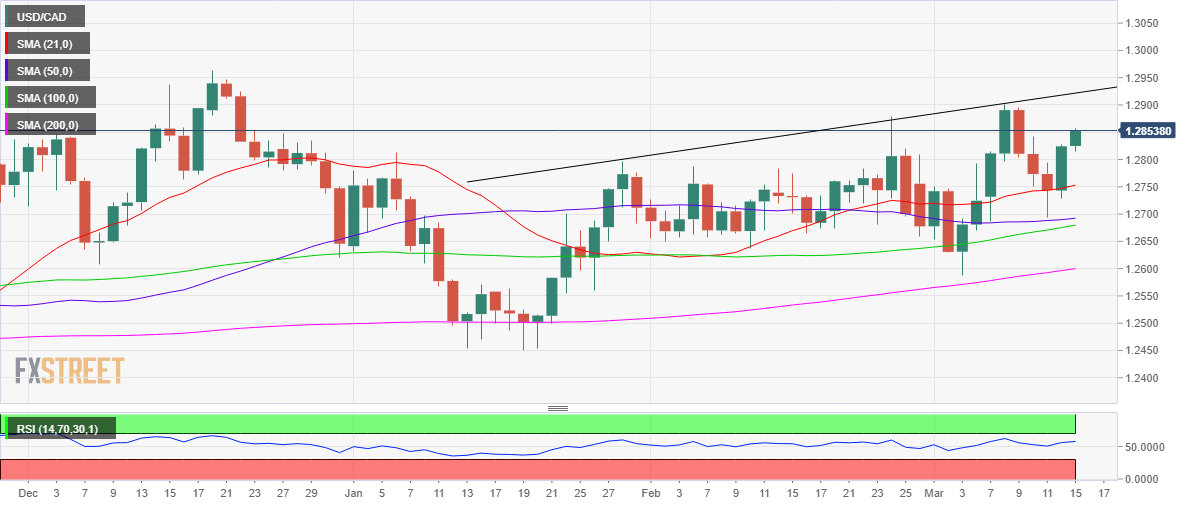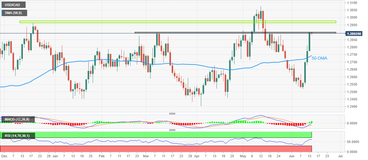 USD/CAD bergerak di sekitar resistensi horizontal tiga bulan, menghentikan tren naik empat hari. MACD bullish dan tidak adanya RSI overbought mendukung kenaikan lebih lanjut. Area resistensi horizontal dari akhir 2021 bertindak sebagai rintangan sisi atas tambahan, penjual perlu validasi dari DMA-50 untuk mengambil entri. Kenaikan USD/CAD beristirahat di sekitar tertinggi bulanan, bergerak ke 1,2900 karena resistensi kunci jangka pendek membatasi kenaikan lebih lanjut selama sesi Asia hari ini. Meski begitu, sinyal MACD bullish dan tidak adanya RSI (14) overbought mengisyaratkan kapasitas untuk melewati rintangan terdekat, yaitu area yang terdiri dari beberapa level yang terlihatt sejak Maret, di sekitar 1,2900. Namun, perlu dicatat bahwa RSI dapat berbalik overbought melewati 1,2900, yang pada gilirannya menyoroti 1,2965-75 sebagai zona resistance kunci. Jika sama sekali kenaikan USD/CAD berhasil melewati rintangan 1,2975, magnet psikologis 1,3000 dan tertinggi tahunan di 1,3076 harus kembali ke grafik. Sebaliknya, pergerakan pullback tetap sulit dipahami sampai harga tetap berada di luar level DMA-50 di 1,2743. Setelah itu, angka bulat 1,2700 dan swing high pertengahan April di dekat 1,2675 dapat menarik perhatian bearish USD/CAD. USD/CAD: Grafik harian Tren: Kenaikan lebih lanjut diharapkan Level Teknis USD/CAD Tinjauan Harga terakhir hari ini 1.2894 Perubahan harian hari ini -5 Perubahan harian hari ini % -0.04 Pembukaan harian hari ini 1.2899 Tren SMA 20 Harian 1.2722 SMA 50 Harian 1.2736 SMA 100 Harian 1.2707 SMA 200 Harian 1.2665 Level Tinggi Harian Sebelumnya 1.29 Rendah Harian Sebelumnya 1.2774 Tinggi Mingguan Sebelumnya 1.2813 Rendah Mingguan Sebelumnya 1.2518 Tinggi Bulanan Sebelumnya 1.3077 Rendah Bulanan Sebelumnya 1.2629 Fibonacci Harian 38,2% 1.2852 Fibonacci Harian 61,8% 1.2822 Pivot Point Harian S1 1.2815 Pivot Point Harian S2 1.2731 Pivot Point Harian S3 1.2689 Pivot Point Harian R1 1.2941 Pivot Point Harian R2 1.2984 Pivot Point Harian R3 1.3068