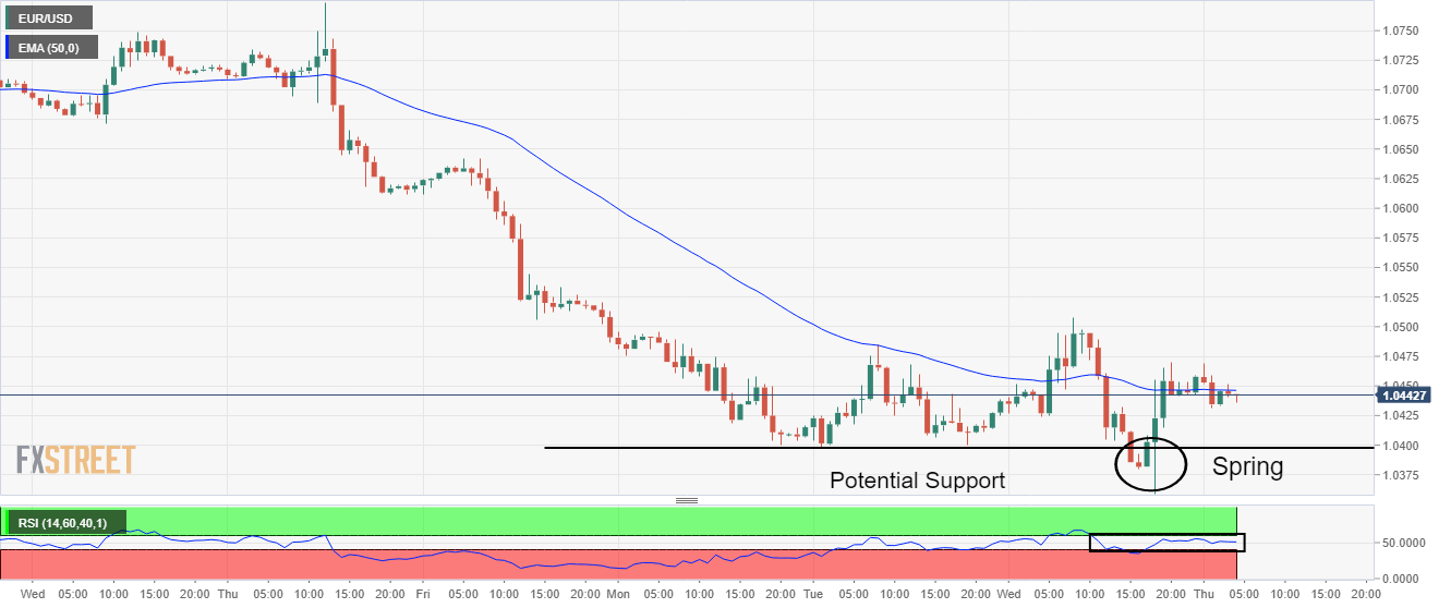 EUR/USD berosilasi di bawah 1,0450 karena para investor menunggu HICP Zona Euro. Inflasi Zona Euro diperkirakan akan tetap tidak berubah pada 8,1% secara tahunan. Inflasi AS yang optimis pekan lalu yang memaksa The Fed untuk mendikte kenaikan suku bunga 75 bp. Pasangan EUR/USD mengalami barikade di sekitar 1,0450 karena indeks dolar AS (DXY) telah berbalik sideways setelah bergerak mundur dari 104,66. Para pembeli mata uang bersama menyaksikan aksi beli responsif setelah mencapai level terendah 1,0370 pada hari Rabu. Aksi beli responsif tercatat setelah pengumuman kenaikan bumper rate oleh Federal Reserve (The Fed). The Fed menaikkan suku bunganya sebesar 75 basis poin (bp), lebih tinggi dari konsensus 50 bp. Perlu dicatat bahwa rilis inflasi AS yang optimis minggu lalu telah mendorong roda konsensus menjadi 75 bp karena data inflasi 8,6% menuntut tanggapan cepat dari pemerintah. Pengumuman kenaikan suku bunga membawa aksi jual ekstrim di DXY. DXY mencoba penembusan di atas resistance psikologis 105,00 tetapi kemungkinan akan bertemu dengan penawaran jual signifikan oleh para penjual inisiatif. Ke depan, aset tersebut akan didorong oleh Indeks Harga Konsumen Zona Euro (HICP), yang akan dirilis pada hari Jumat. Angka HICP tahunan diperkirakan akan tetap stabil di 8,1%. Juga, HICP inti yang mengecualikan makanan, energi, alkohol dan tembakau terlihat tidak berubah pada 3,8%. Analisis Teknis EUR/USD Aset tersebut telah berkembang di dekat support potensialnya di 1,0397 pada skala per jam, yang mewakili dorongan beli. Dorongan pembelian adalah tindakan pembelian responsif, yang terjadi ketika investor menemukan aset sebagai taruhan nilai. Exponential Moving Average (EMA) 50 periode tumpang tindih dengan harga aset tersebut, yang menandakan konsolidasi ke depan. Sementara itu, Relative Strength Index (RSI) (14) telah bergeser ke 40,00-60,00, yang menambah penghalang konsolidasi. Grafik Per Jam EUR/USD Level-Level Teknis EUR/USD Tinjauan Harga terakhir hari ini 1.044 Perubahan harian hari ini -0.0002 Perubahan harian hari ini % -0.02 Pembukaan harian hari ini 1.0442 Tren SMA 20 Harian 1.0643 SMA 50 Harian 1.0649 SMA 100 Harian 1.09 SMA 200 Harian 1.1183 Level Tinggi Harian Sebelumnya 1.0508 Rendah Harian Sebelumnya 1.0359 Tinggi Mingguan Sebelumnya 1.0774 Rendah Mingguan Sebelumnya 1.0506 Tinggi Bulanan Sebelumnya 1.0787 Rendah Bulanan Sebelumnya 1.035 Fibonacci Harian 38,2% 1.0451 Fibonacci Harian 61,8% 1.0416 Pivot Point Harian S1 1.0365 Pivot Point Harian S2 1.0288 Pivot Point Harian S3 1.0216 Pivot Point Harian R1 1.0514 Pivot Point Harian R2 1.0586 Pivot Point Harian R3 1.0663