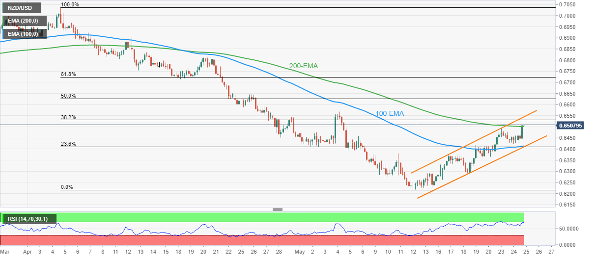 USD/CAD naik lebih tinggi setelah memantul dari level terendah enam pekan, melawan rintangan horizontal utama. RSI dan sinyal MACD lebih lanjut naik tetapi garis resistensi jangka pendek dan SMA-200 akan menguji kenaikan. Garis support naik dua bulan memegang gerbang untuk masuknya penjual. USD/CAD mencetak kenaikan ringan di sekitar 1,2670 karena pembeli bertarung dengan resistensi horizontal yang hampir dua bulan selama sesi Asia akhir hari ini. Pasangan CAD memperpanjang rebound hari sebelumnya dari garis tren miring ke atas dari awal April, yang pada gilirannya memicu pemantulan dari level terendah enam pekan. Mengingat pemantulan berkelanjutan dari garis support kunci jangka pendek, serta sinyal MACD bullish dan RSI (14) yang lebih kuat, harga USD/CAD kemungkinan akan mempertahankan pergerakan pemulihan terbaru. Namun, membutuhkan terobosan dari wilayah 1,2670-85, yang terdiri dari resistensi horizontal yang disebutkan di atas, untuk naik lebih jauh. Setelah itu, garis tren miring ke bawah dari 12 Mei dan level SMA-200, masing-masing di dekat 1,2770 dan 1,2800, akan menantang kenaikan USD/CAD. Sebaliknya, garis support yang dinyatakan sebelumnya, di dekat 1,2600 pada saat ini, membatasi penurunan terdekat. Jika harga USD/CAD turun di bawah 1,2600, kemerosotan menuju swing low akhir April di dekat 1,2460 tidak dapat dikesampingkan. USD/CAD: Grafik empat jam Tren: Pemulihan lebih lanjut diharapkan Level Teknis USD/CAD Tinjauan Harga terakhir hari ini 1.267 Perubahan harian hari ini 14 Perubahan harian hari ini % 0.11 Pembukaan harian hari ini 1.2656 Tren SMA 20 Harian 1.284 SMA 50 Harian 1.2712 SMA 100 Harian 1.2699 SMA 200 Harian 1.2663 Level Tinggi Harian Sebelumnya 1.2677 Rendah Harian Sebelumnya 1.2607 Tinggi Mingguan Sebelumnya 1.2885 Rendah Mingguan Sebelumnya 1.2718 Tinggi Bulanan Sebelumnya 1.3077 Rendah Bulanan Sebelumnya 1.2629 Fibonacci Harian 38,2% 1.265 Fibonacci Harian 61,8% 1.2634 Pivot Point Harian S1 1.2616 Pivot Point Harian S2 1.2576 Pivot Point Harian S3 1.2546 Pivot Point Harian R1 1.2687 Pivot Point Harian R2 1.2717 Pivot Point Harian R3 1.2757