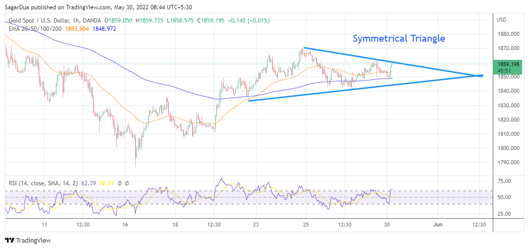 Harga emas berosilasi di sekitar $1.860,00 di tengah penurunan DXY yang lebih luas. Pelaku pasar membuang DXY pada perkiraan NFP AS yang lebih rendah. Pembentukan Segitiga Simetris menunjukkan akan ada langkah konsolidasi. Harga emas (XAU/USD) telah menyaksikan rebound yang kuat setelah gagal bertahan di bawah level support bulat di $1.850,00 di awal Tokyo. Logam mulia ini telah menyentuh tertinggi intraday di $1.860,25 dan diperkirakan akan menyentuh tertinggi hari ini karena peningkatan selera risiko pelaku pasar telah mengurangi daya tarik Indeks Dolar AS (DXY). Penurunan DXY mungkin tepengaruh oleh perkiraan Nonfarm Payrolls (NFP) AS yang lebih rendah, yang akan dirilis akhir pekan ini. Perkiraan awal untuk NFP AS adalah 310.000 sedangkan angka sebelumnya 428.000 bulan lalu. Ini menentukan ekspektasi penurunan lebih dari 27% dalam jumlah penambahan pekerjaan oleh ekonomi AS. Penurunan data penciptaan lapangan kerja tambahan dapat memangkas tingkat hawkishness dalam sikap Federal Reserve (Fed) dalam kebijakan moneter Juni. Dan, pada akhirnya, itu akan menopang harga emas. Selain itu, kalender ekonomi AS menawarkan rilis data IMP Manufaktur ISM, yang mungkin tergelincir ke 54,5 dibandingkan angka sebelumnya di 55,4. Analisis teknis emas Pembentukan Segitiga Simetris pada grafik per jam menunjukkan penurunan dalam volatilitas, yang akan diikuti oleh terobosan. Harga emas diperkirakan akan menembus sisi atas di tengah persilangan emas Exponential Moving Averages (EMA) periode 50 dan 200 di $1.837,42. Relative Strength Index (RSI) (14) berosilasi dalam kisaran 40,00-60.00, yang menunjukkan akan ada konsolidasi. Grafik per jam emas