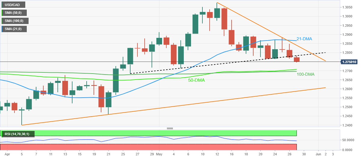 USD/CAD mengambil penawaran jual untuk menyegarkan harga terendah bulanan, turun untuk hari keempat berturut-turut. Support horisontal berusia enam minggu, penjual uji kondisi RSI yang oversold. Pembeli membutuhkan validasi dari SMA-200 untuk entri baru. USD/CAD goyah saat memperbarui level terendah satu bulan di dekat 1,2700 menuju sesi Eropa hari Senin. Dengan melakukan itu, pasangan Loonie turun untuk hari keempat berturut-turut sambil memperpanjang jeda penurunan minggu sebelumnya dari SMA-200. Namun, area horisontal yang terdiri dari level yang ditandai sejak pertengahan April dapat bergabung dengan kondisi RSI oversold untuk menantang penurunan USD/CAD di sekitar 1,2680. Setelah itu, garis support miring ke atas berusia dua bulan di dekat 1,2585 akan menantang penjual pasangan. Atau, kemunduran korektif perlu melewati level SMA-200 di dekat 1,2800 untuk menarik kembali pembeli. Meski begitu, swing low 11 Mei di sekitar 1,2920 dapat menantang kenaikan USD/CAD sebelum tertinggi bulanan di 1,3076. USD/CAD: Grafik empat jam Tren: Penurunan terbatas diperkirakan