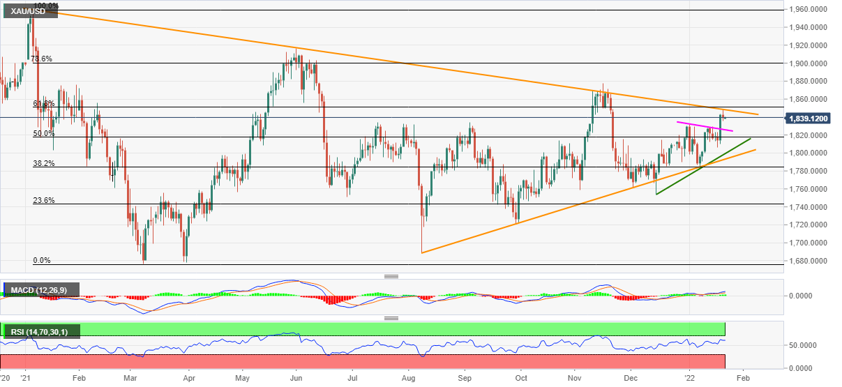 Harga emas mengkonsolidasikan kenaikan baru-baru ini di tengah sesi Asia yang tenang. Kekhawatiran atas inflasi mendukung pullback korektif dolar AS dari level terendah bulanan setelah tren turun dua minggu. Harapan akan data ketenagakerjaan AS yang lebih kuat, hambatan teknis juga menantang para pembeli. Emas (XAU/USD) melakukan pemulihan di sekitar $1.850, menyusul pemulihan dua minggu, karena Indeks Dolar AS (DXY) menghentikan sementara pullback terbaru di tengah sesi Asia yang lesu pada hari Senin. Dengan itu, Indeks Dolar AS (DXY) mencetak kenaikan intraday sebesar 0,05% di sekitar 101,68, memantul dari level terendah bulanan di 101,43 yang dicapai pada hari Jumat, karena pasar menegaskan kembali data AS hari Jumat untuk memperkirakan pergerakan The Fed selanjutnya. Pada hari Jumat, data Pengeluaran Konsumsi Pribadi (PCE) AS datang dalam campuran untuk bulan April, sebagian besar turun, karena Indeks Harga PCE Inti, ukuran inflasi pilihan The Fed, menyamai perkiraan YoY 4,9% dibandingkan 5,2% sebelumnya. Lebih lanjut, Pendapatan Pribadi naik kurang dari yang diharapkan tetapi Pengeluaran Pribadi meningkat. Mengikuti data tersebut, para pedagang bersemangat setelah data campuran dengan terburu-buru menuju aset yang lebih berisiko dan mendorong indeks acuan Wall Street tetapi menjaga imbal hasil obligasi tetap utuh. Perlu dicatat bahwa Kontrak Berjangka S&P 500 mencetak kenaikan tipis tetapi imbal hasil obligasi 10-tahun pemerintah AS tetap tidak berubah pada 2,74% di tengah liburan bank AS. Selanjutnya, kalender yang sepi dan hari libur bank di AS dapat membatasi pergerakan langsung emas. Namun, sejumlah katalis risiko akan penting untuk diwaspadai dorongan baru, yang pada gilirannya menyoroti berita utama dari Rusia dan Tiongkok. Di atas segalanya, laporan lapangan pekerjaan AS minggu ini untuk bulan April juga dapat membantu indeks greenback untuk mengurai pelemahan terbaru, di tengah harapan data yang lebih kuat, yang pada gilirannya dapat membebani harga emas. Analisis Teknis Pullback Emas dari garis support sebelumnya yang berusia dua minggu, di sekitar $1.865 pada saat berita ini ditulis, yang membutuhkan validasi dari pertemuan support $1.845, termasuk SMA 50 dan SMA 100. Dengan itu, MACD memancarkan sinyal bearish sementara RSI tetap melandai, tidak oversold, yang pada gilirannya menunjukkan ruang untuk penurunan lebih lanjut. Emas: Grafik Empat Jam Tren: Diperkirakan akan terjadi kelemahan lebih lanjut