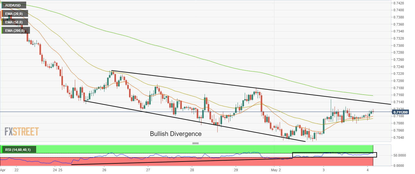 Hilangnya momentum di sekitar 0,7030 telah memicu pembeli responsif. Sebuah bull cross dari EMA 20 dan 50 mendukung bias bullish. Aset ini perlu menembus garis tren yang ditempatkan dari 0,7230 untuk kenaikan lebih lanjut. Pasangan AUD/USD bergerak lebih tinggi secara bertahap tidak seperti aset lain yang diperdagangkan loyo menjelang pertemuan kebijakan moneter Fed. Pasangan ini telah menyaksikan rebound yang lebih kuat setelah mencapai level terendah 0,7033 pada hari Senin dan mengincar Exponential Moving Average (EMA) 200 periode di 0,7159. Hilangnya momentum penurunan mendekati 0,7030 telah memicu pembeli responsif, yang telah mendorong aset lebih tinggi. Kelelahan dalam tren turun terlihat dari formasi Bullish Divergence pada momentum osilator Relative Strength Index (RSI) (14). Kelanjutan posisi terendah yang lebih rendah oleh aset tidak disertai dengan RSI (14), yang menghasilkan pembalikan bullish. Juga, RSI (14) telah bergeser ke kisaran 40,00-60,00 dari kisaran bearish 20,00-40,00, yang memudarkan optimisme pembeli Greenback. Bull cross, yang diwakili oleh EMA 20 dan 50 periode di 0,7086 menambah filter sisi atas. Untuk momentum bullish, aset perlu melampaui garis tren (ditempatkan dari level tertinggi 26 April di 0,7230) di 0,7150 dengan tegas. Ini akan mengirim aset menuju resistensi level bulat di 0,7200, diikuti oleh level terendah 22 April di 0,7234. Di sisi lain, pembeli Greenback bisa mendapatkan kembali kekuatan jika pasangan ini turun di bawah level terendah Senin di 0,7033, yang akan mengirim aset ini menuju support psikologis di 0,7000. Jika ditembus akan menyeret aset ke level terendah 14 Juli 2020 di 0,6921. Grafik per jam AUD/USD Level Teknis AUD/USD Tinjauan Harga terakhir hari ini 0.711 Perubahan harian hari ini 16 Perubahan harian hari ini % 0.23 Pembukaan harian hari ini 0.7094 Tren SMA 20 Harian 0.7306 SMA 50 Harian 0.7346 SMA 100 Harian 0.7261 SMA 200 Harian 0.7285 Level Tinggi Harian Sebelumnya 0.7148 Rendah Harian Sebelumnya 0.7046 Tinggi Mingguan Sebelumnya 0.7257 Rendah Mingguan Sebelumnya 0.7054 Tinggi Bulanan Sebelumnya 0.7662 Rendah Bulanan Sebelumnya 0.7054 Fibonacci Harian 38,2% 0.7109 Fibonacci Harian 61,8% 0.7085 Pivot Point Harian S1 0.7044 Pivot Point Harian S2 0.6994 Pivot Point Harian S3 0.6942 Pivot Point Harian R1 0.7146 Pivot Point Harian R2 0.7198 Pivot Point Harian R3 0.7248