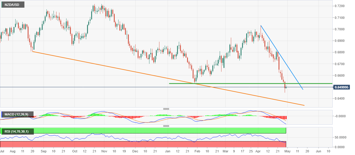 NZD/USD pulih dari terendah dua tahun sehingga menghentikan tren turun enam hari. RSI yang oversold mendukung pergerakan pemulihan yang menargetkan terendah Januari. Garis resistance tiga minggu menambah penghalang ke sisi atas, para penjual bertujuan ke garis support menurun mulai Agustus 2021. NZD/USD mundur dari tertinggi intraday karena menembus level 0,6500 selama sesi Asia hari Jumat. Meski begitu, pasangan kiwi ini mencetak kenaikan harian pertama, naik 0,20% pada saat berita ini dimuat, dalam enam hari sambil memantul dari level terendah sejak Juni 2020. Meskipun kondisi RSI yang oversold tampaknya telah memicu pemulihan terbaru, harga tetap di bawah terendah sebelumnya dari tahun 2022, yang dicatat pada bulan Januari, yang pada gilirannya membuat para penjual tetap optimis. Selain rintangan 0,6530, garis tren menurun dari 5 April juga menantang para pembeli NZD/USD, paling lambat di sekitar 0,6700. Sementara itu, penurunan baru pada awalnya akan mengarah ke terendah terbaru di sekitar 0,6450 menjelang level acuan 0,6400. Jika para penjual NZD/USD mempertahankan kendali melewati 0,6400, posisi terendah yang dicatat selama Juni 2020, di sekitar 0,6380, serta garis support delapan bulan di dekat 0,6370, akan ada dalam pantauan mereka. Secara keseluruhan, NZD/USD tetap dalam radar para penjual meskipun ada langkah pemulihan terbaru. NZD/USD: Grafik Harian Level-Level Teknis NZD/USD Tinjauan Harga terakhir hari ini 0.65 Perubahan harian hari ini 0.0010 Perubahan harian hari ini % 0.15 Pembukaan harian hari ini 0.649 Tren SMA 20 Harian 0.6772 SMA 50 Harian 0.6812 SMA 100 Harian 0.6772 SMA 200 Harian 0.6889 Level Tinggi Harian Sebelumnya 0.6551 Rendah Harian Sebelumnya 0.6452 Tinggi Mingguan Sebelumnya 0.6814 Rendah Mingguan Sebelumnya 0.6625 Tinggi Bulanan Sebelumnya 0.6999 Rendah Bulanan Sebelumnya 0.6728 Fibonacci Harian 38,2% 0.649 Fibonacci Harian 61,8% 0.6513 Pivot Point Harian S1 0.6444 Pivot Point Harian S2 0.6399 Pivot Point Harian S3 0.6345 Pivot Point Harian R1 0.6543 Pivot Point Harian R2 0.6597 Pivot Point Harian R3 0.6642