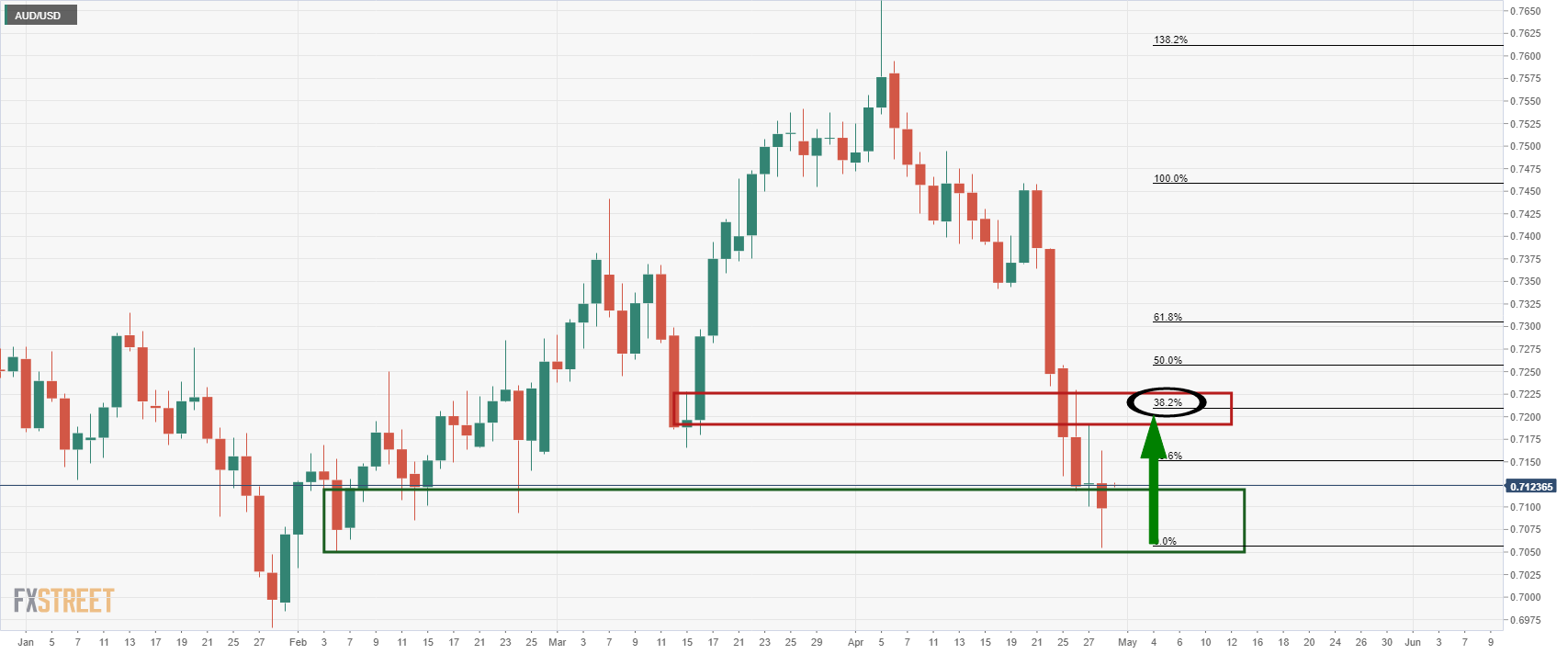 Para pembeli AUD/USD bergerak masuk dan Fibo 38,2% dari impuls bearish harian diamati. Dolar AS telah bergerak ke dalam konsolidasi dan The Fed ada dalam agenda. AUD/USD bergerak ke fase konsolidasi menyusul volatilitas di Forex minggu ini dan dolar AS yang merajalela yang mencapai tertinggi 20 tahun pada hari Kamis: (DXY, grafik 1 Jam) Dolar AS dapat mengalami beberapa konsolidasi dan tembusnya garis tren dapat mengakibatkan koreksi yang signifikan dalam beberapa hari mendatang. Bank of Japan adalah halangan terakhir bagi pasar dan para pedagang sekarang mulai mengambil keuntungan dari meja ke akhir pekan dan akhir bulan. Katalis berikutnya kemungkinan adalah Federal Reserve sehingga mungkin ada ketenangan sebelum badai dan kelegaan untuk AUD beta yang tinggi. Berikut ini menggambarkan prospek koreksi signifikan jika tidak sedikit mengambang bagi para pembeli dengan mempertimbangkan struktur pasar pada grafik harian dan skala Fibonacci: Grafik Harian AUD/USD Seperti yang terlihat, harga berada di zona permintaan dan ini menghasilkan fase akumulasi yang dapat membuat harga baru-baru ini kembali menguji posisi terendah sebelumnya dalam beberapa hari mendatang. Grafik 1 Jam AUD/USD Dari perspektif per jam, skema akan dipantau oleh para pembeli untuk struktur bullish dari mana entri optimal untuk menargetkan lebih tinggi dapat muncul dengan sendirinya di musim mendatang: