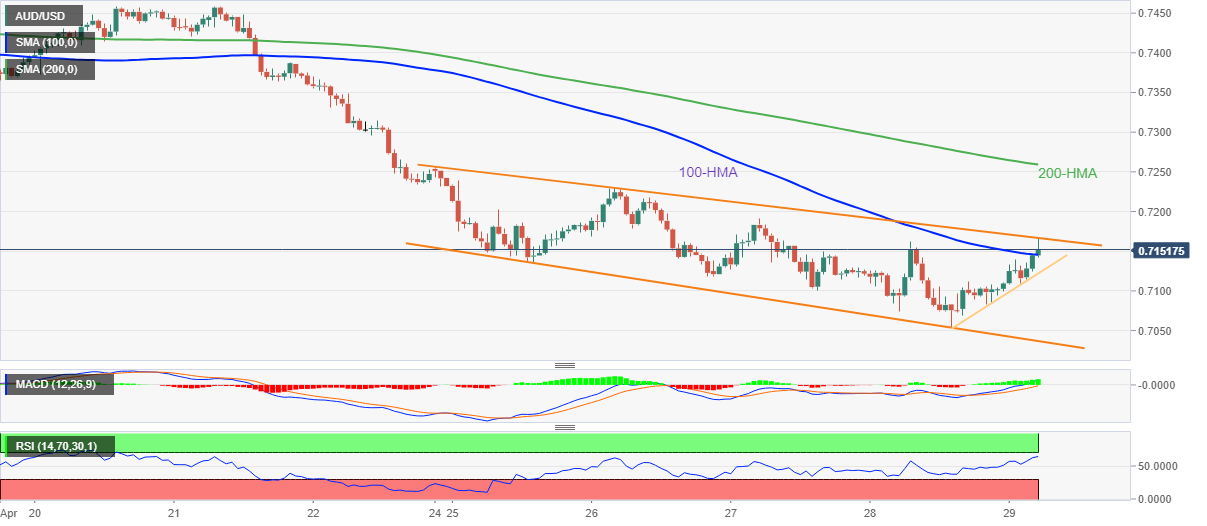 AUD/USD naik-turun di sekitar tinggi intraday, pulih dari terendah dua bulan. Kenaikan lebih lanjut tetap dipertanyakan karena HMA-200 juga menantang pembeli. Garis support jangka pendek memegang kendali untuk penurunan lebih lanjut. AUD/USD bergerak ke 0,7150 sambil berjuang untuk mempertahankan kenaikan harian menjelang sesi Eropa hari Jumat. Dengan demikian, pasangan Aussie mempertahankan pemulihan dari rendah dua bulan, seperti yang digambarkan oleh garis tren naik langsung. Namun, HMA-100 dan garis resistance turun satu minggu, masing-masing di sekitar 0,7150 dan 0,7165, menantang rebound harga. Bahkan jika harga AUD/USD reli melampaui 0,7165, level acuan 0,7200 dan level HMA-200 di 0,7260 akan bertindak sebagai filter sisi atas tambahan untuk menantang pemulihan lebih lanjut. Di sisi lain, pergerakan mundur mungkin awalnya menguji garis support yang disebutkan di atas dari terendah multi-hari terbaru, dekat 0,7130 pada saat berita ini dimuat. Setelah itu, angka bulat 0,7100 dan garis tren menurun dari 25 April, mendekati 0,7030, dapat menguji penjual AUD/USD. Perlu diperhatikan, bagaimanapun, bahwa penurunan pasangan melewati 0,7030 akan membuatnya rentan terhadap penurunan menuju rendah Januari di sekitar 0,6965. AUD/USD: Grafik per jam Tren: Pullback diharapkan Level penting tambahan Tinjauan Harga terakhir hari ini 0.7151 Perubahan harian hari ini 0.0053 Perubahan harian hari ini % 0.75 Pembukaan harian hari ini 0.7098 Tren SMA 20 Harian 0.7377 SMA 50 Harian 0.7354 SMA 100 Harian 0.7263 SMA 200 Harian 0.729 Level Tinggi Harian Sebelumnya 0.7162 Rendah Harian Sebelumnya 0.7054 Tinggi Mingguan Sebelumnya 0.7459 Rendah Mingguan Sebelumnya 0.7234 Tinggi Bulanan Sebelumnya 0.7541 Rendah Bulanan Sebelumnya 0.7165 Fibonacci Harian 38,2% 0.7096 Fibonacci Harian 61,8% 0.7121 Pivot Point Harian S1 0.7048 Pivot Point Harian S2 0.6997 Pivot Point Harian S3 0.694 Pivot Point Harian R1 0.7156 Pivot Point Harian R2 0.7213 Pivot Point Harian R3 0.7263