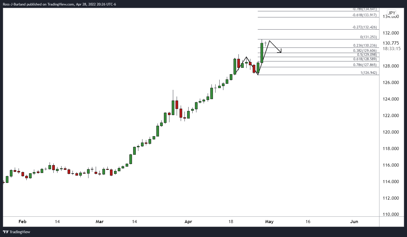 Penjual USD/JPY bergerak masuk dan formasi W harian menarik. Pembeli, bagaimanapun, mungkin hanya koreksi. USD/JPY kemungkinan akan mengalami koreksi, tetapi itu tidak berarti bahwa rally bulanan tidak dapat berlanjut pada waktunya. Melihat kembali grafik bulanan, meskipun jauh ke masa lalu, pada tahun 1998, yen menguat selama tiga bulan berturut-turut dan mencatat kenaikan sekitar 24% dari saat USD/JPY turun dari 147,67 ke 111,88: (Grafik bulanan USD/JPY) Sementara itu, grafik DXY dapat dianggap bergerak ke fase distribusi sementara itu, yang umum menjelang peristiwa besar seperti Federal reserve dan Nonfarm Payrolls pada akhir bulan: (Grafik DXY H1 ) Ini meninggalkan ruang untuk koreksi sementara di USD/JPY: Grafik harian telah melukis formasi W yang merupakan pola pengembalian dan harga akan diharapkan untuk kembali ke garis leher, dekat tingkat pengembalian rata-rata 50% di sekitar level 129.